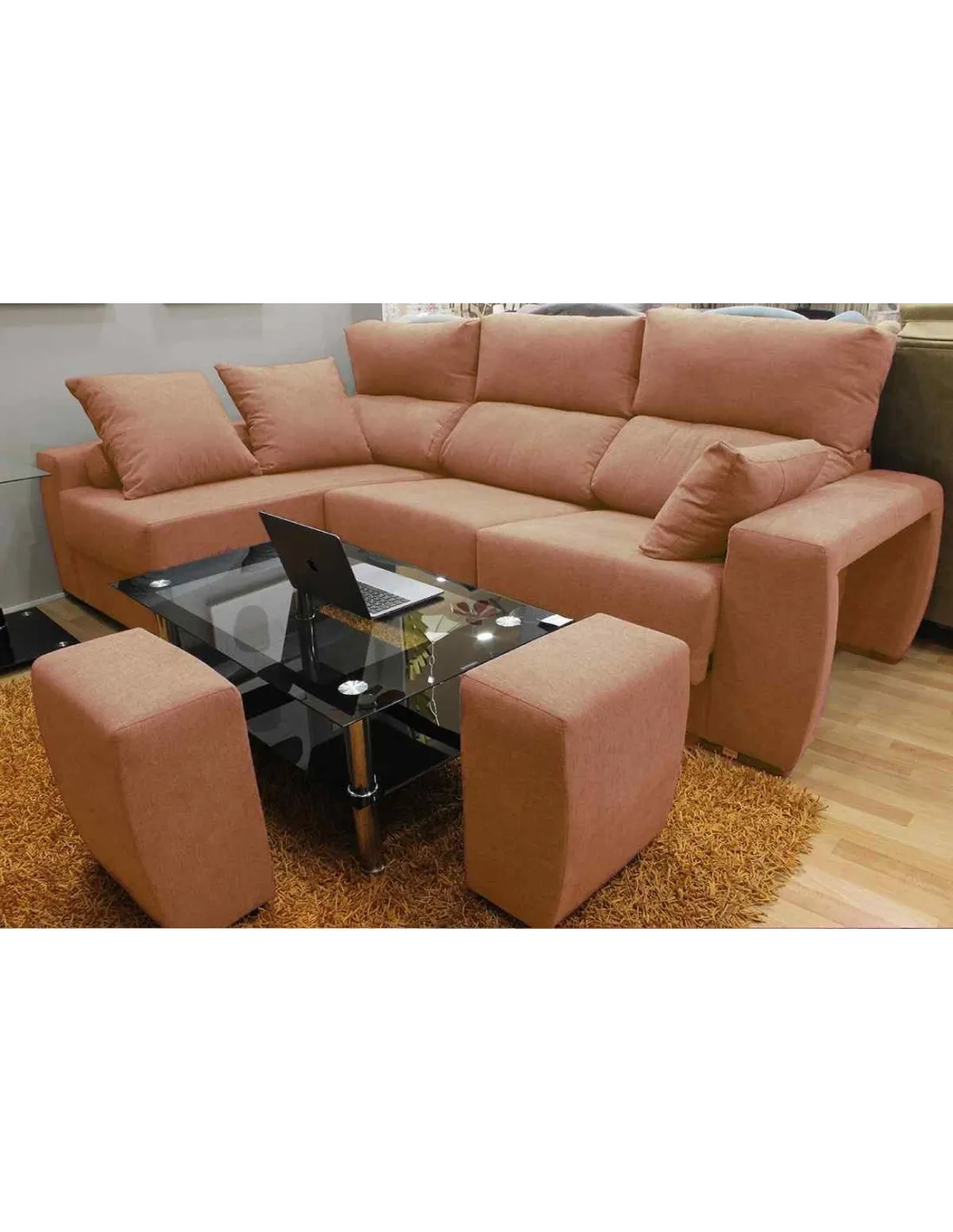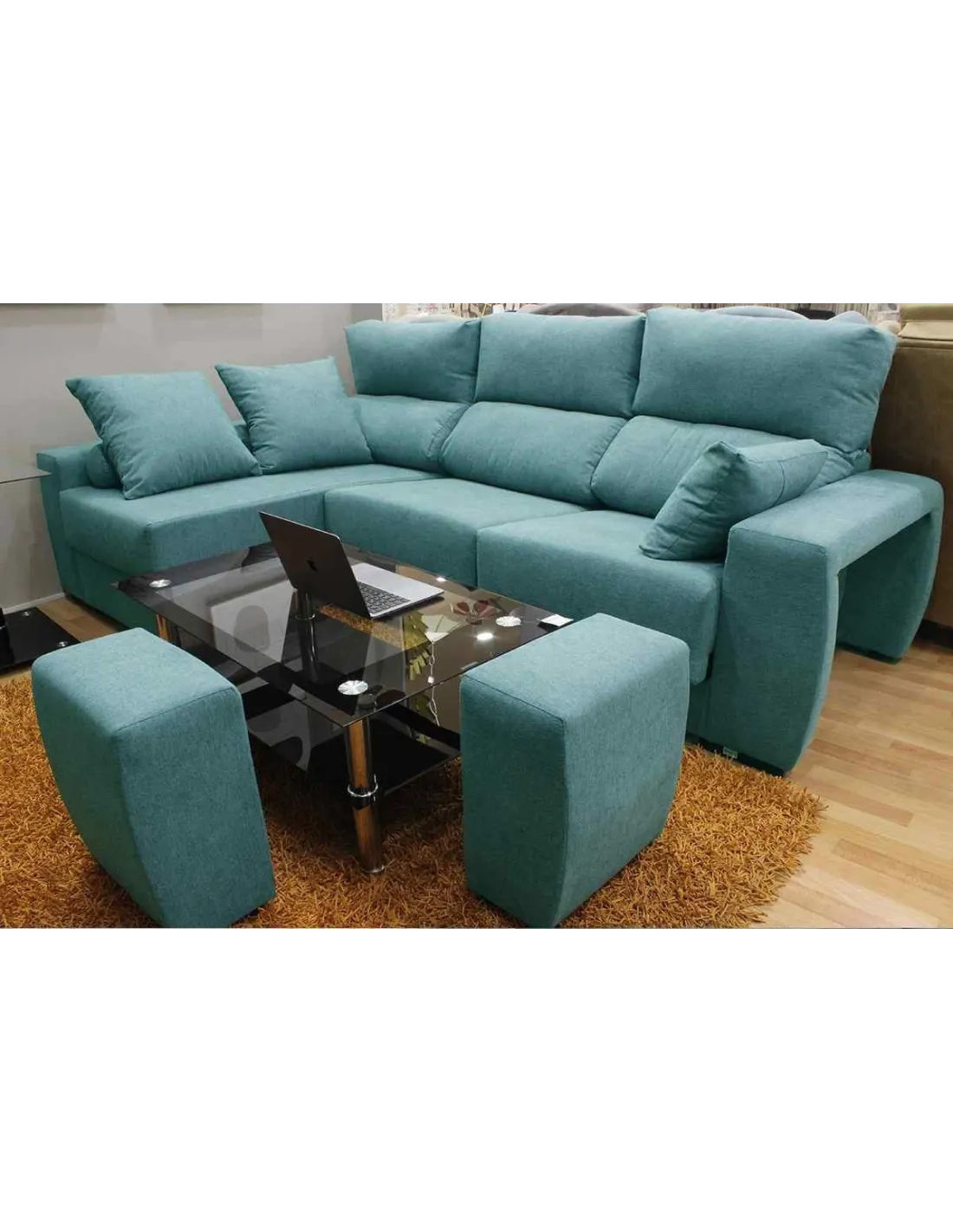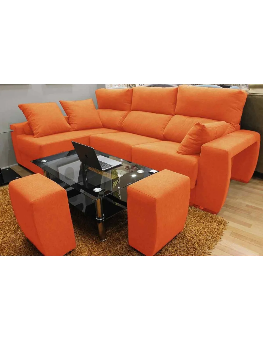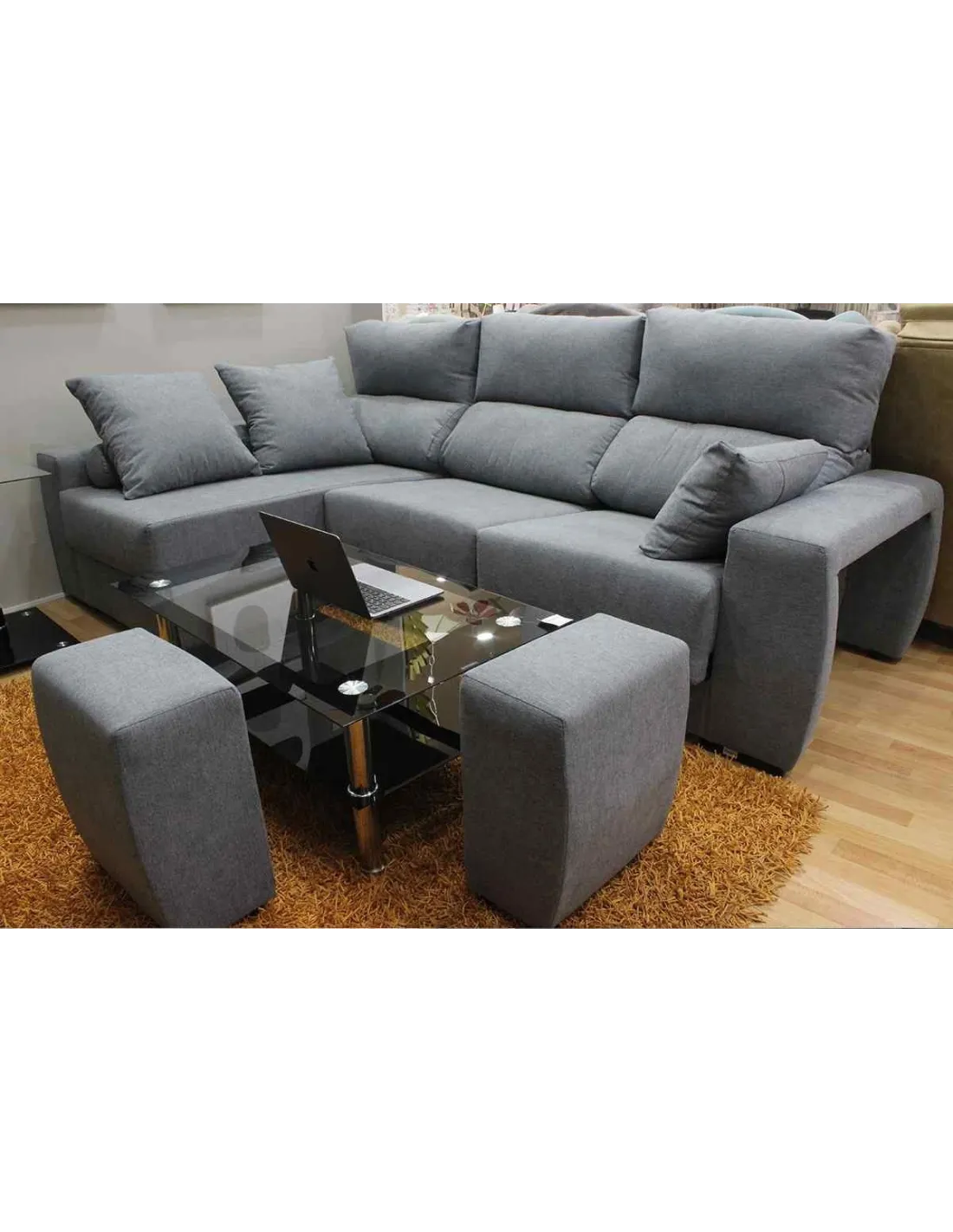 Pufs escondidos en el brazo, aumentando el numeró de plazas o pudiendo utilizarlo como reposapiés.