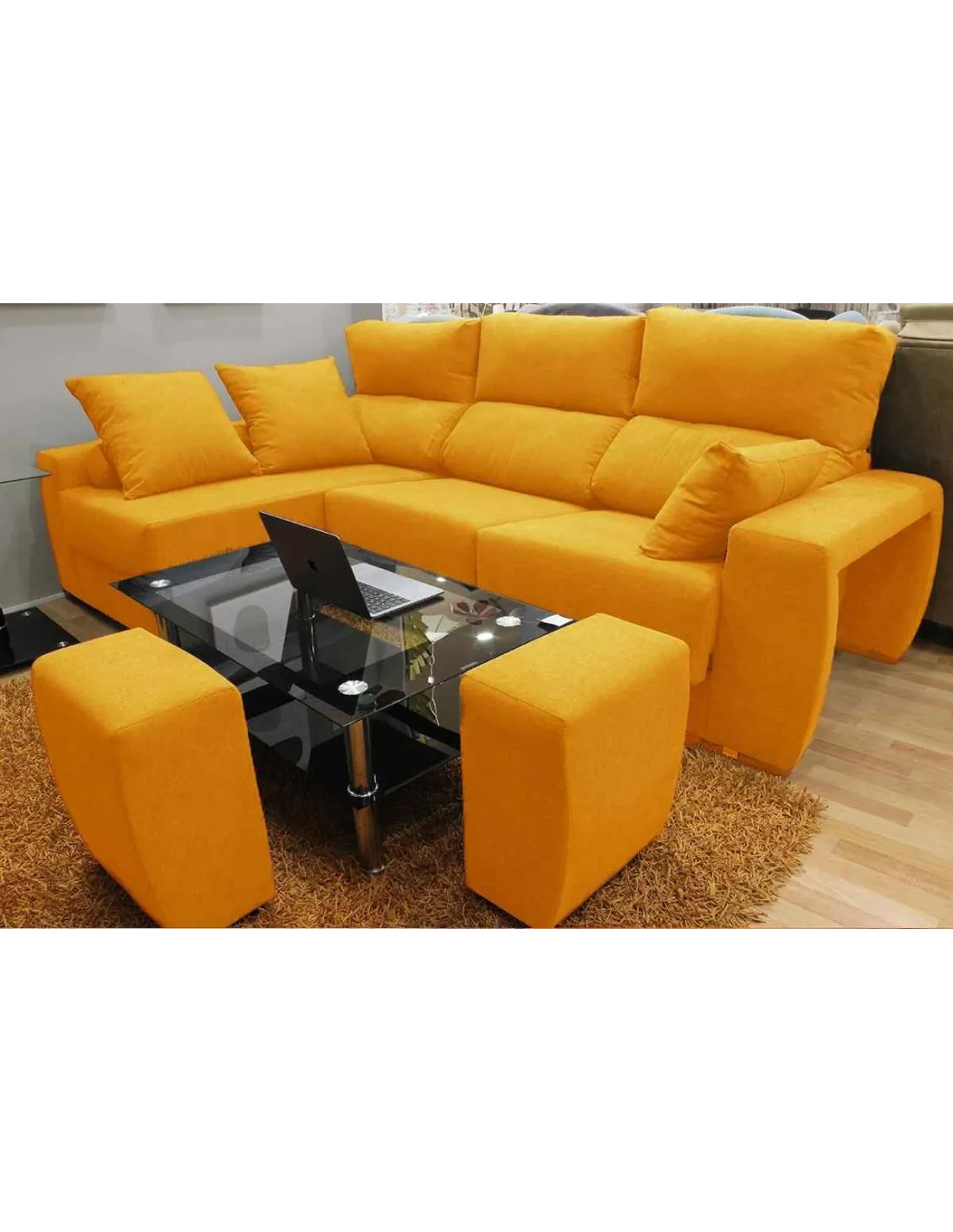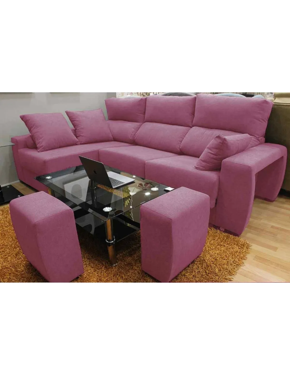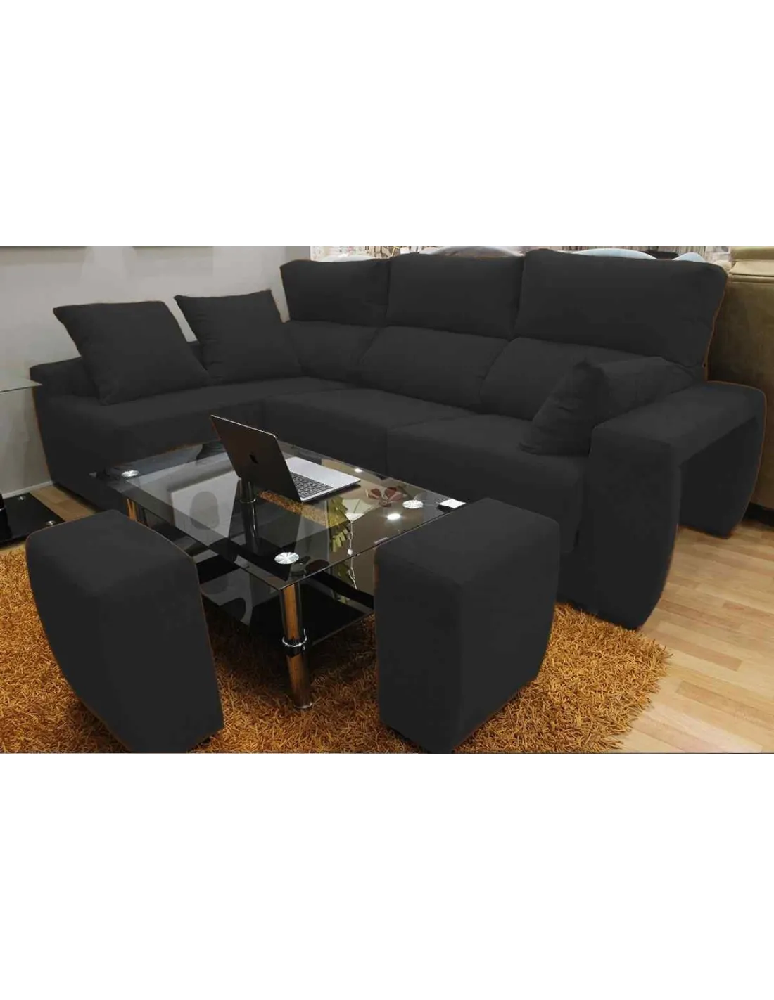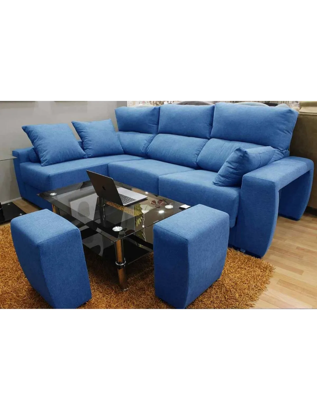 Pufs escondidos en el brazo, aumentando el numeró de plazas o pudiendo utilizarlo como reposapiés.
