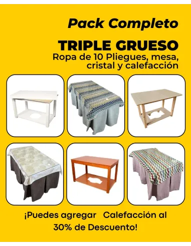 100Descubre el pack completo más completo y exclusivo del mercado, pensado para quienes buscan calidad, elegancia y comodidad en su mesa de camilla. Este artículo incluye todas las medidas disponibles para adaptarse a cualquier espacio: 110x70, 120x70, 130x80 y 140x80 cm. Cada mesa se presenta con la opción de cristal de 6 mm o cristal templado, aportando resistencia, seguridad y un acabado sofisticado.