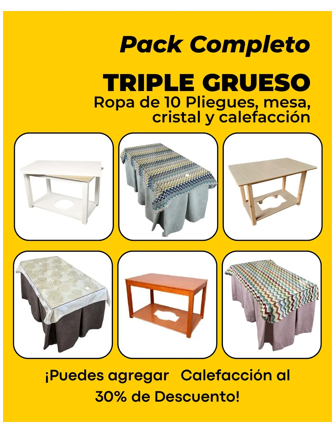En resumen, este pack te ofrece todo lo que necesitas: mesa resistente, ropa de primera calidad, cristal seguro y elegante, junto con un tapete de lujo. La solución ideal para disfrutar de tu hogar con la máxima calidez, diseño y durabilidad.