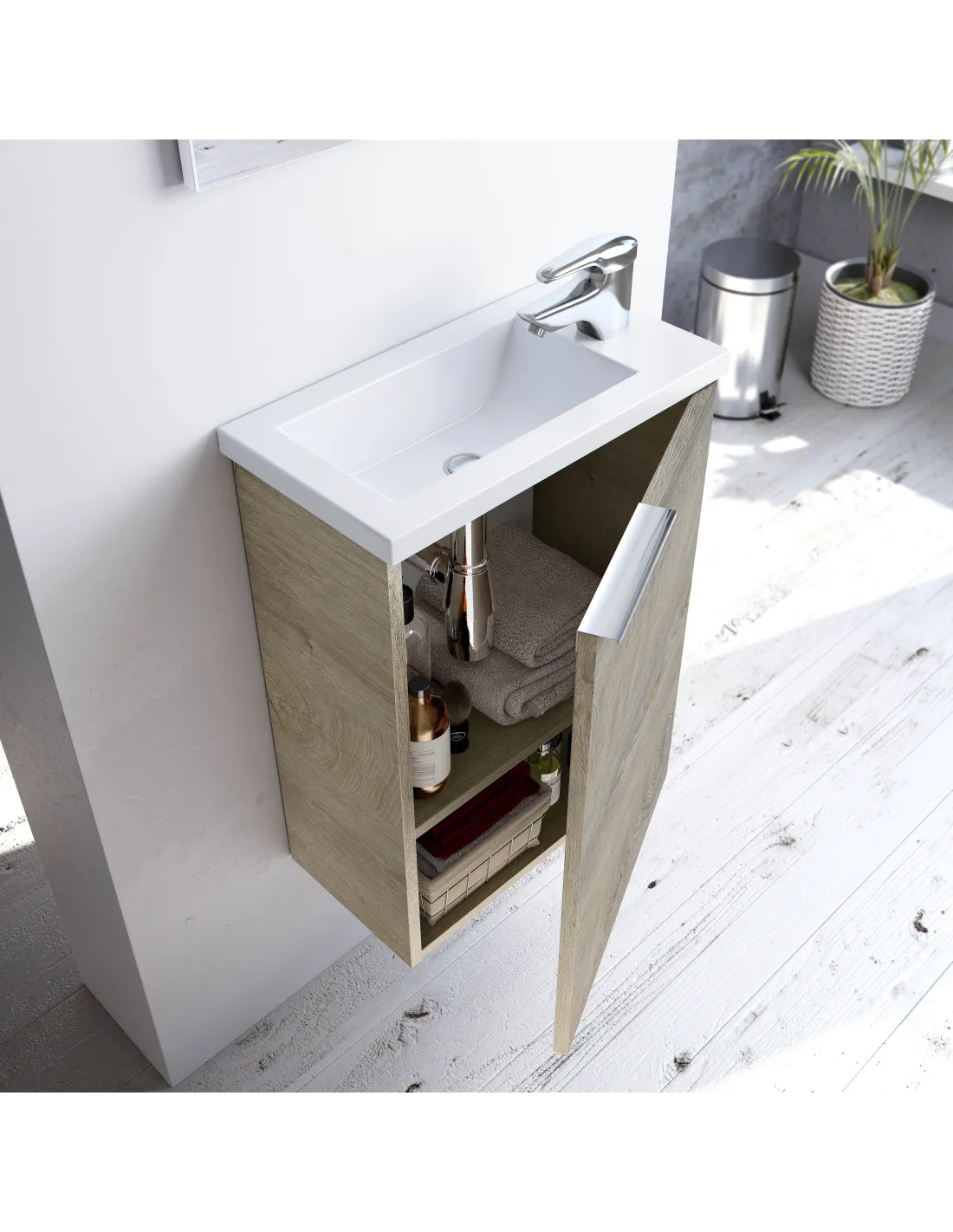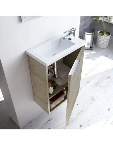 El lavabo es de resina y el mueble cuenta con bisagras con cierre progresivo mediante sistema Soft Close, garantizando un cierre suave y seguro.