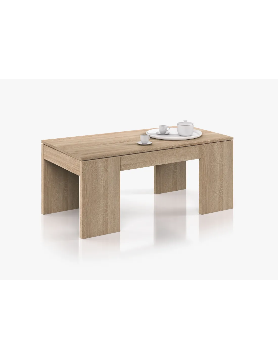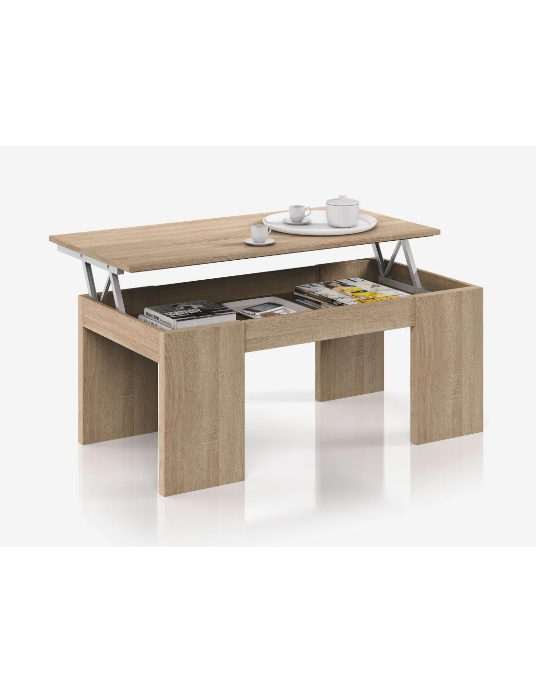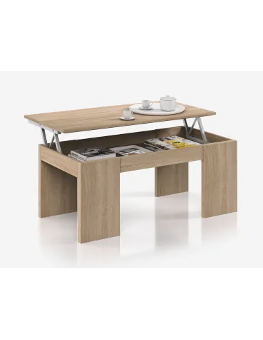Mesa de centro elevable con tapa elevable. Con espacio de almacenamiento que queda oculto al cerrar la tapa.