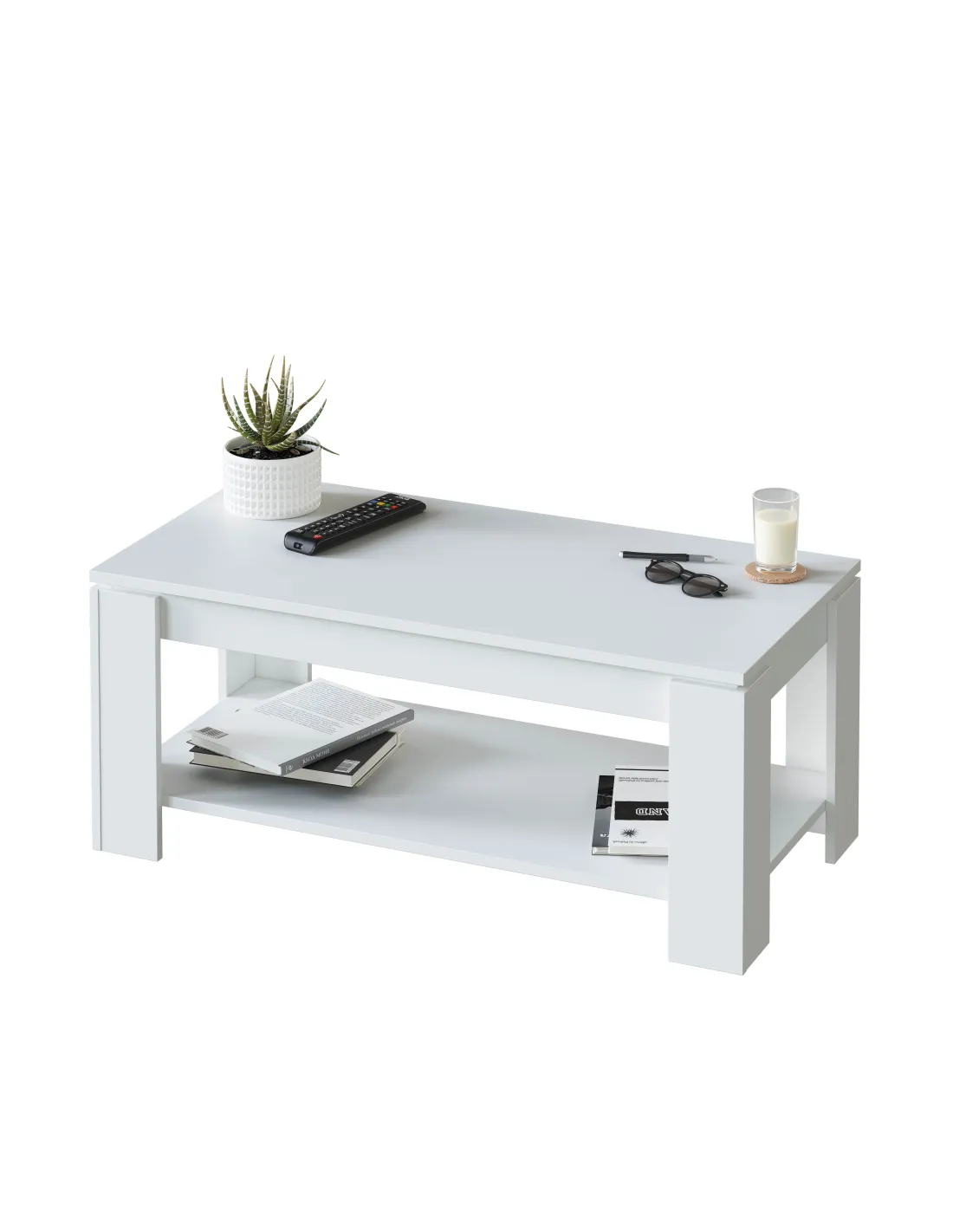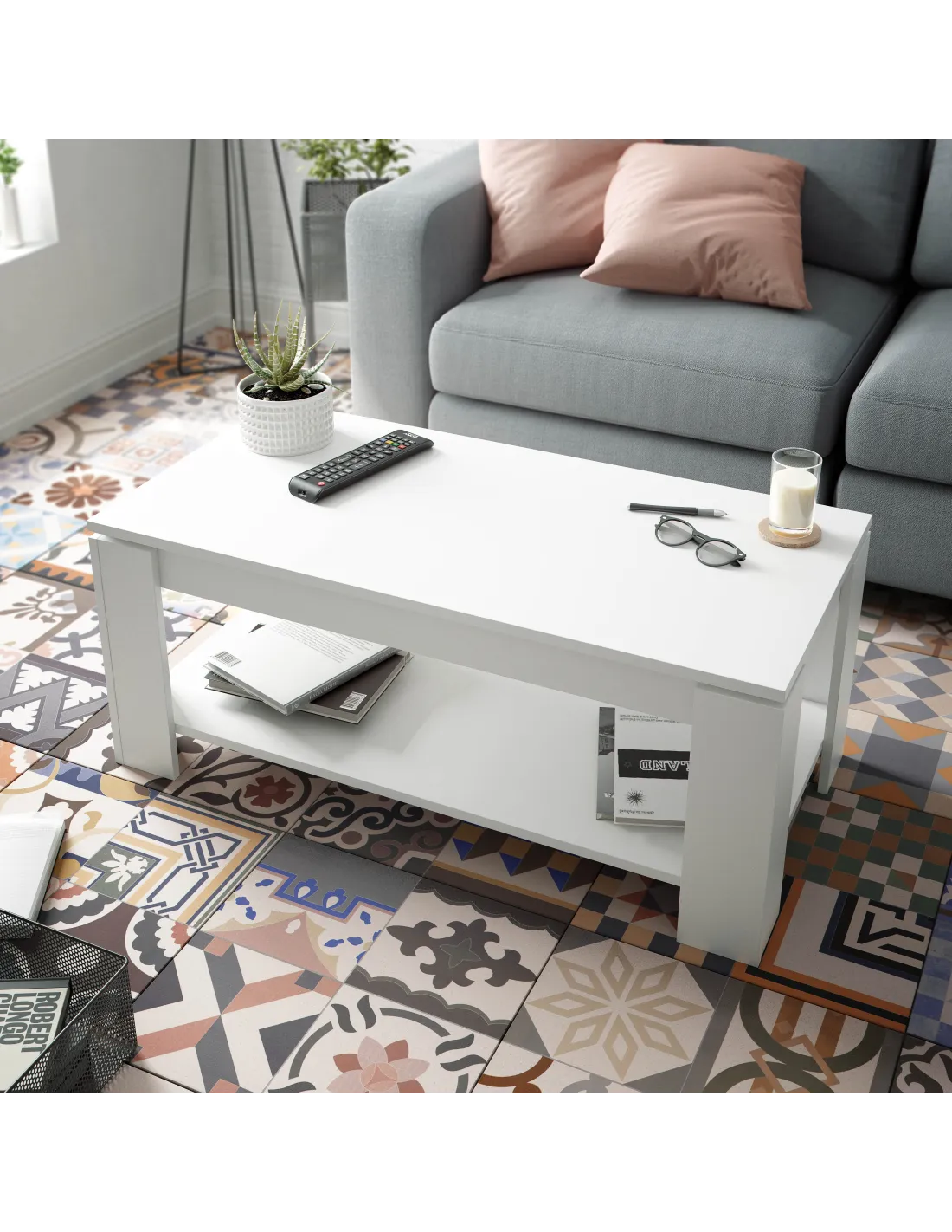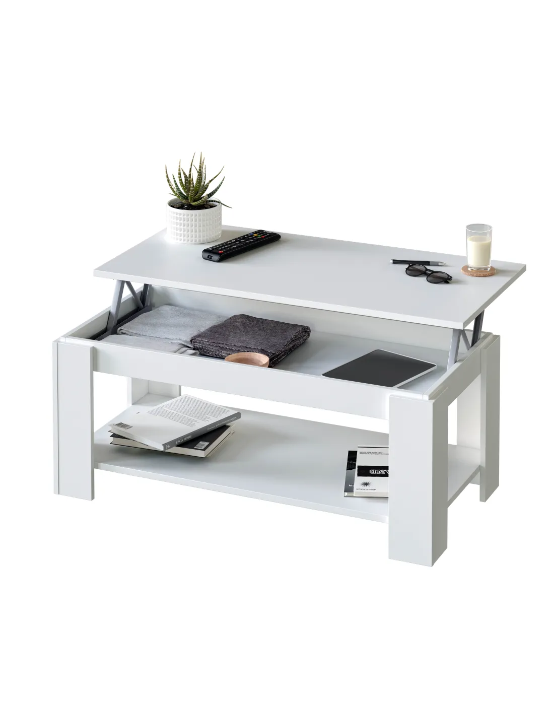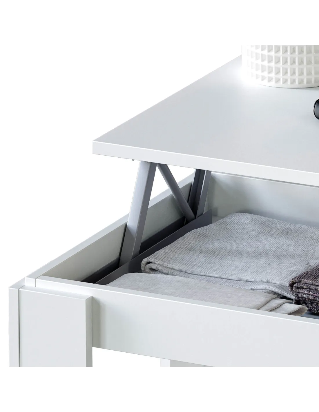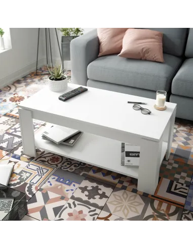 Mesa de centro elevable con tapa elevable. Con espacio de almacenamiento que queda oculto al cerrar la tapa.