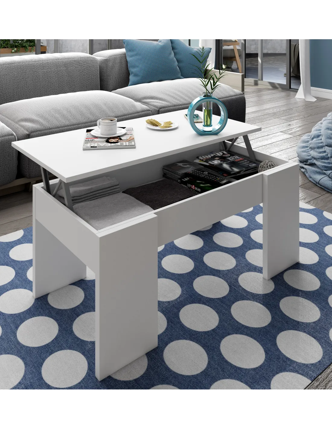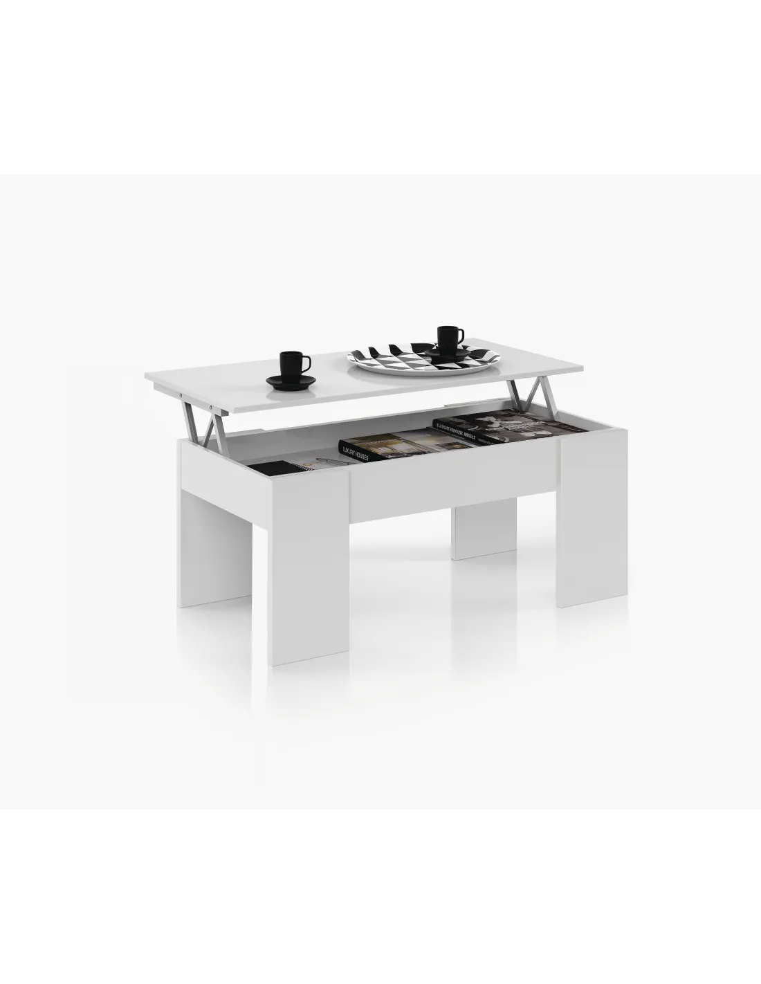 Mesa de centro elevable con tapa elevable. Con espacio de almacenamiento que queda oculto al cerrar la tapa.