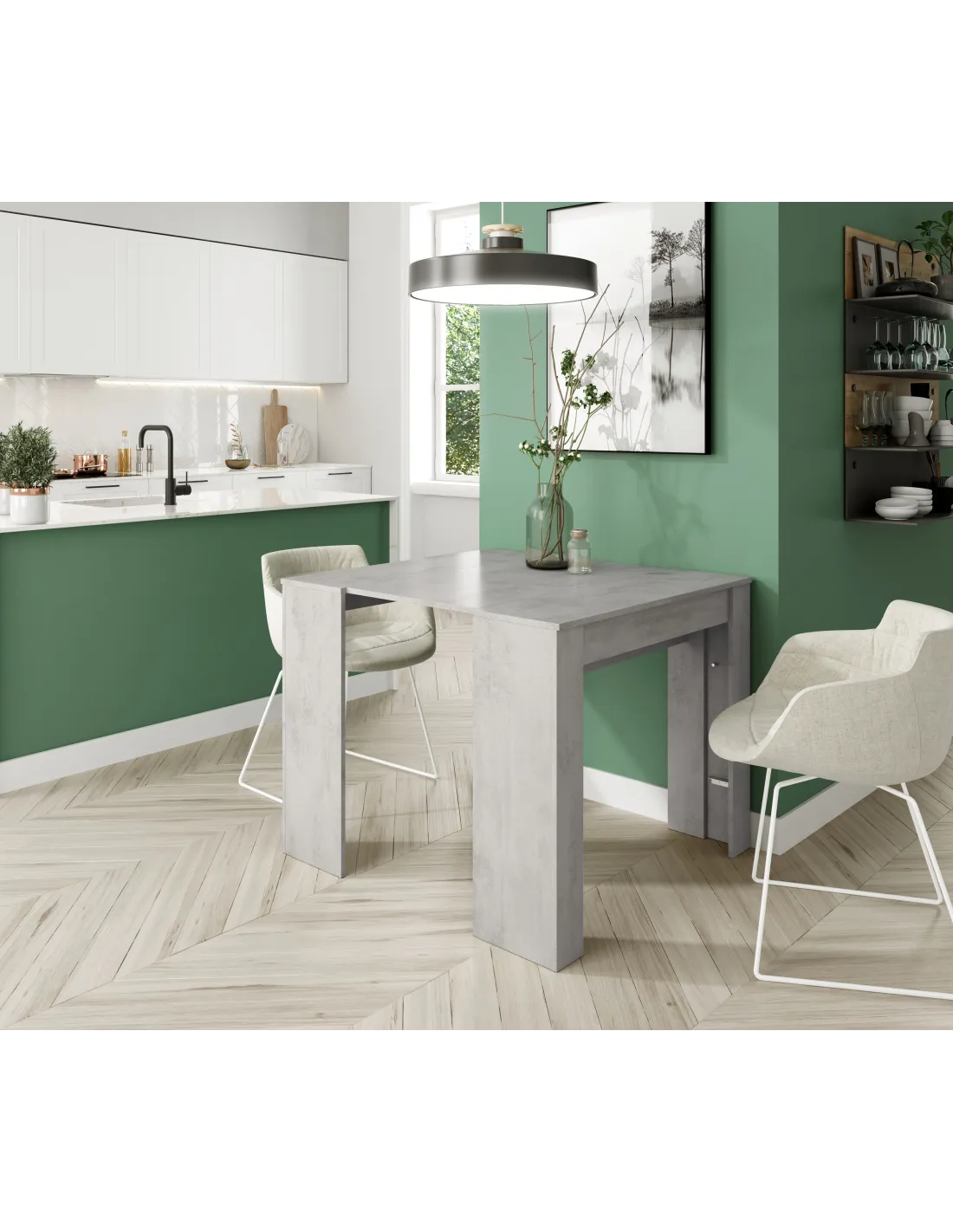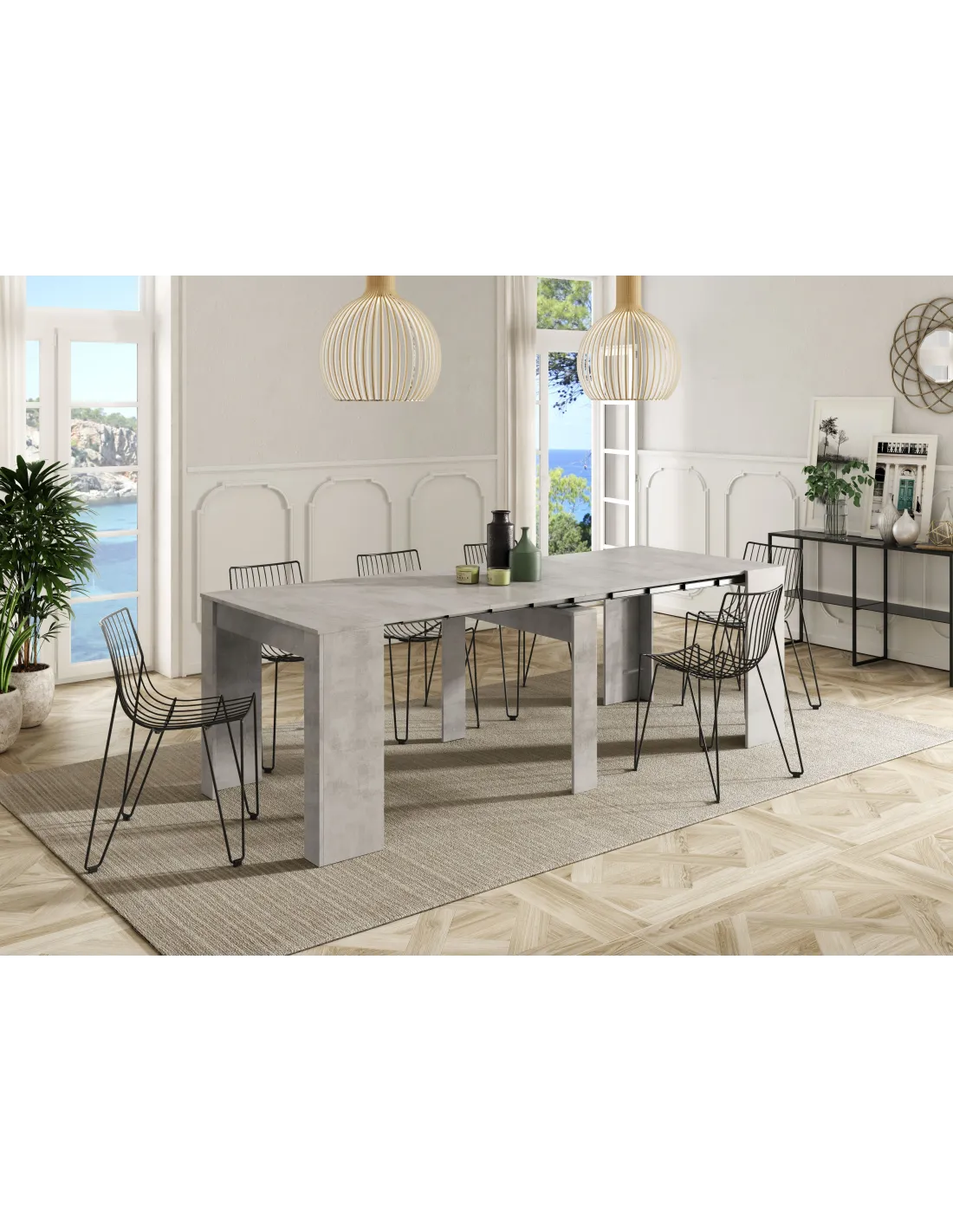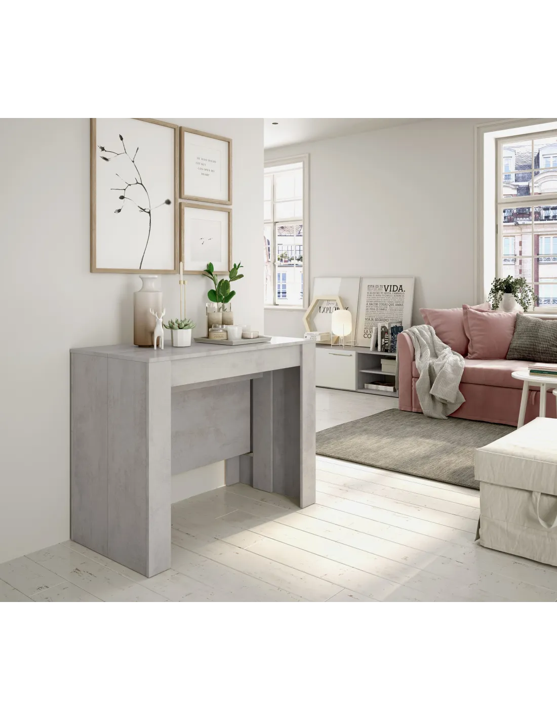 Mesa de comedor consola extensible con 5 posiciones, ideal para optimizar el espacio en el salón o comedor. Su acabado en color Cemento aporta un estilo industrial y moderno a cualquier estancia.