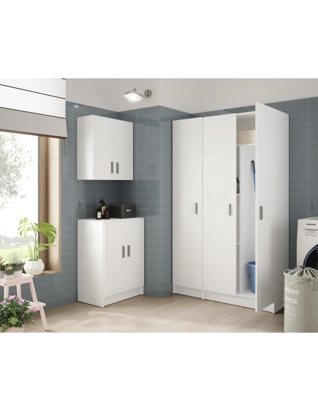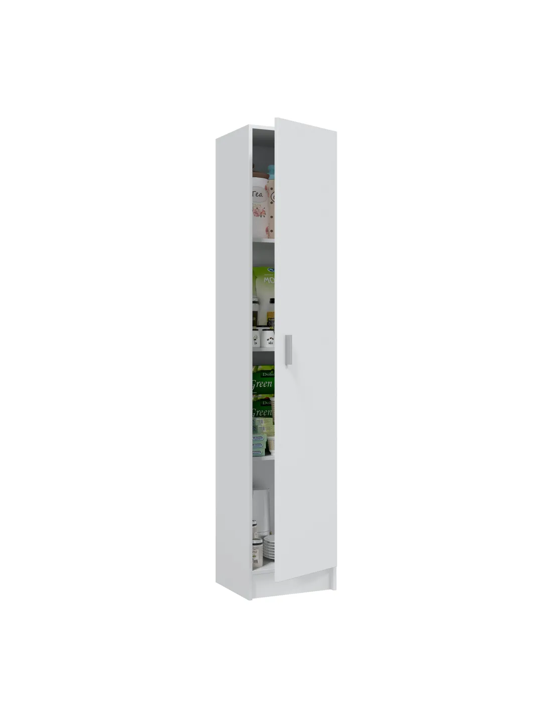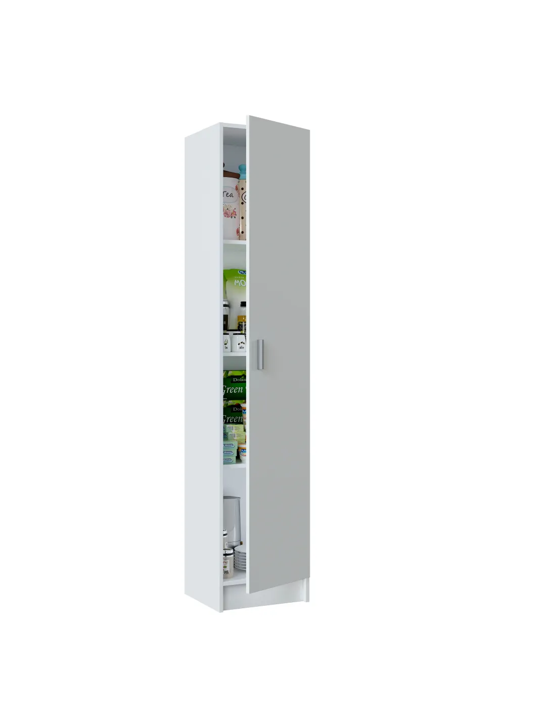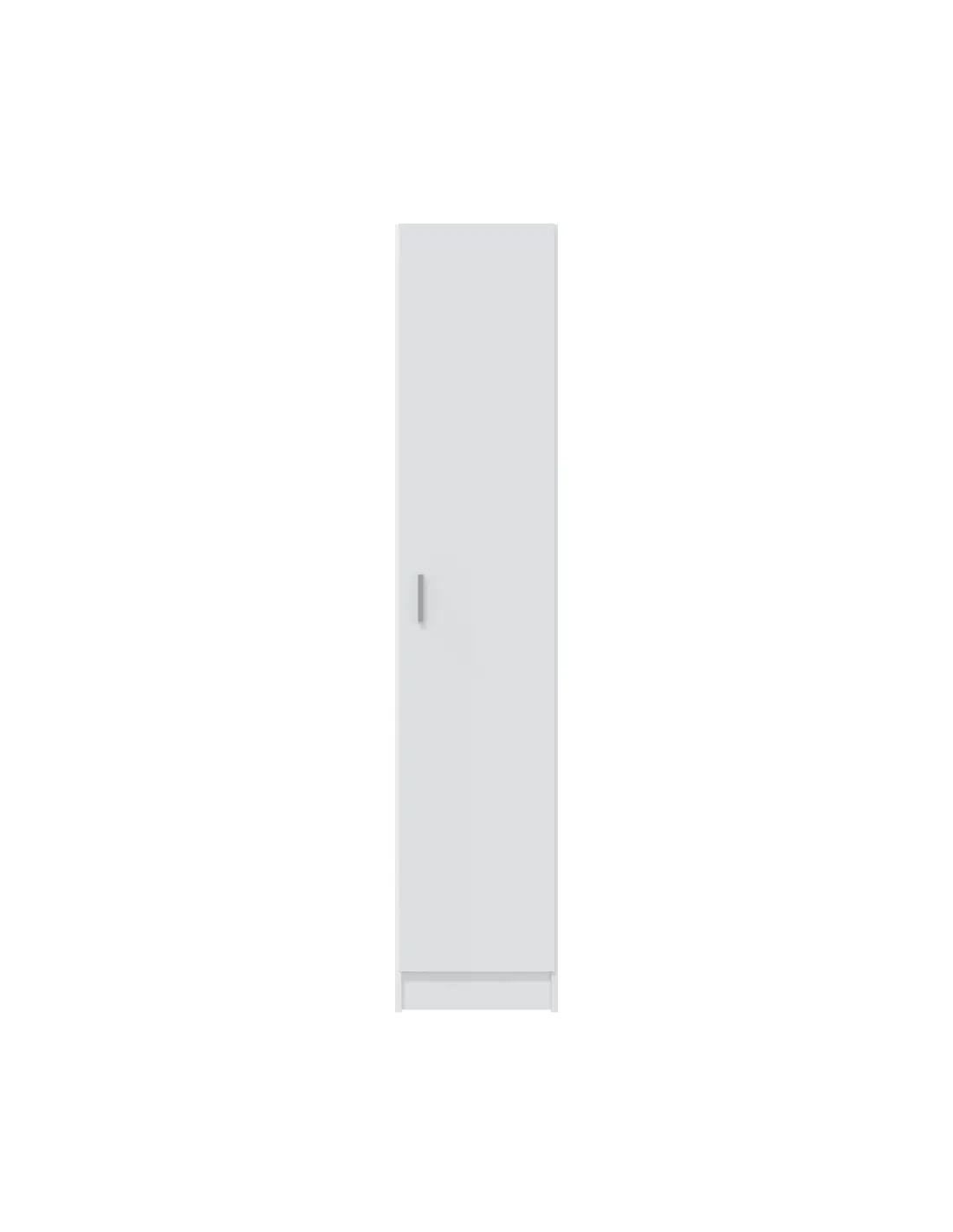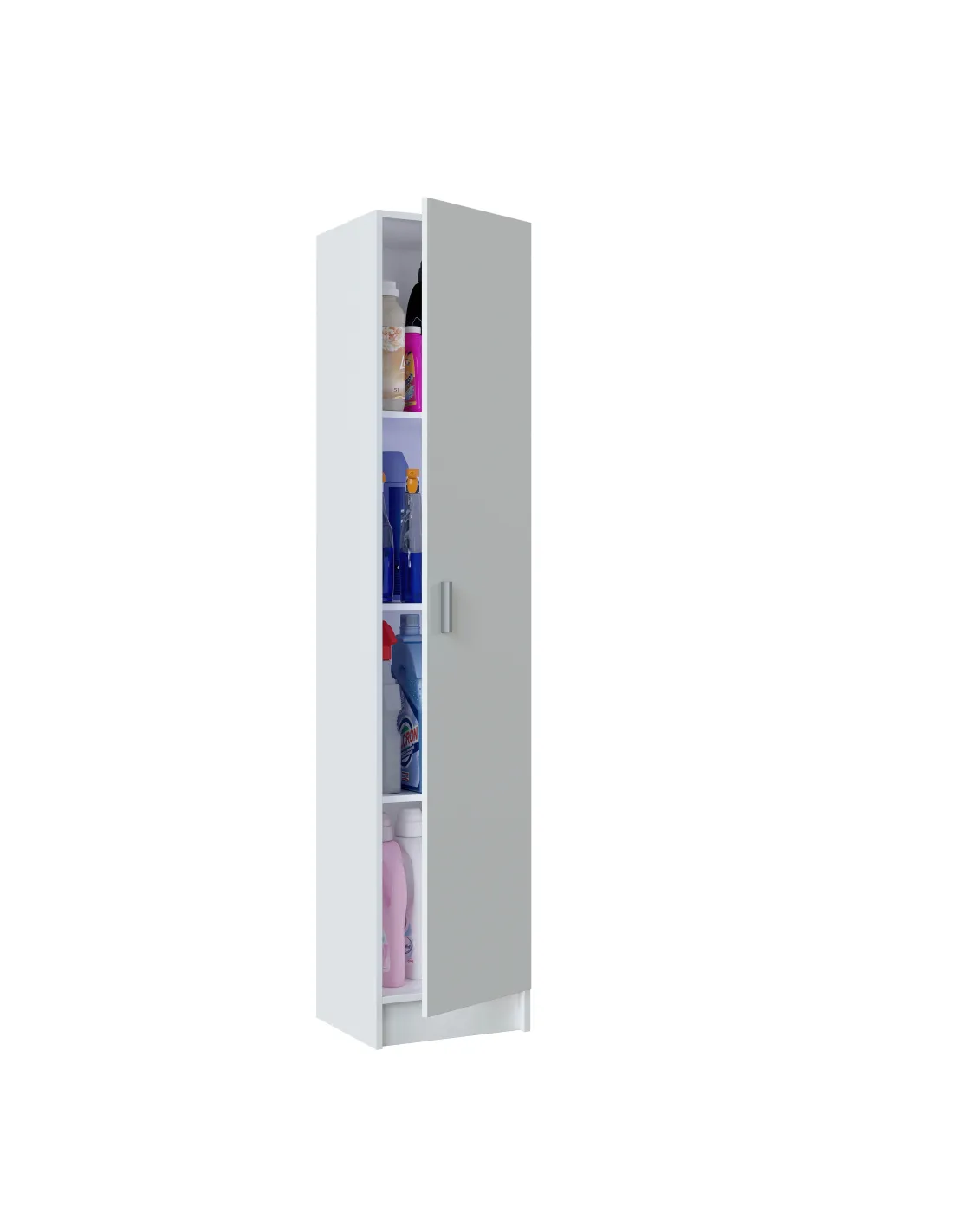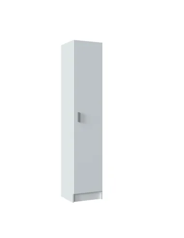 Armario multiusos de 1 puerta con estantes regulables. Dispone de tres estantes con varias posiciones en altura, bisagras metálicas y soporte de estantes metálicos. Puerta reversible y tirador ABS en gris aluminio.