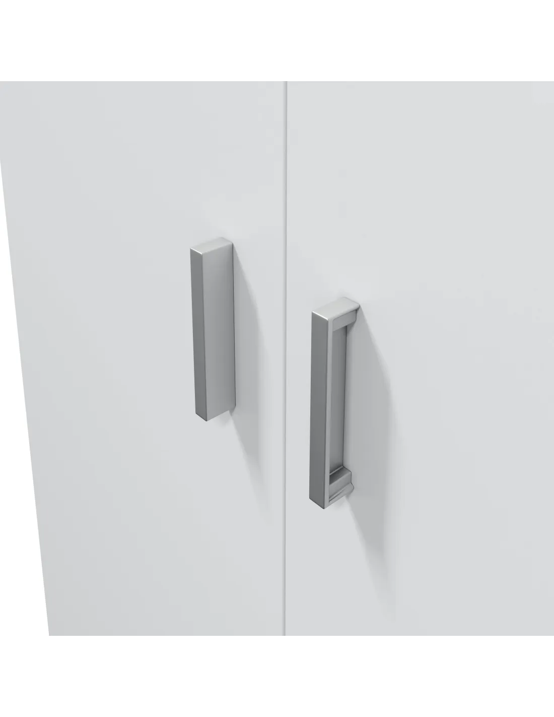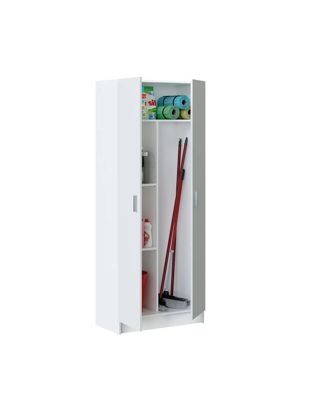 Armario escobero de 2 puertas con estantes regulables. Dispone de dos estantes con varias posiciones en altura, bisagras metálicas y soporte de estantes metálicos. Incluye tirador ABS en gris aluminio y tacos ABS quitarruidos y antirayas.