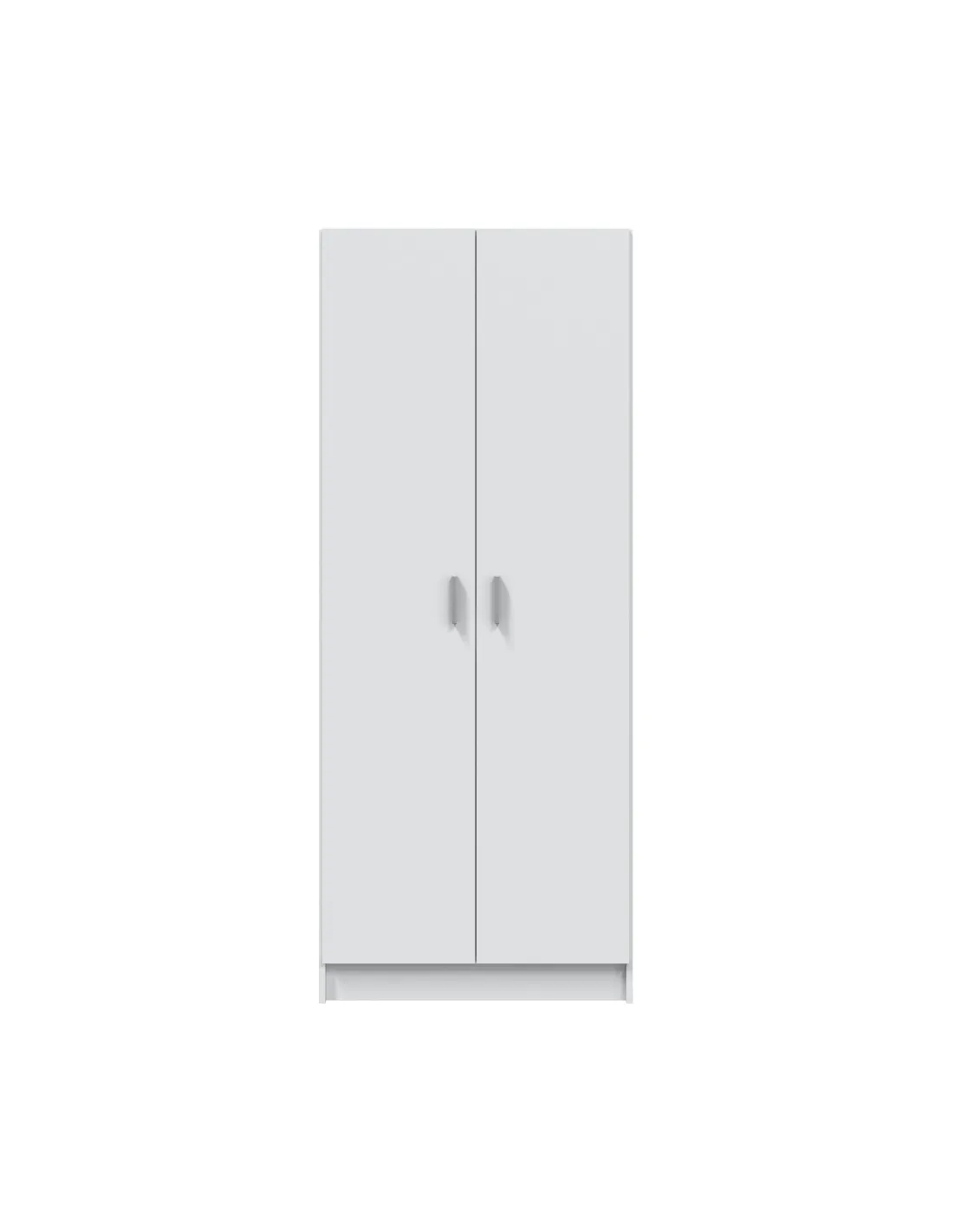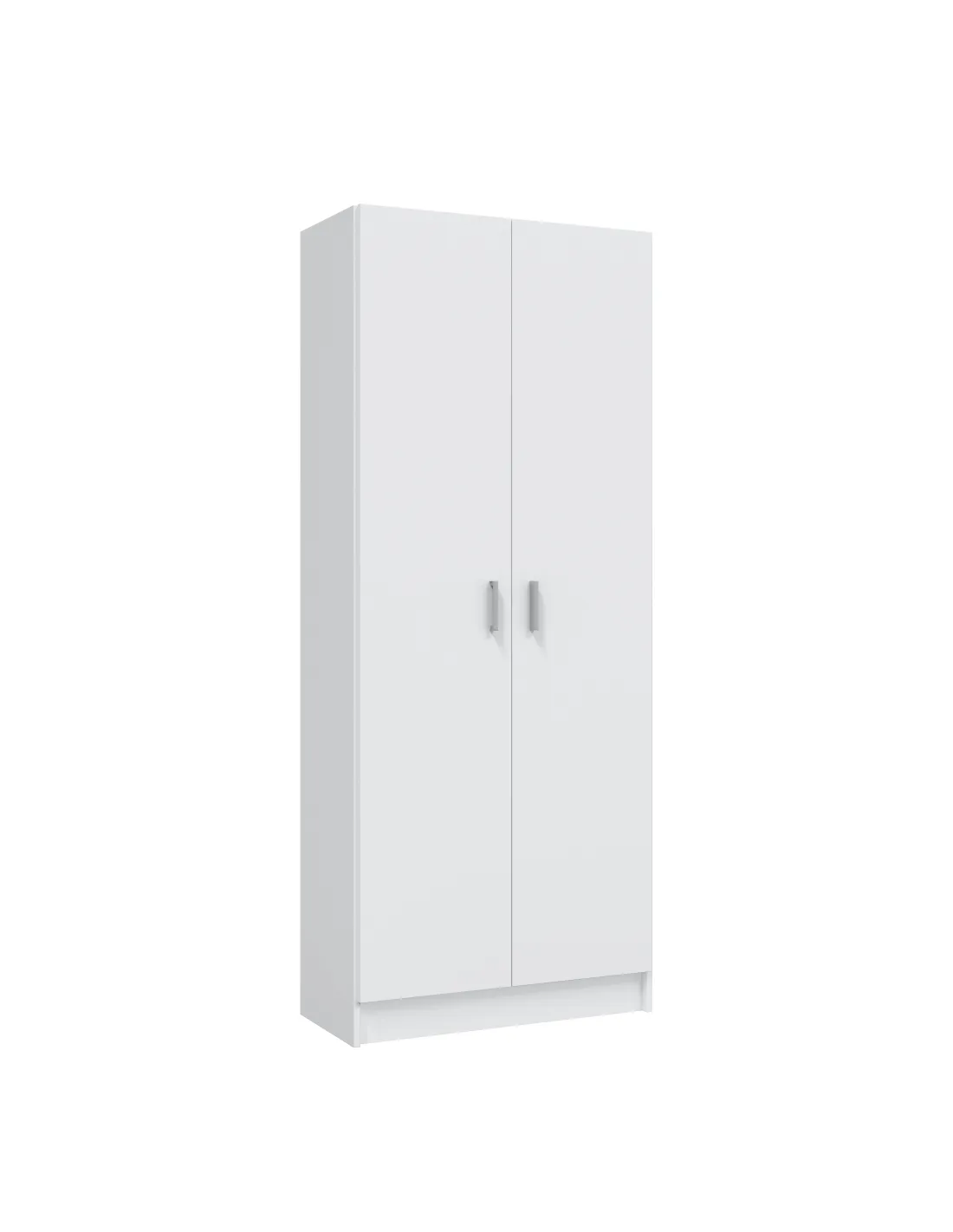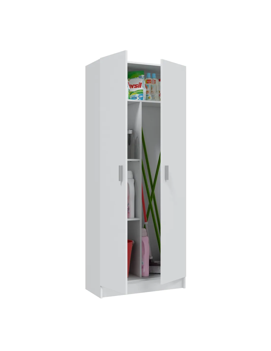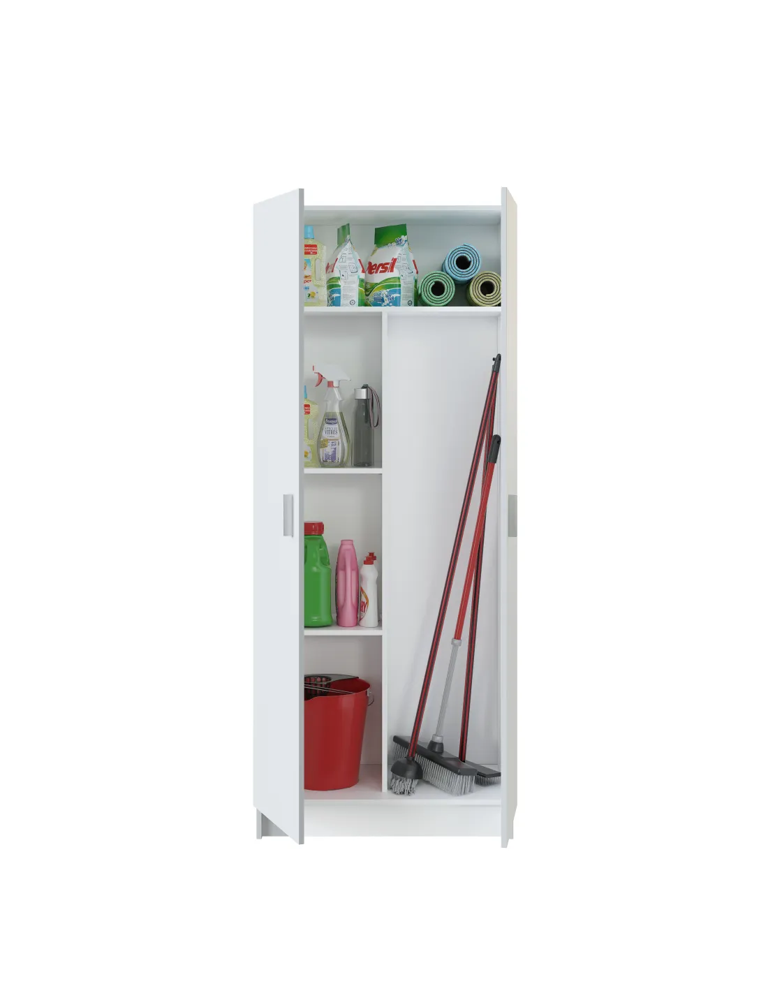 Armario escobero de 2 puertas con 2 estantes regulables en altura. Diseñado para optimizar el espacio de almacenaje, ideal para guardar utensilios de limpieza u otros objetos.