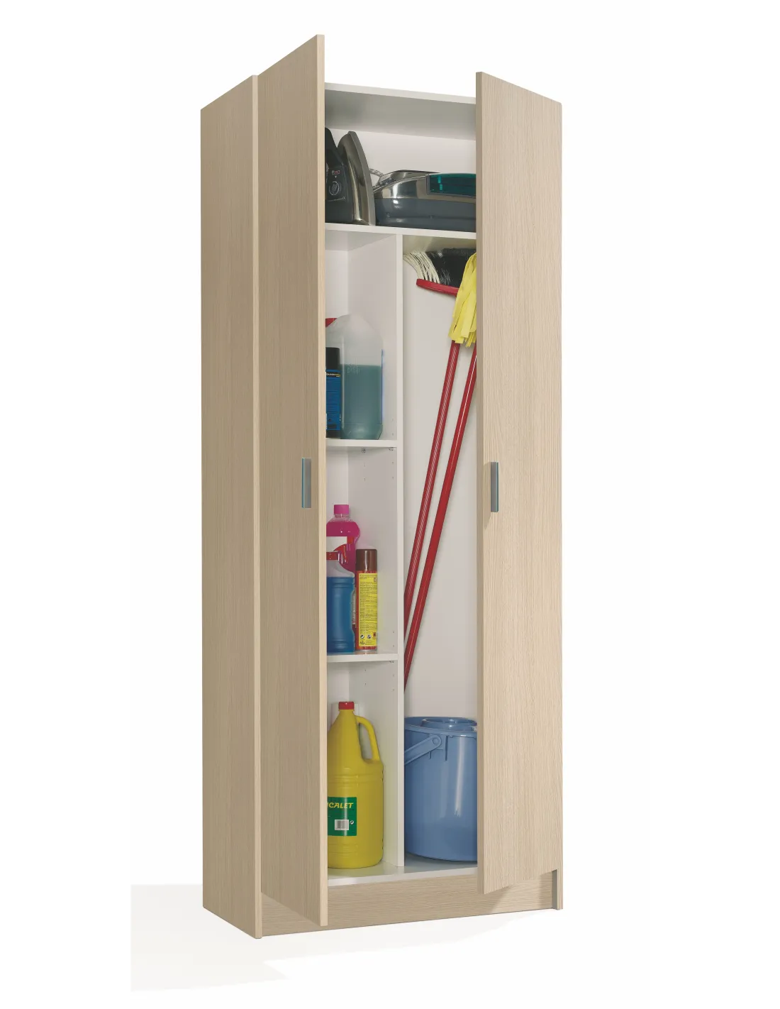 Armario escobero de 2 puertas con 2 estantes regulables en altura. Una solución práctica para organizar utensilios de limpieza y otros accesorios del hogar.