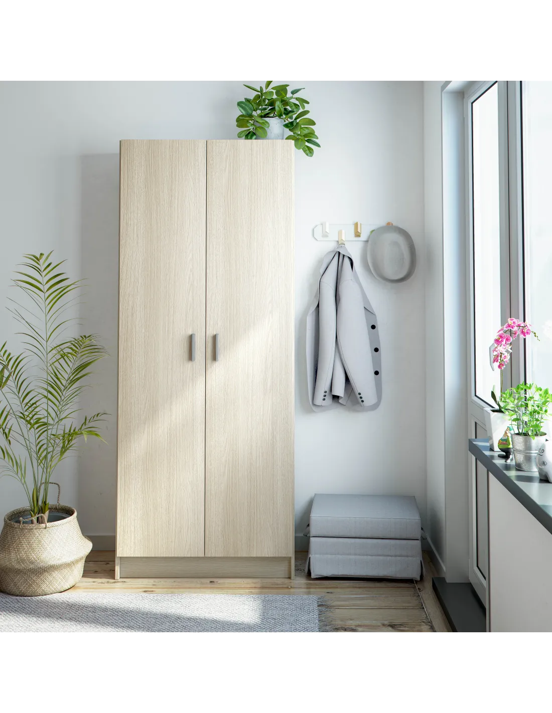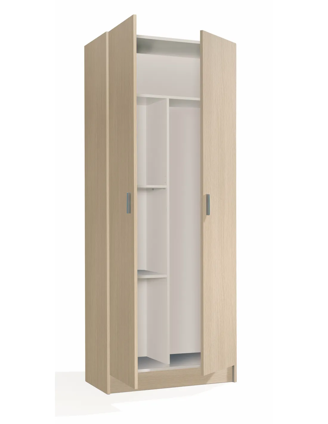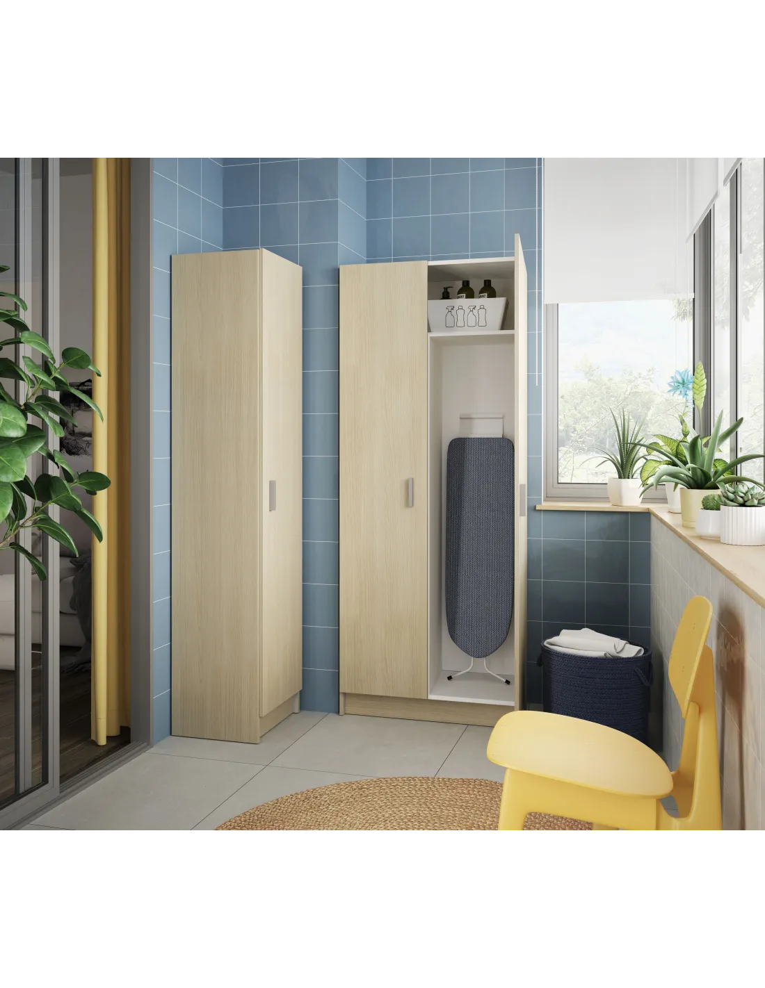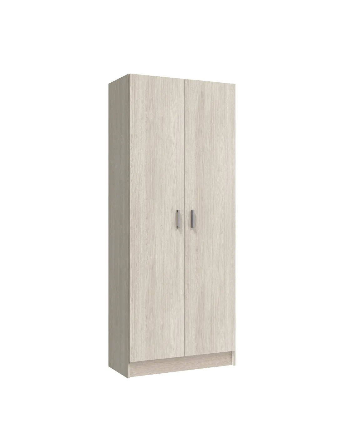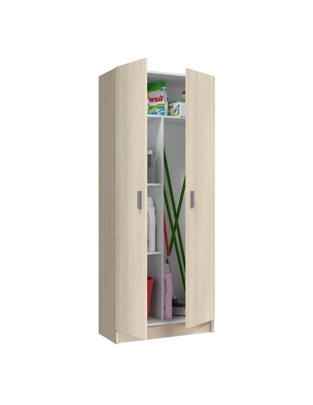 Armario escobero de 2 puertas con estantes regulables. Dispone de dos estantes con varias posiciones en altura, bisagras metálicas y soporte de estantes metálicos. Incluye tirador ABS en gris aluminio y tacos ABS quitarruidos y antirayas.