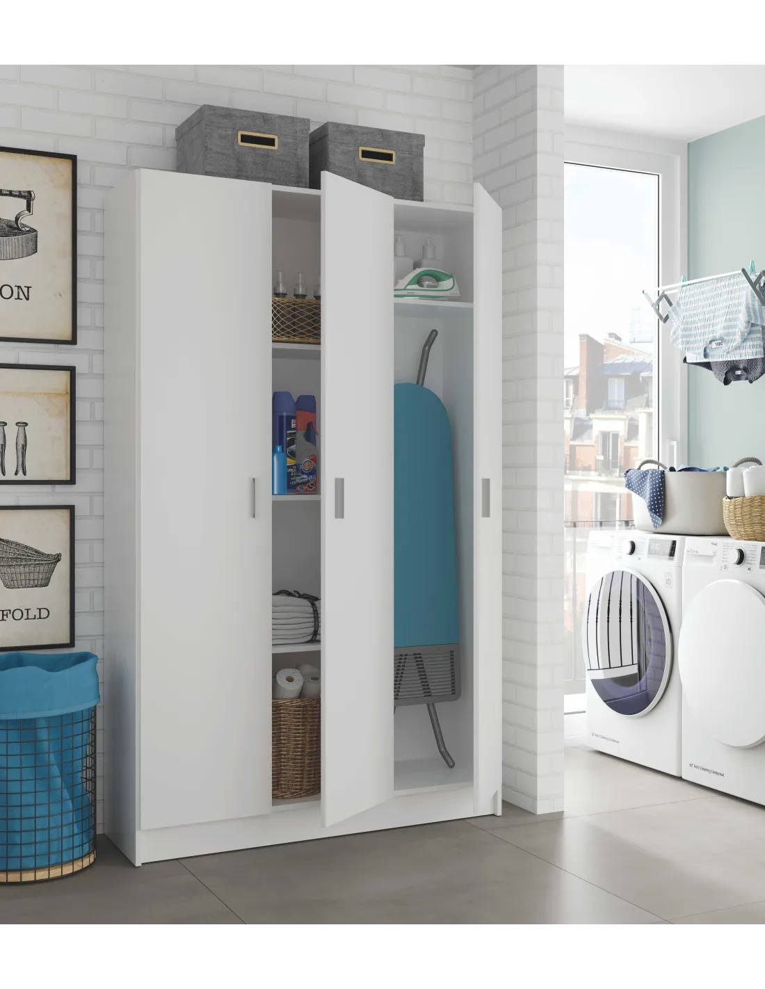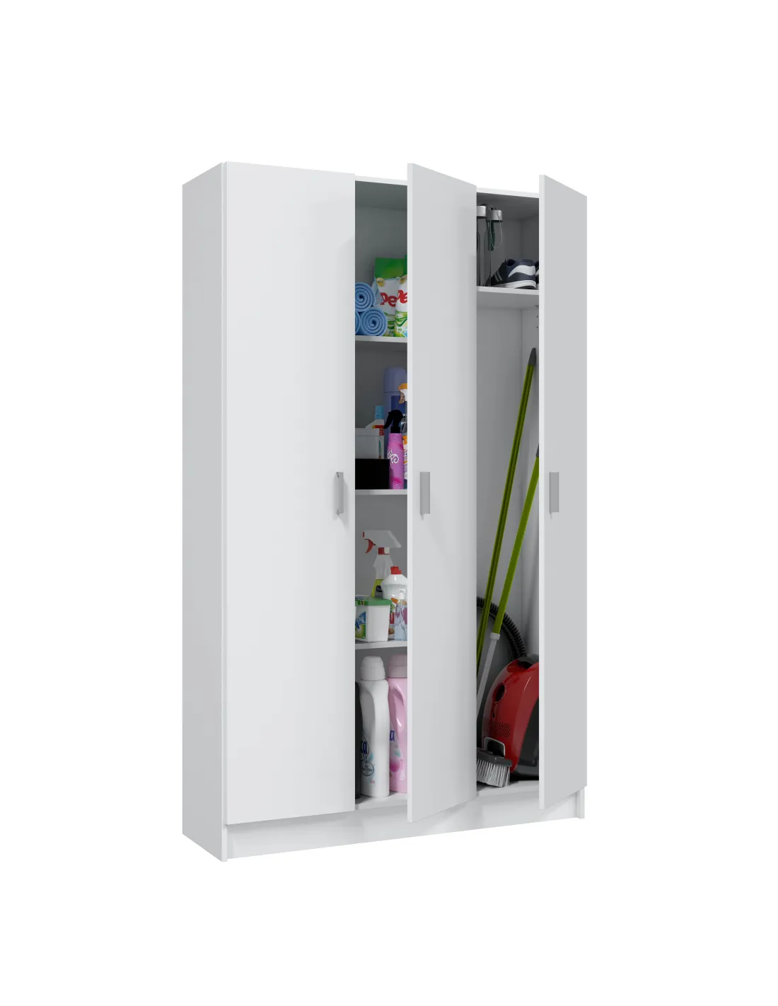 Armario escobero de 3 puertas con 4 estantes regulables en altura. Una solución amplia y funcional para organizar productos de limpieza y otros accesorios del hogar.