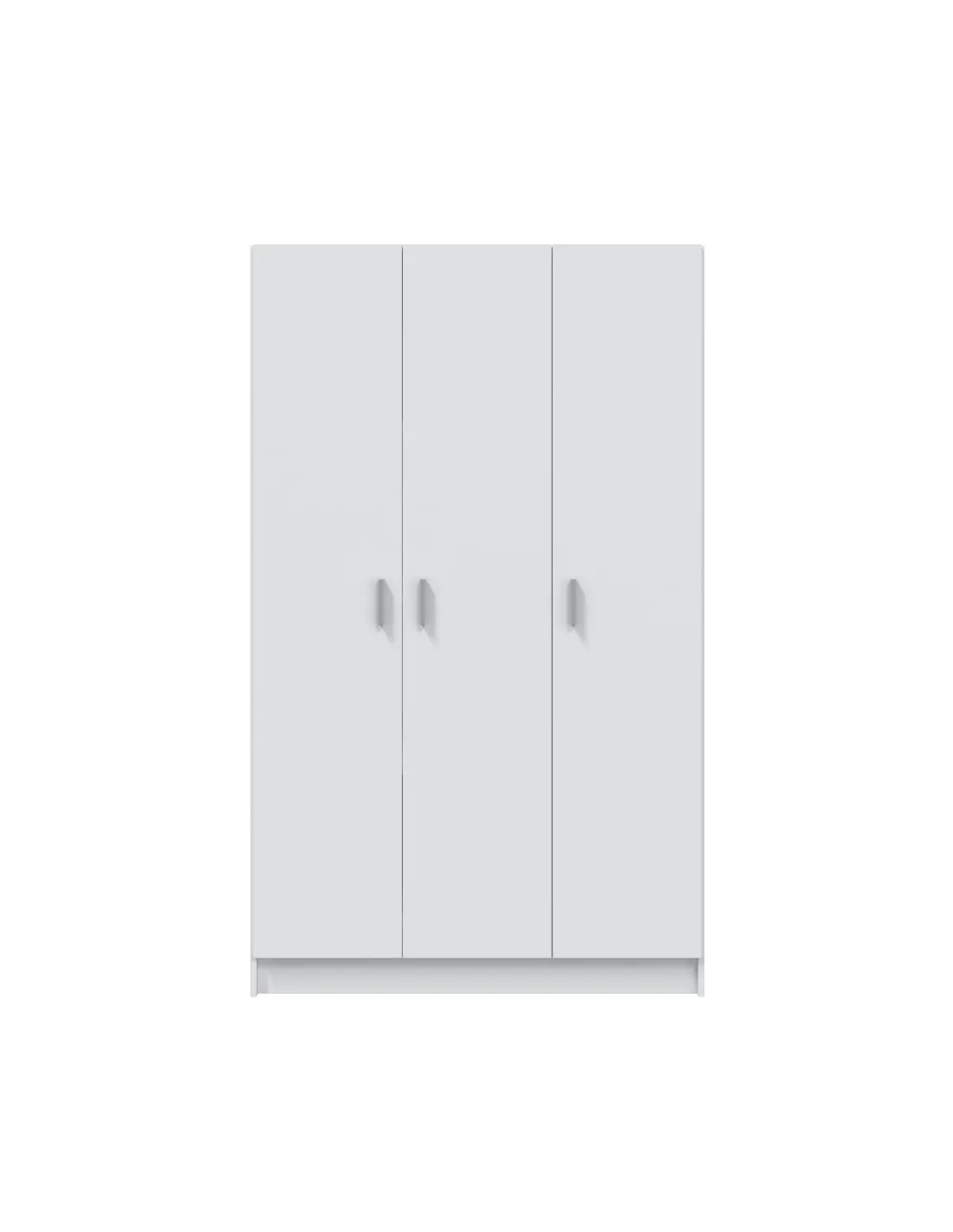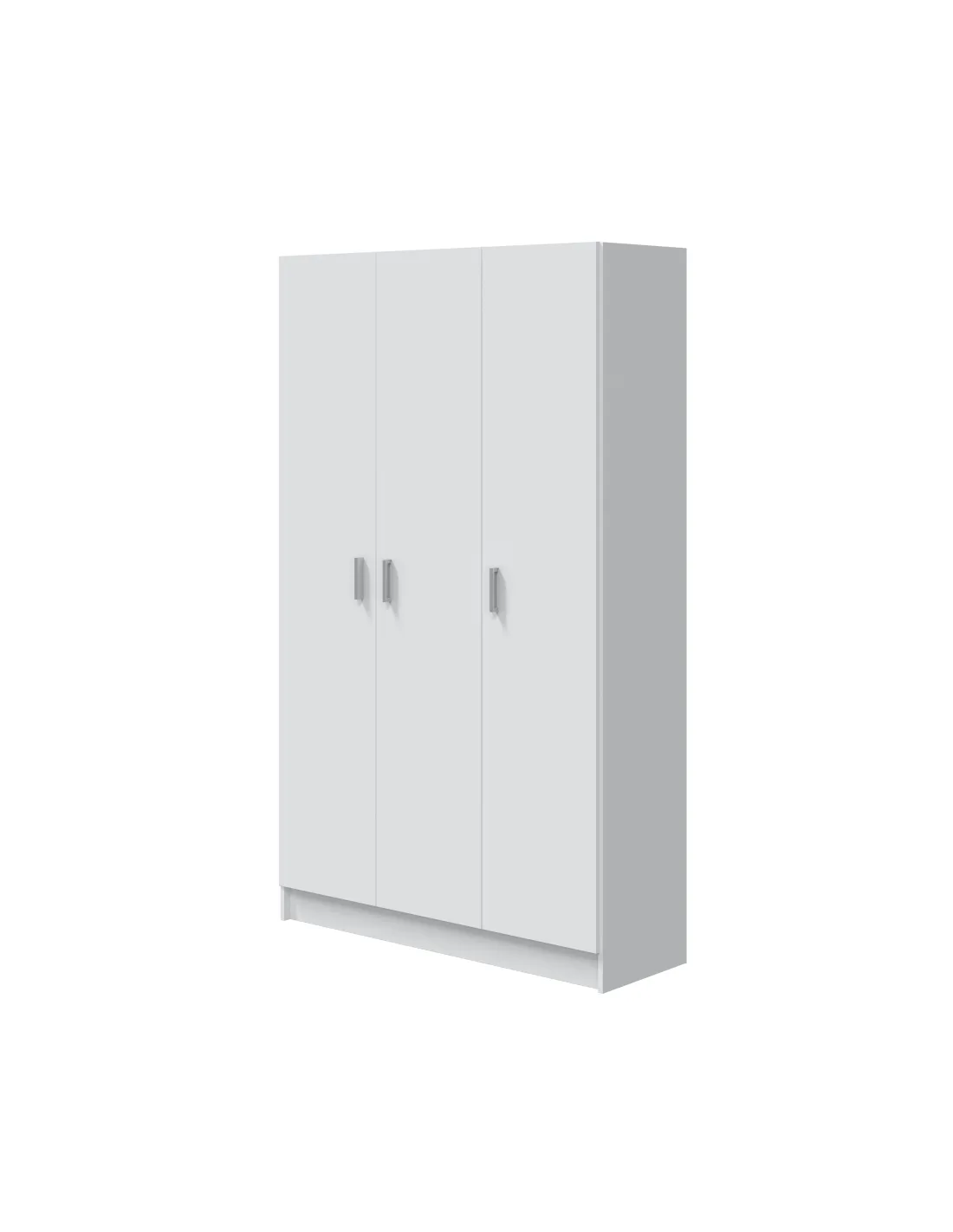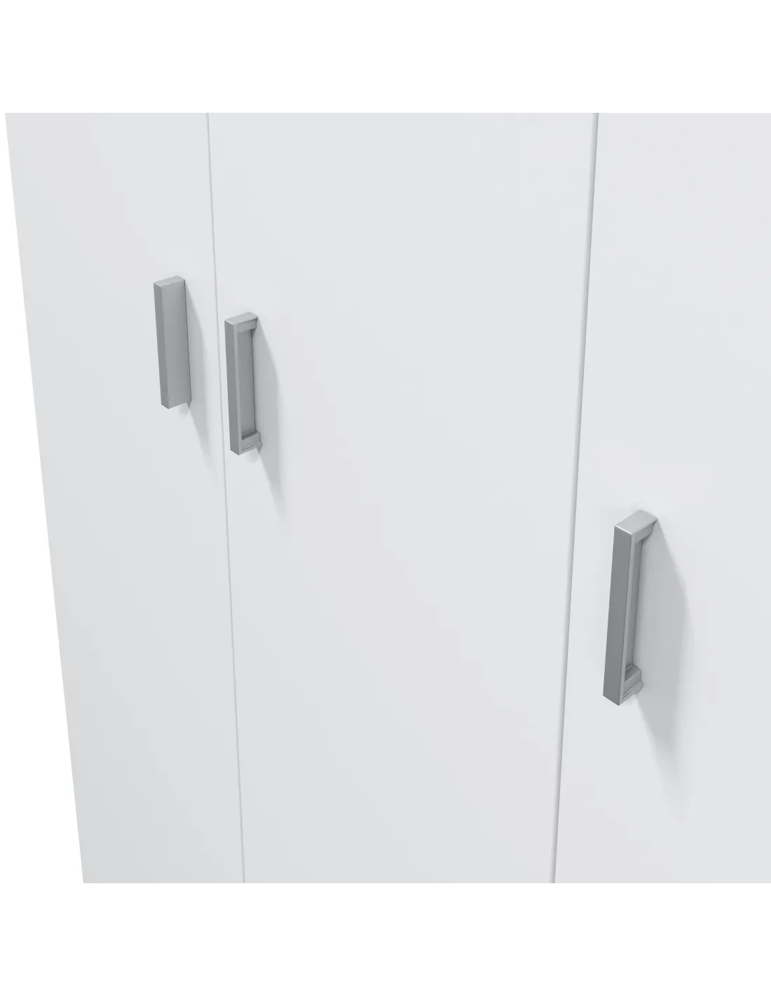 Armario escobero de 3 puertas con estantes regulables. Incorpora cuatro estantes con varias posiciones en altura, bisagras metálicas y soporte de estantes metálicos. Incluye tirador ABS en gris aluminio y tacos ABS quitarruidos y antirayas.