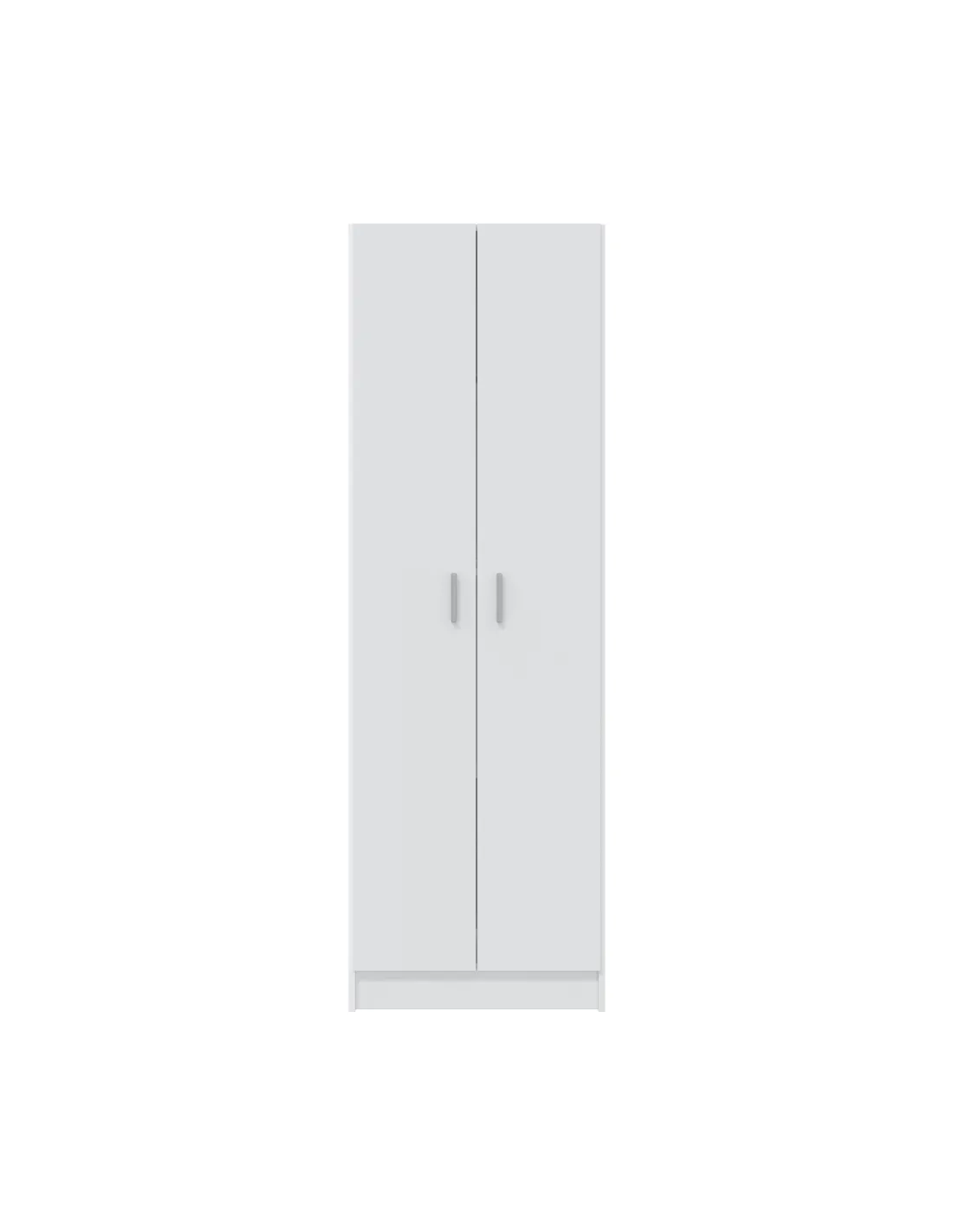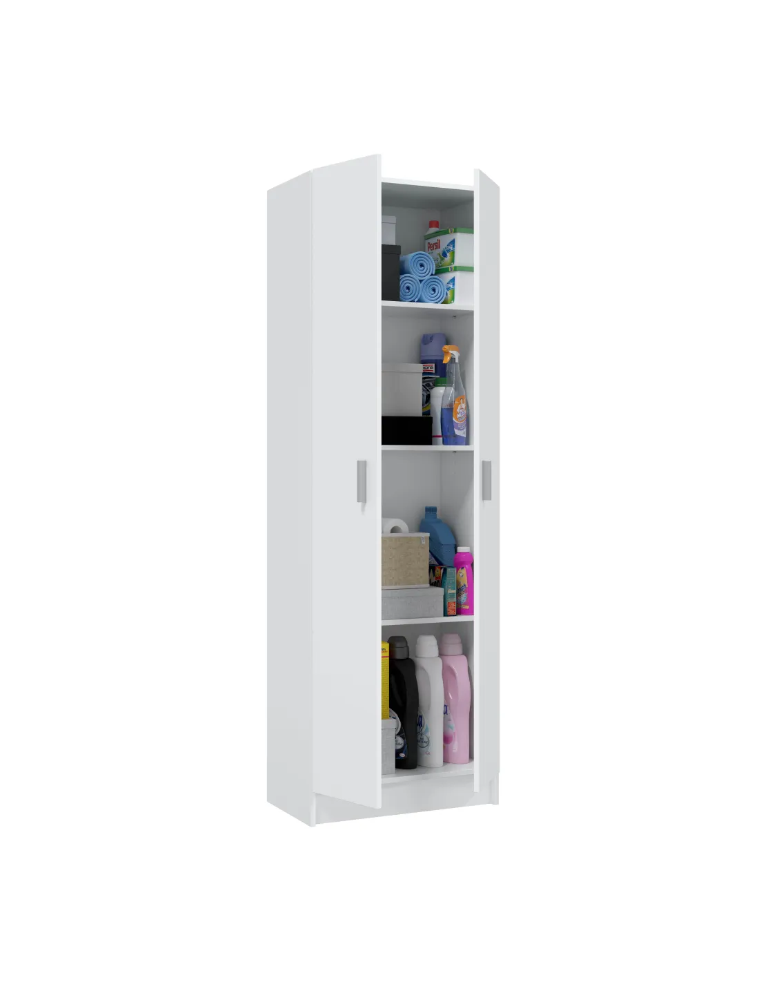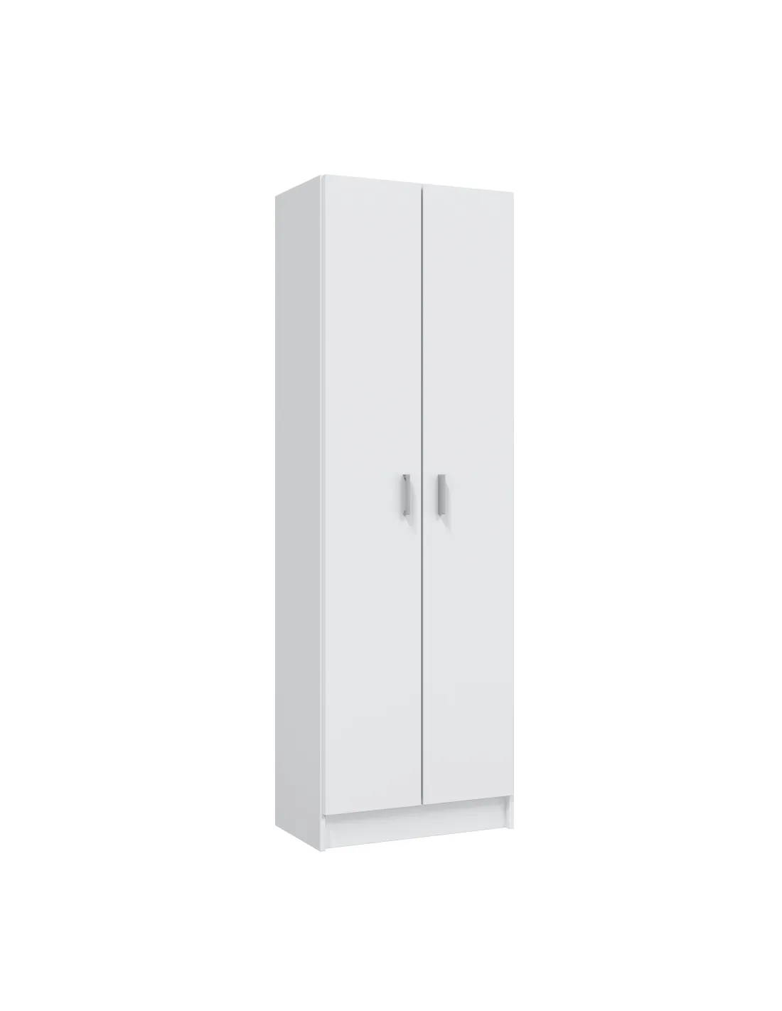 Armario multiusos de 2 puertas con estantes regulables. Dispone de tres estantes con varias posiciones en altura, bisagras metálicas y soporte de estantes metálicos. Incluye tirador ABS en gris aluminio y tacos ABS quitarruidos y antirayas.