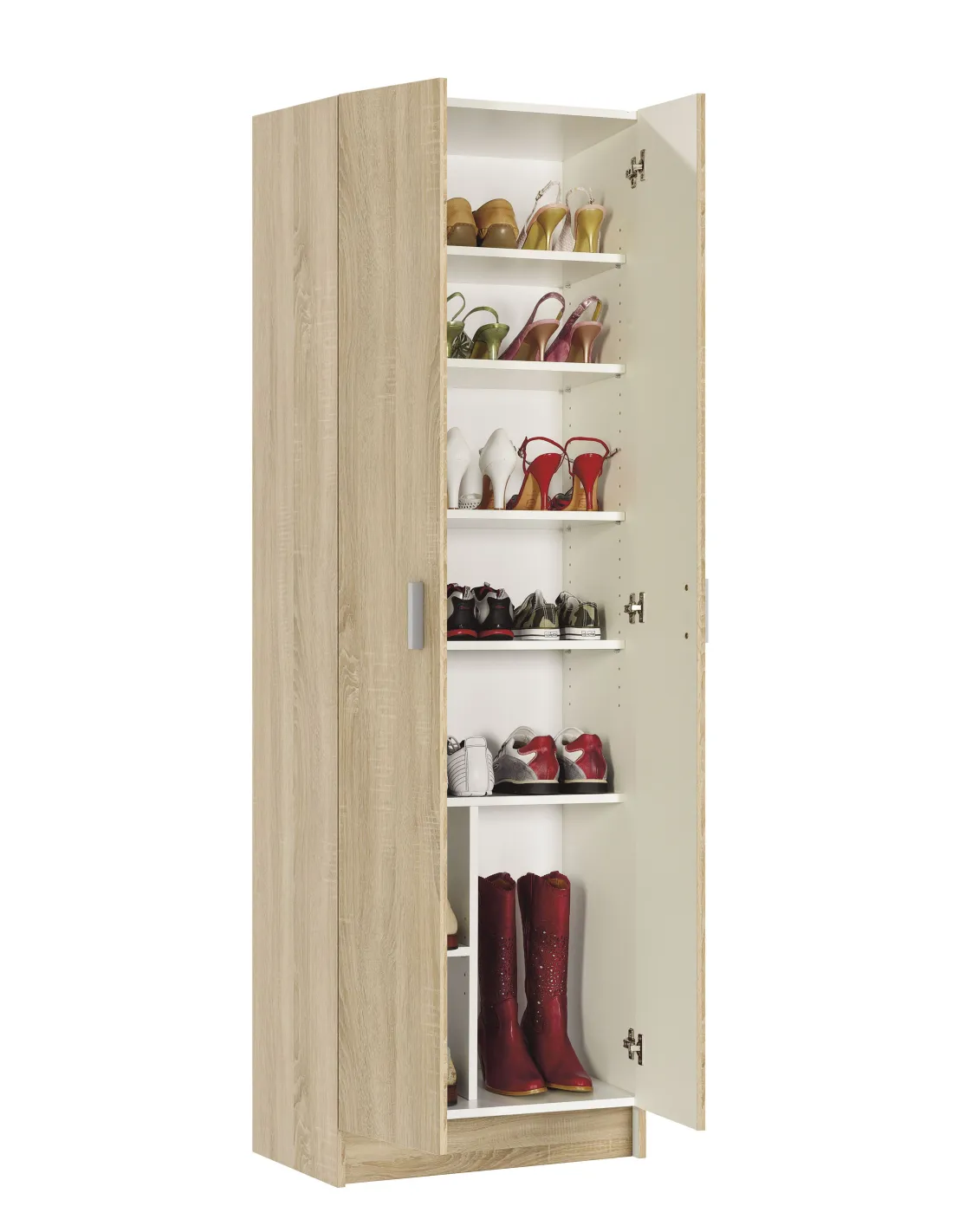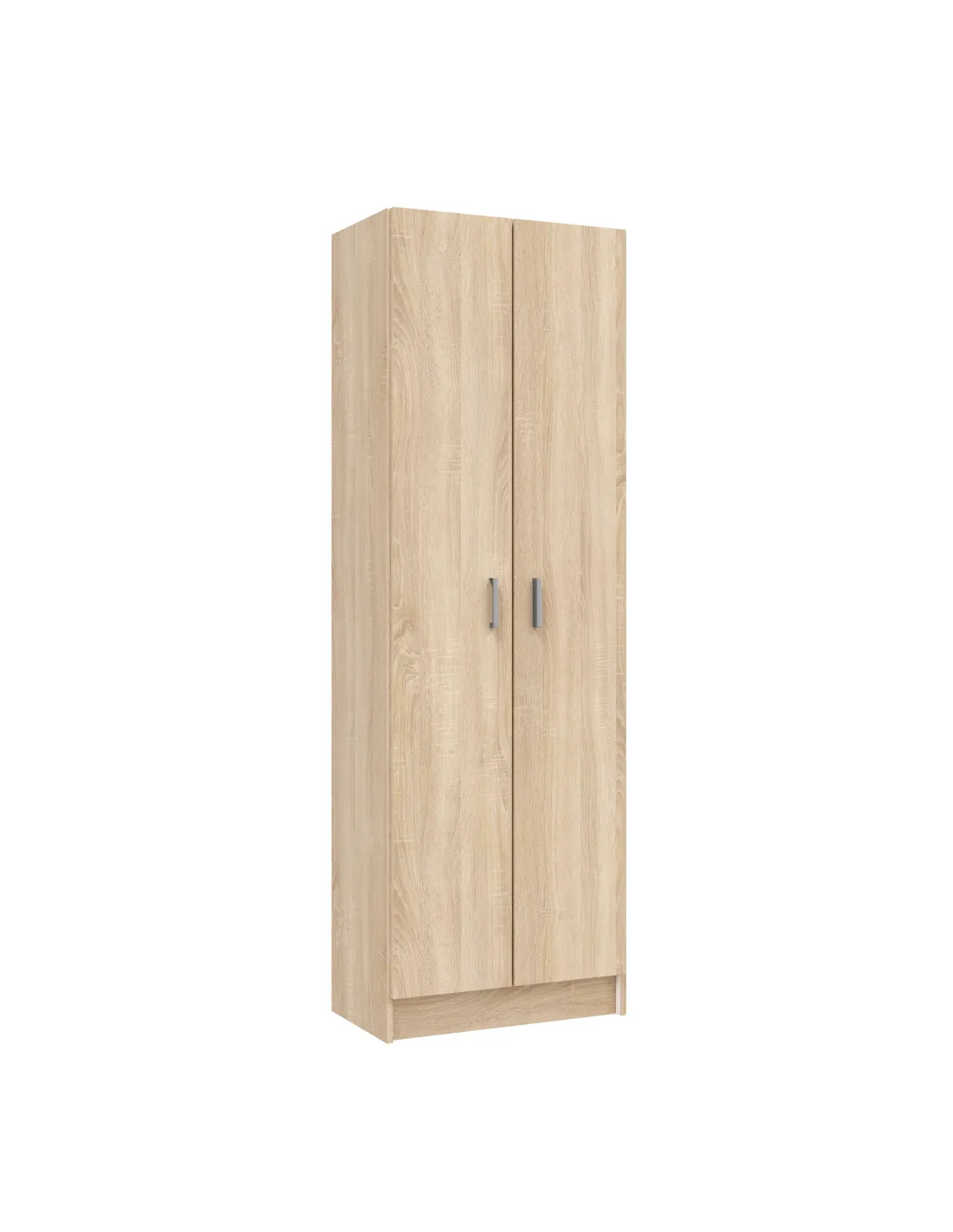 Armario de 2 puertas con 5 estantes regulables. Dispone de cinco estantes con varias posiciones en altura, bisagras metálicas y soporte de estantes metálicos. Incluye tirador ABS en gris aluminio y tacos ABS quitarruidos y antirayas.