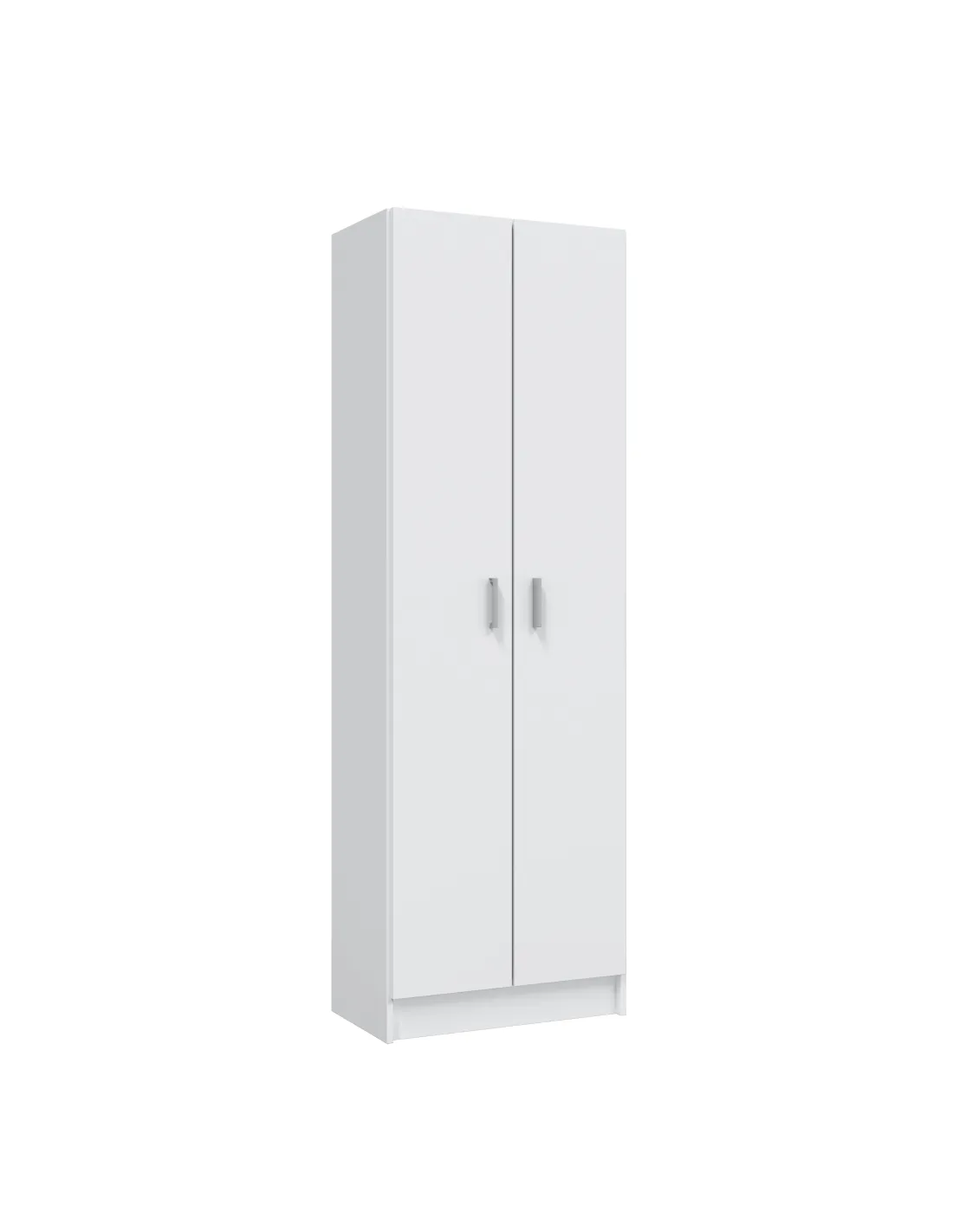 Armario de 2 puertas con 5 estantes regulables. Dispone de cinco estantes con varias posiciones en altura, bisagras metálicas y soporte de estantes metálicos. Incluye tirador ABS en gris aluminio y tacos ABS quitarruidos y antirayas.