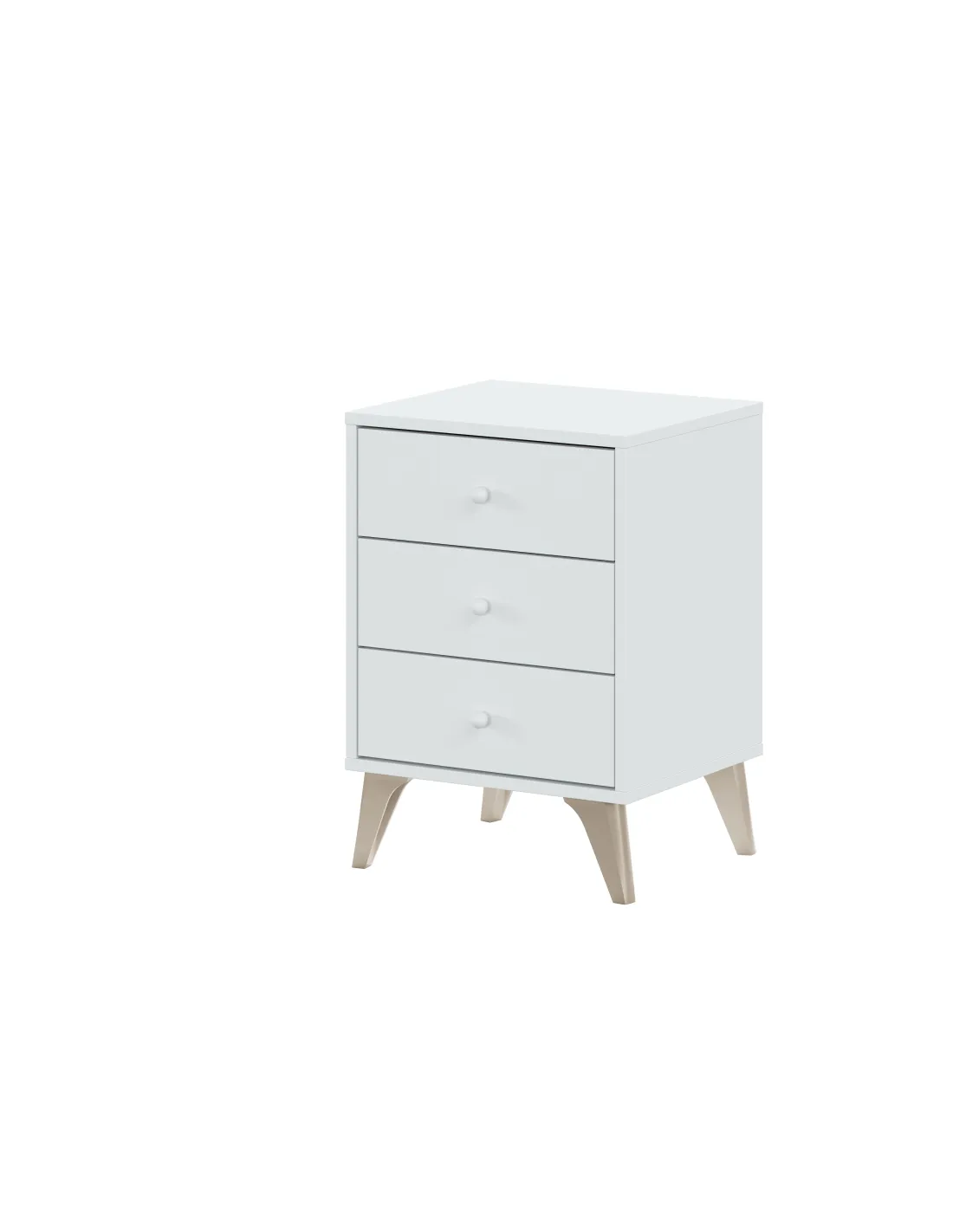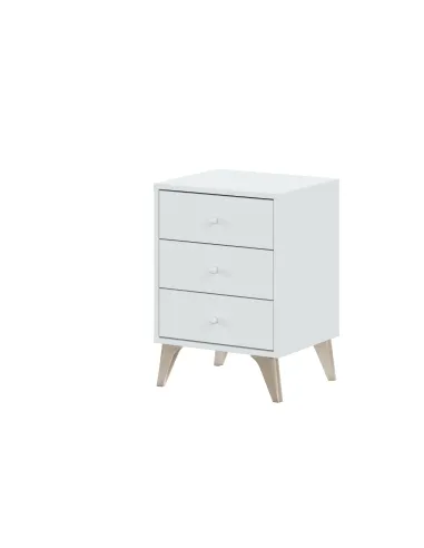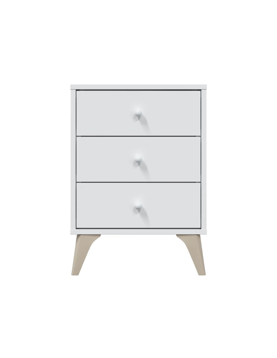 Mesita de 3 cajones. Incorpora guías correderas metálicas para los cajones (no extraíbles), patas ABS en color marrón y tiradores bola ABS pintados en color blanco.