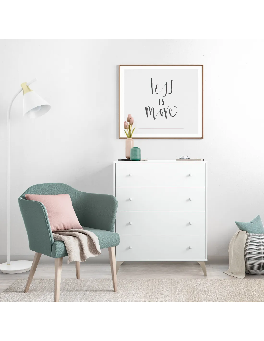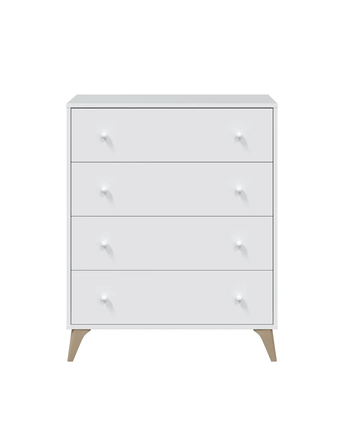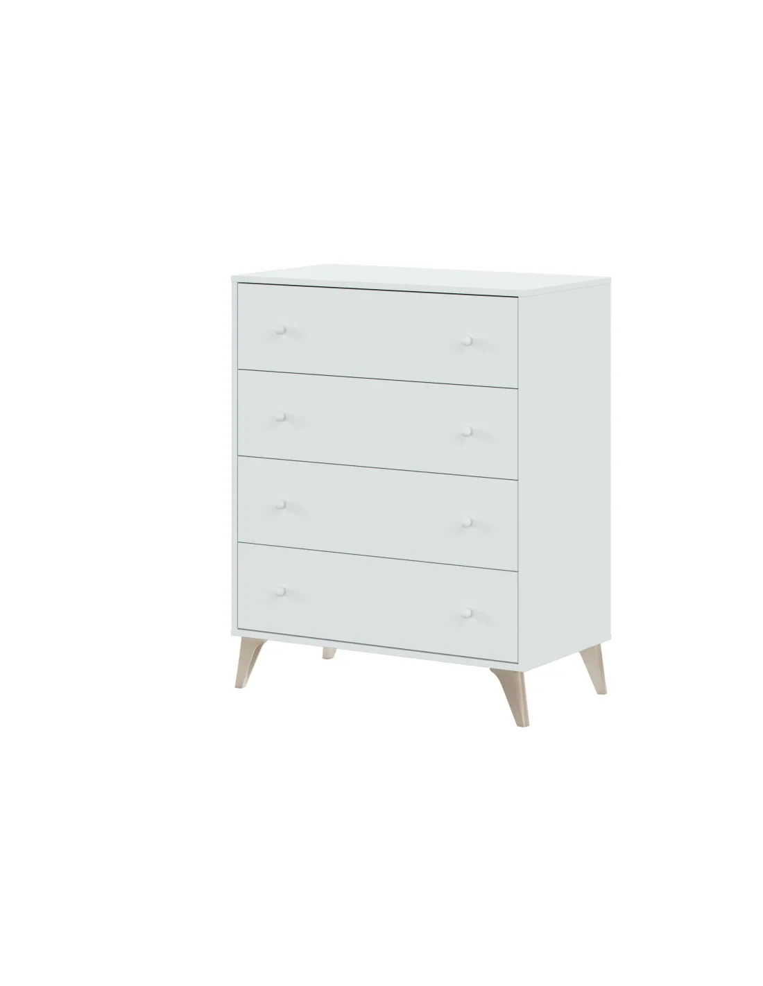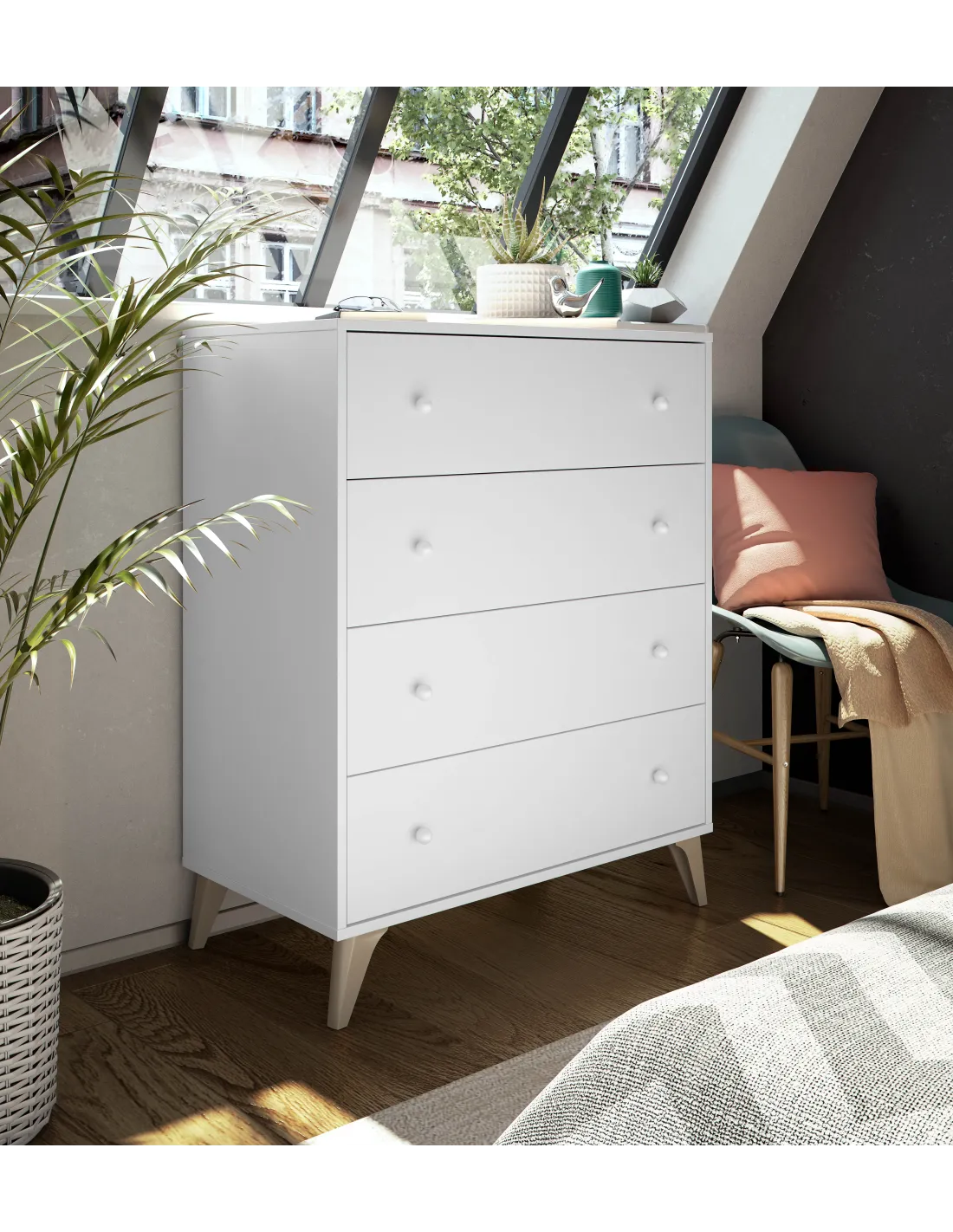 Cómoda de 4 cajones. Equipada con guías correderas metálicas para los cajones (no extraíbles), patas ABS en color marrón y tiradores bola ABS pintados en color blanco.