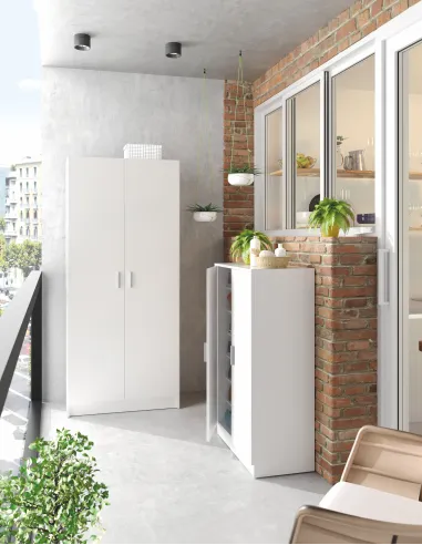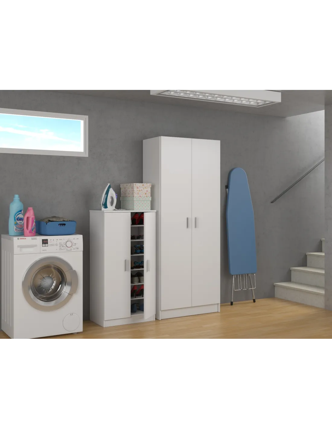 Mueble zapatero-armario de 2 puertas con 6 estantes. Incorpora estantes sueltos con posibilidad de extracción, bisagras metálicas, soporte de estantes metálicos y tiradores ABS en gris aluminio.