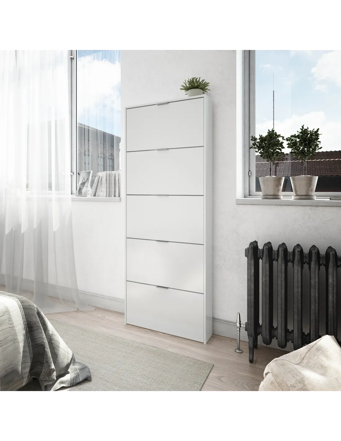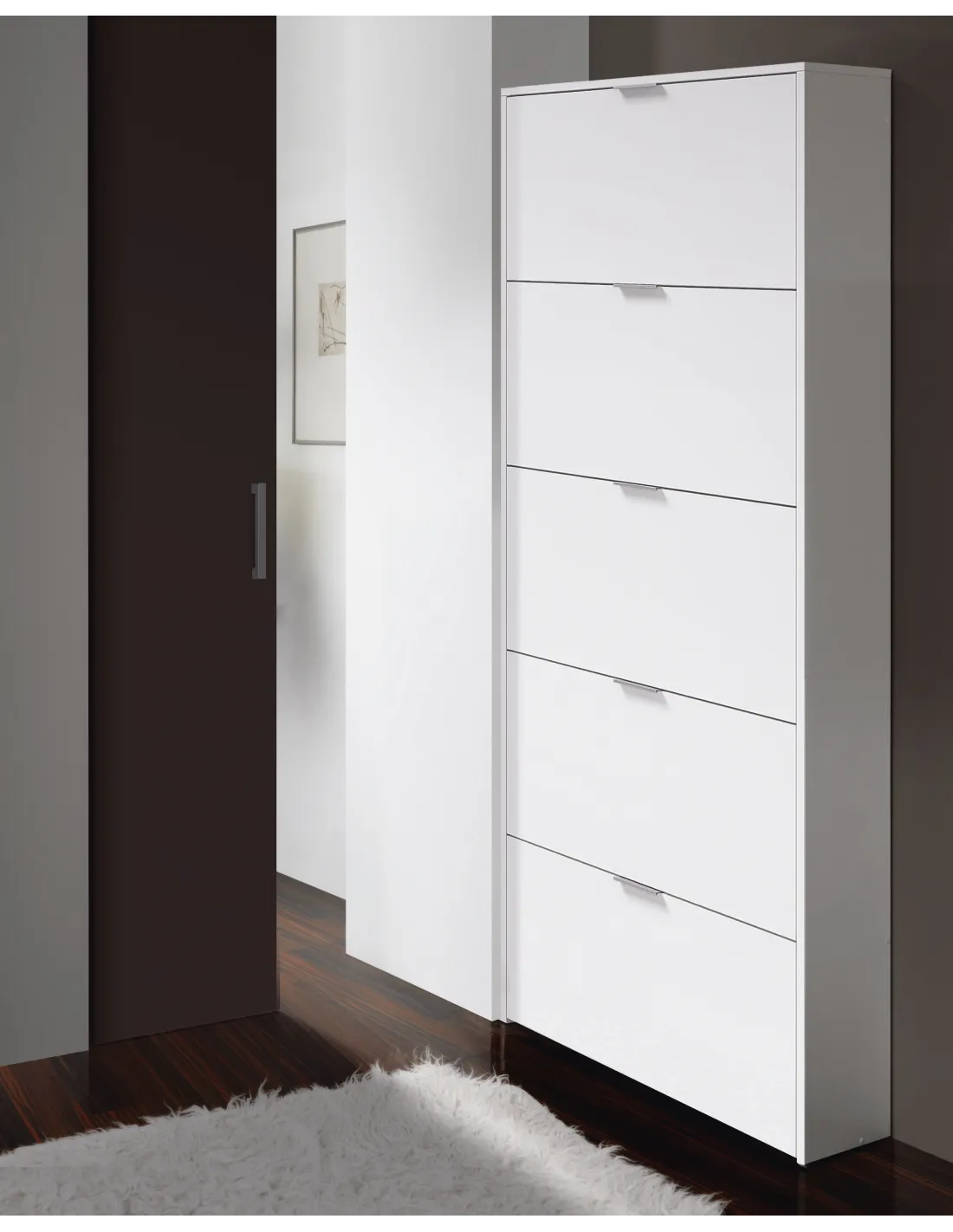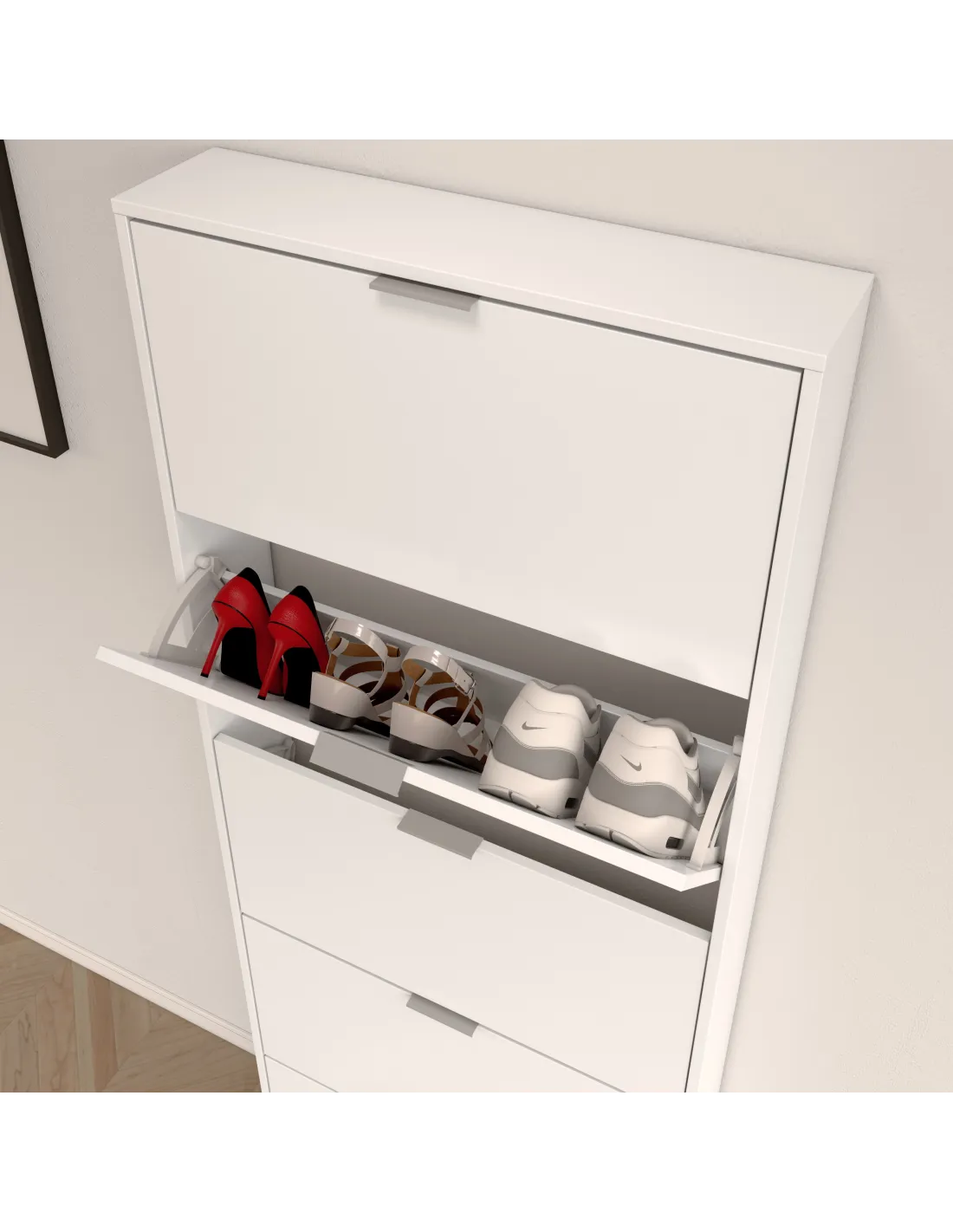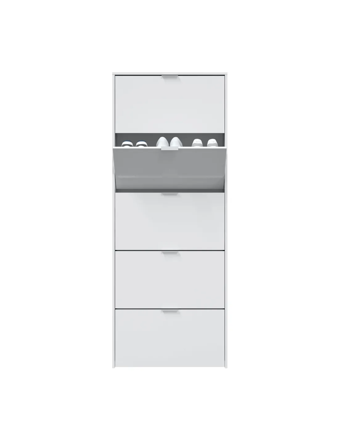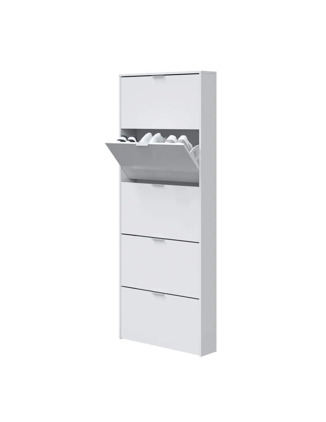 Zapatero de 5 puertas abatibles. Capacidad aproximada para 15 pares de zapatos. Incorpora sistema abatible ABS con una bandeja por puerta, tiradores de aluminio e interior en blanco.