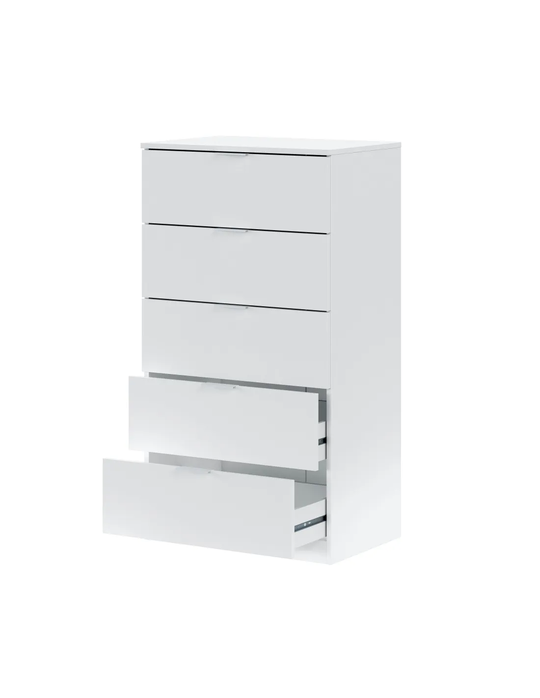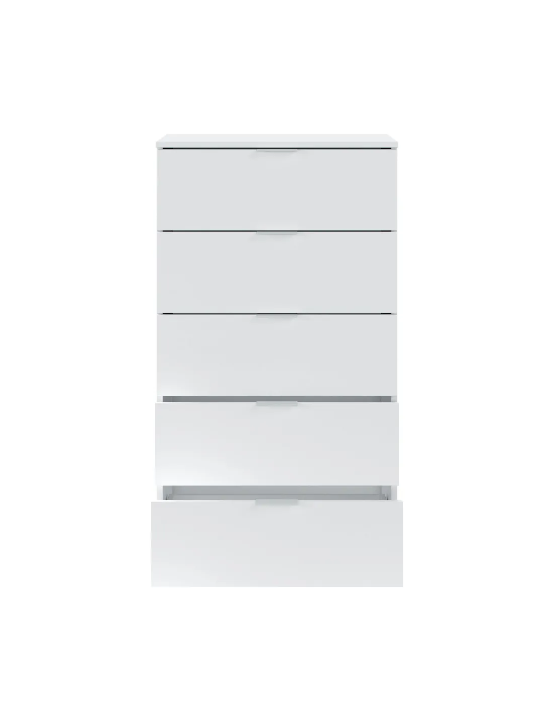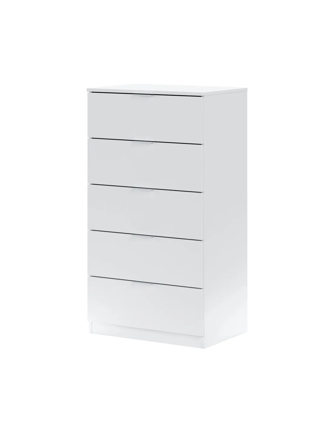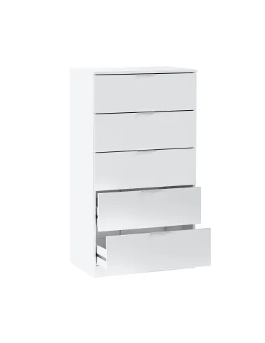 Cómoda de 5 cajones. Equipada con guías correderas metálicas para los cajones (no extraíbles), tiradores de aluminio lacados en blanco y tacos ABS quitarruidos y antirayas.