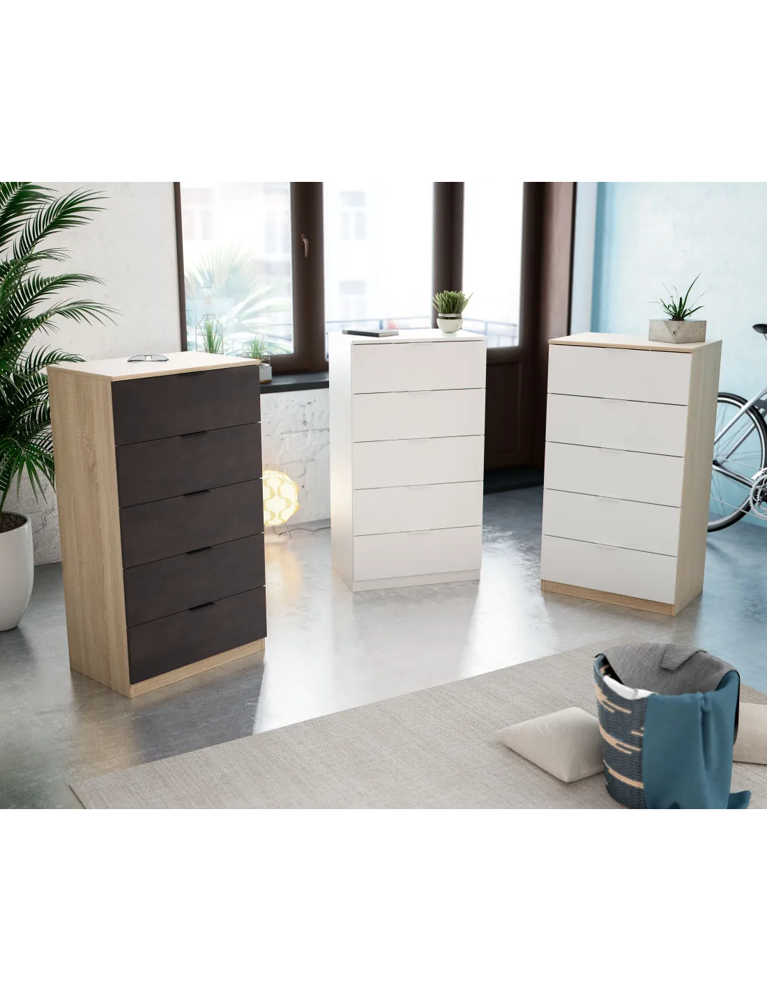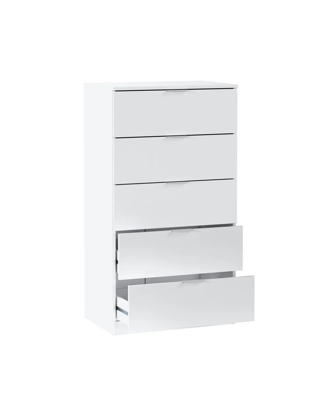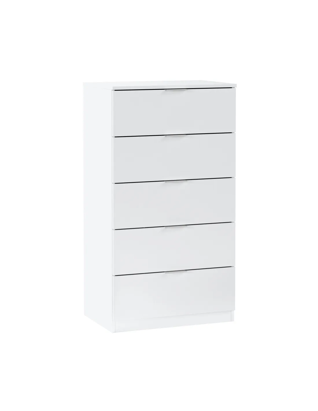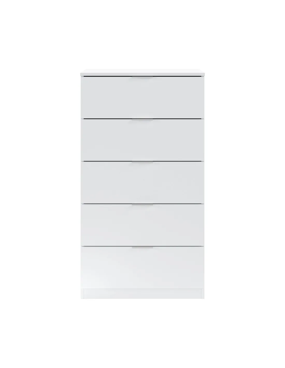 Cómoda de 5 cajones. Equipada con guías correderas metálicas para los cajones (no extraíbles), tiradores de aluminio lacados en blanco y tacos ABS quitarruidos y antirayas.