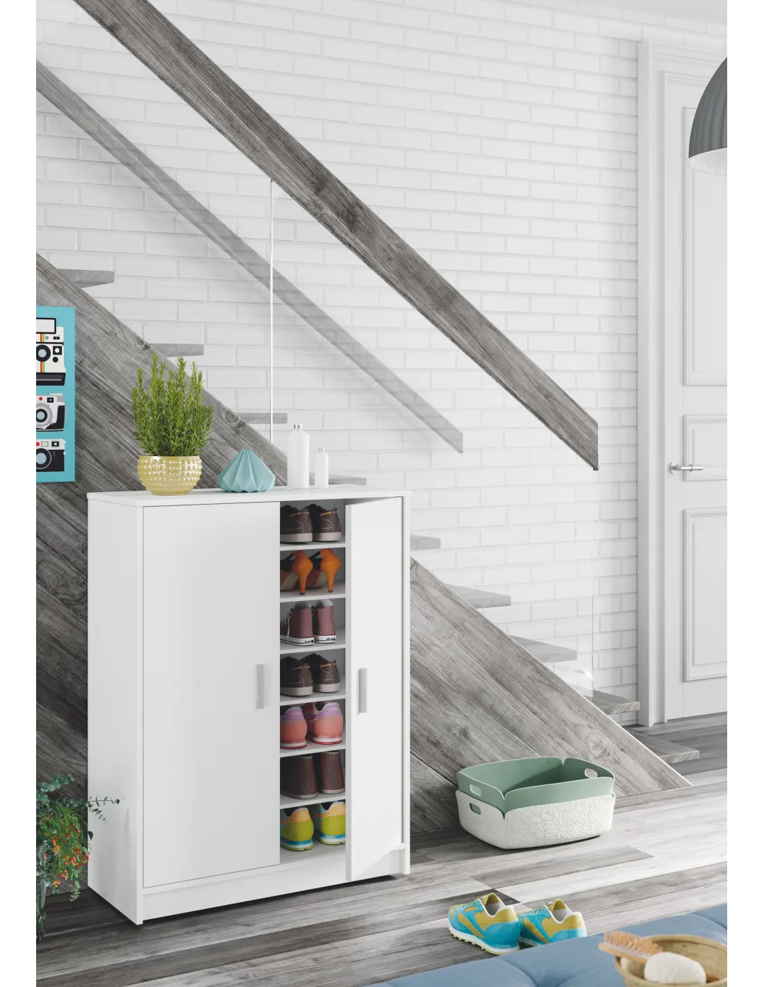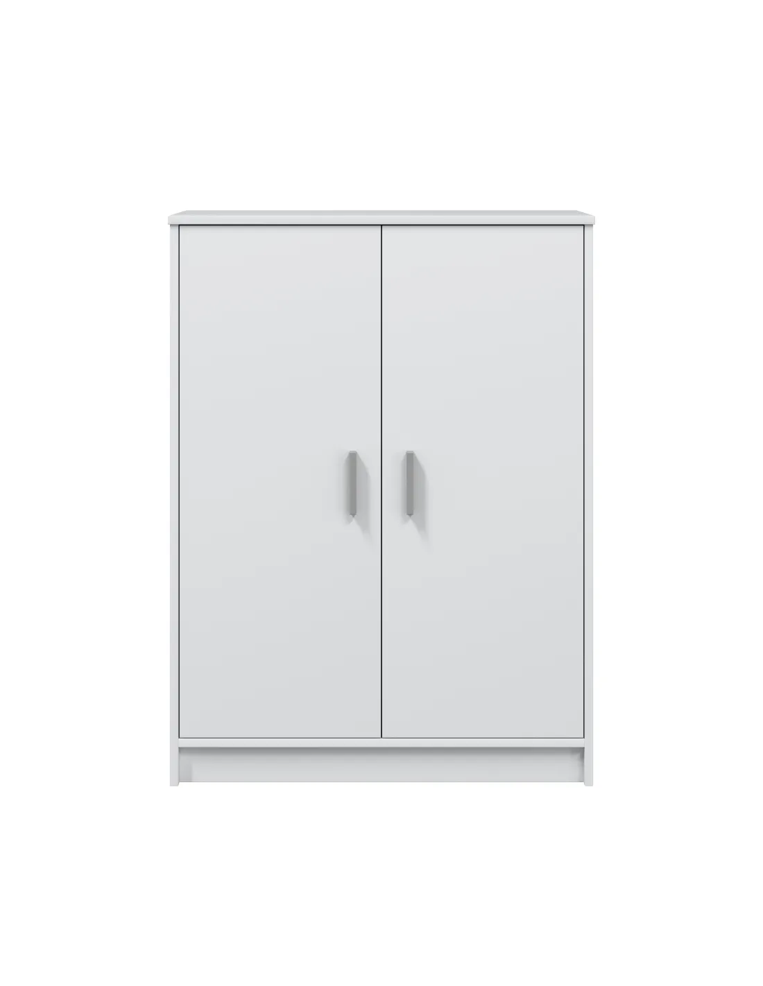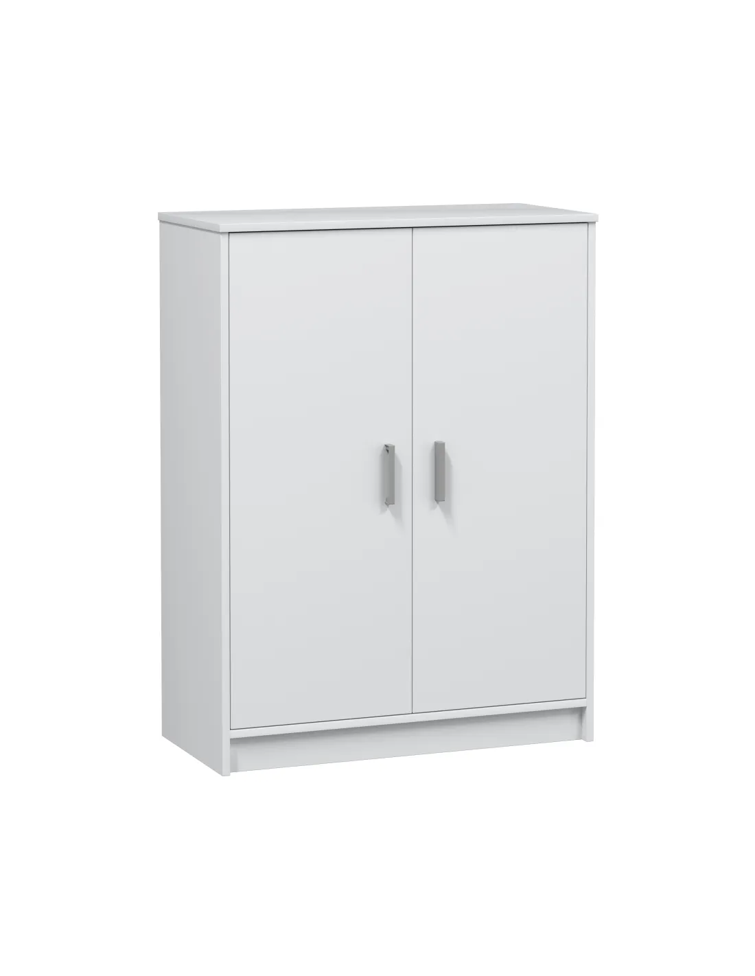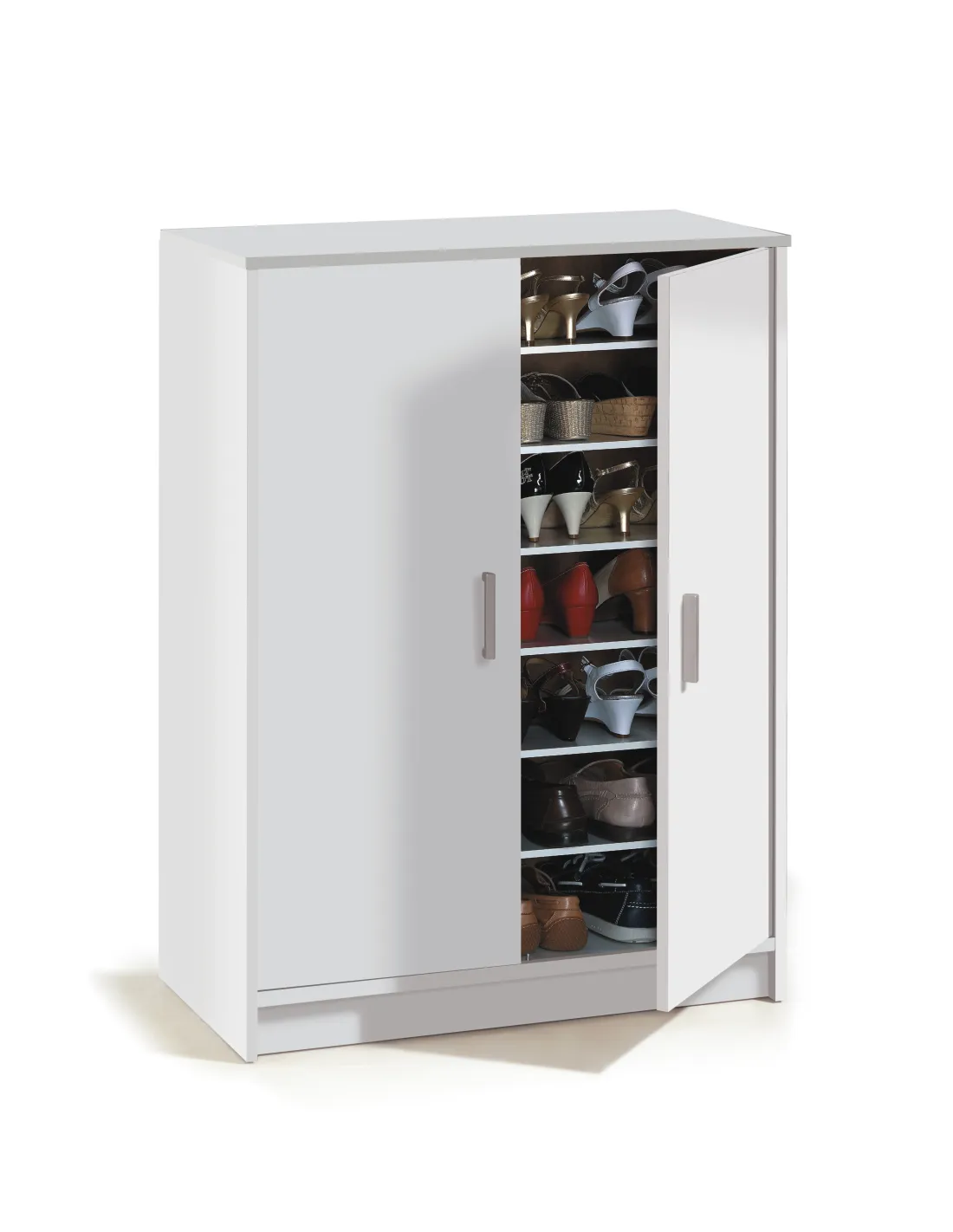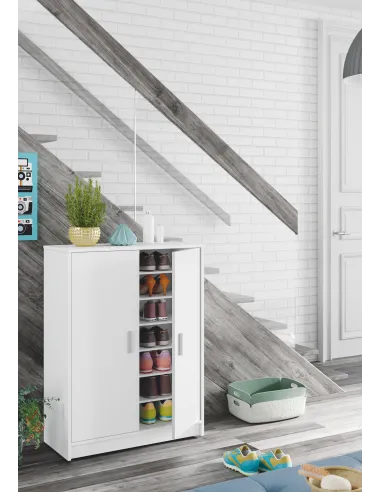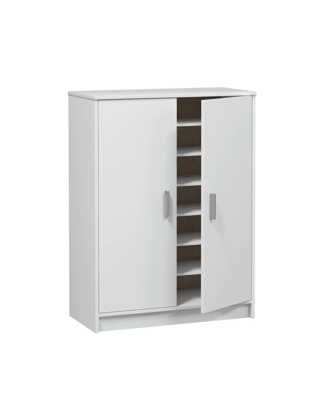Mueble zapatero de 2 puertas con 6 estantes. Incorpora bisagras metálicas, soporte de estantes metálicos y estantes sueltos con varias posiciones en altura. Incluye tiradores ABS en gris aluminio.