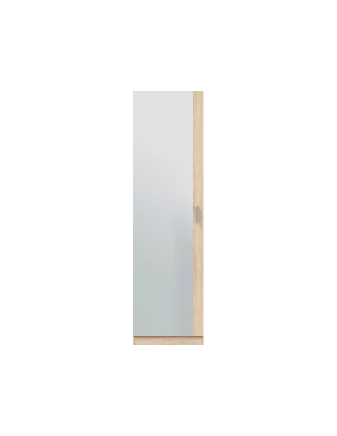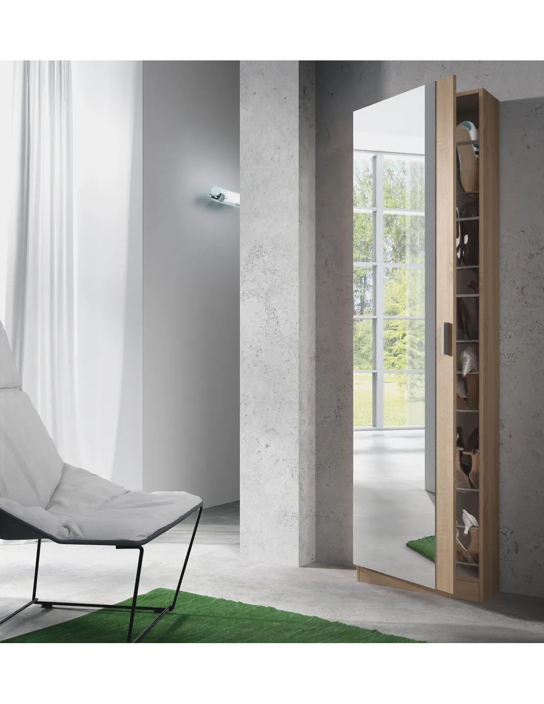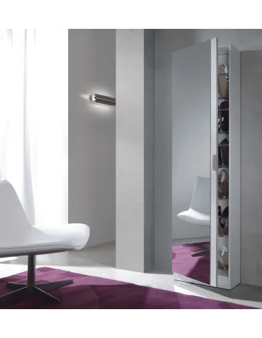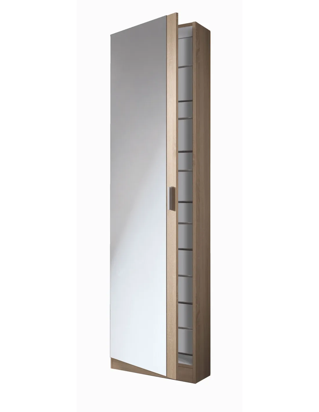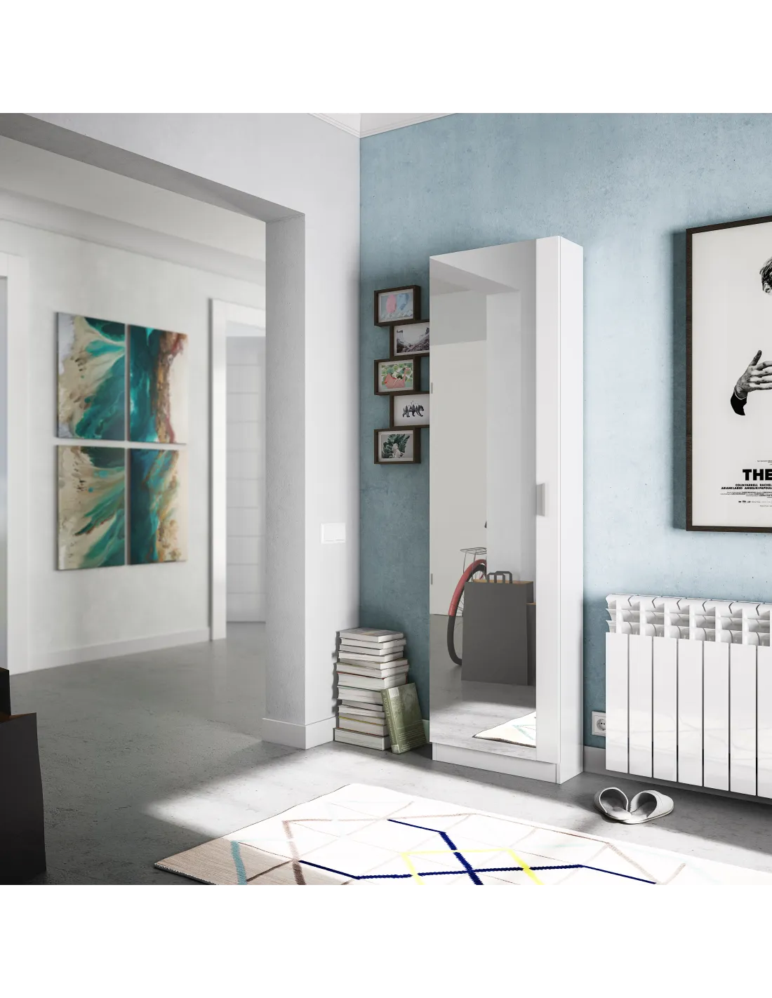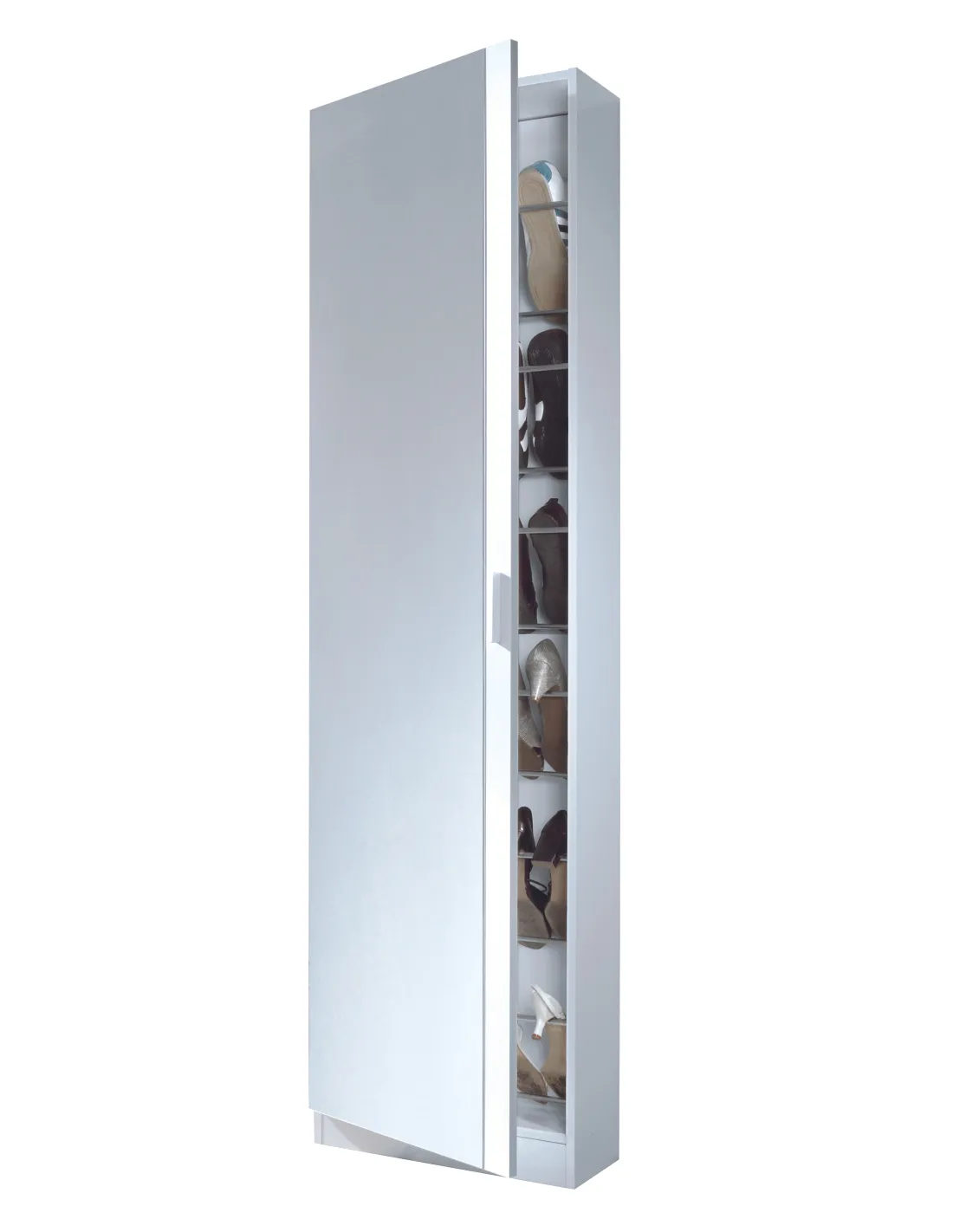 Zapatero de 1 puerta con espejo. Capacidad aproximada para 16 pares de zapatos. Incorpora varillas tubulares de aluminio para el soporte del calzado, bisagras metálicas y cierre mediante imán.