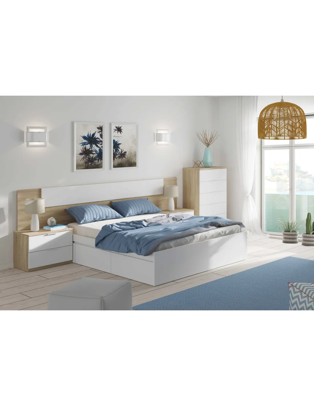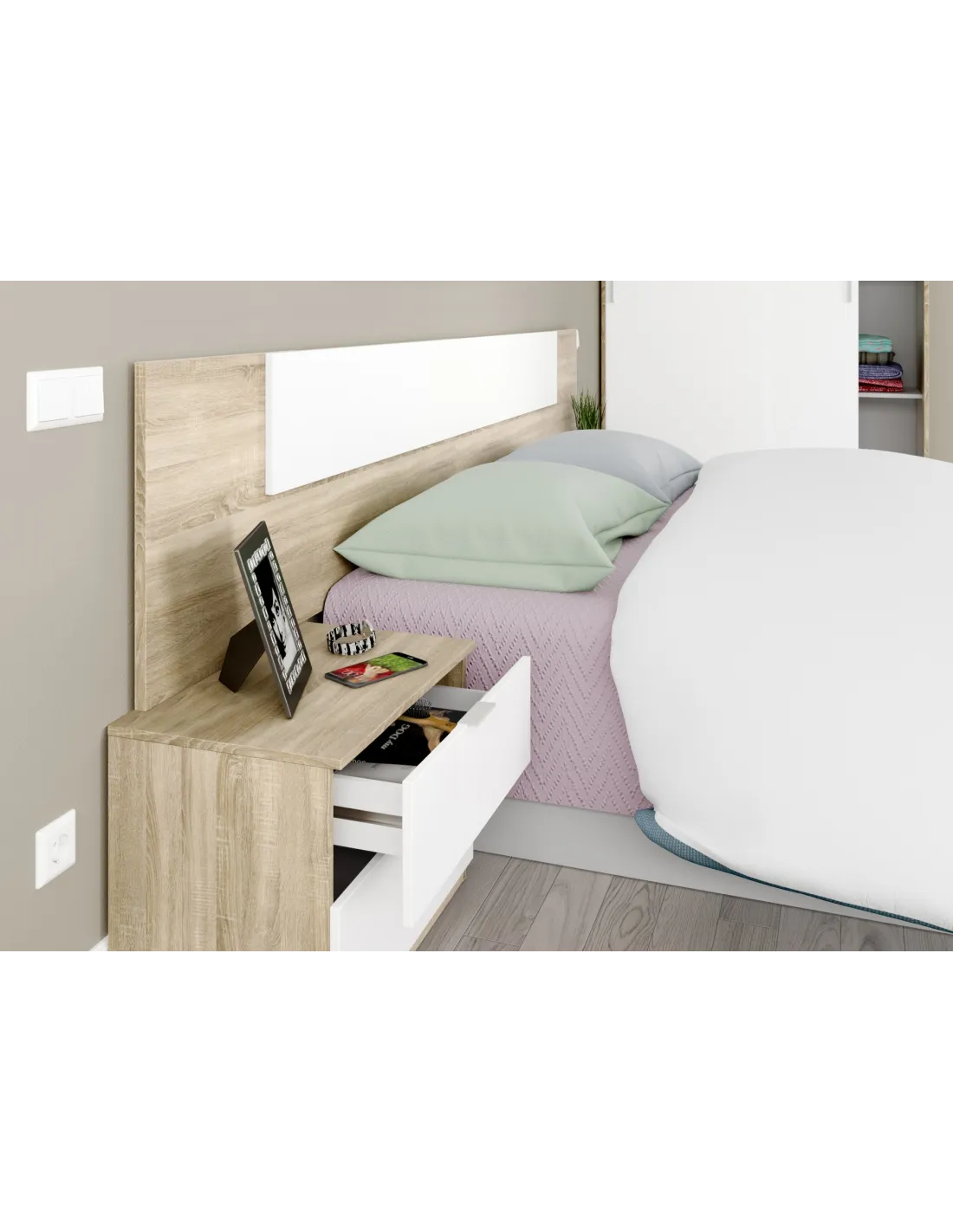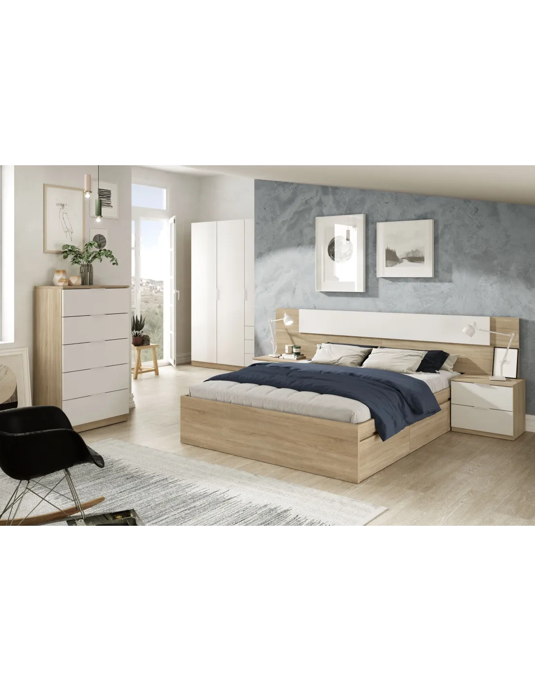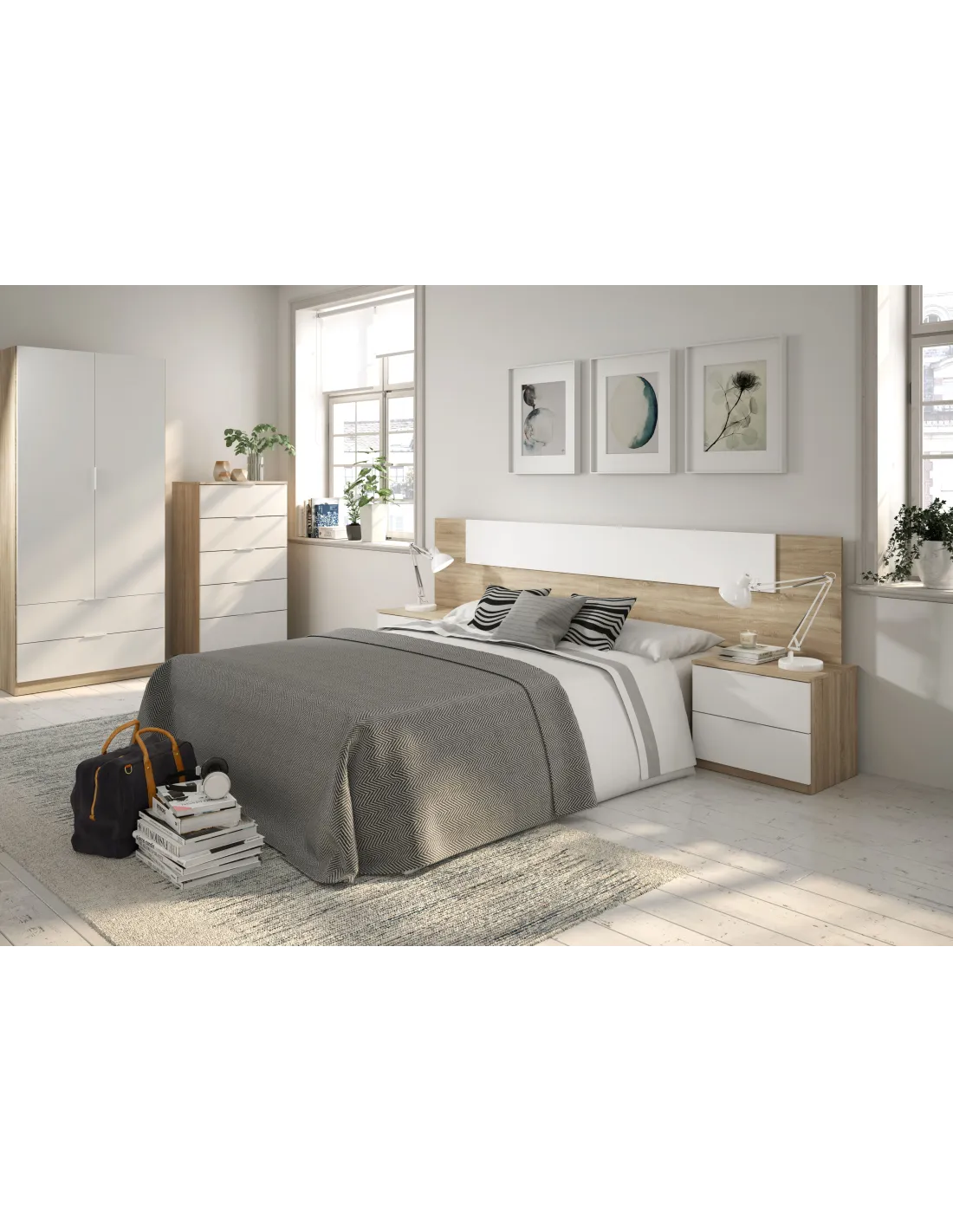Cabezal para cama de 150cm con dos mesitas de dos cajones cada una. Un conjunto práctico y funcional para completar el dormitorio.
