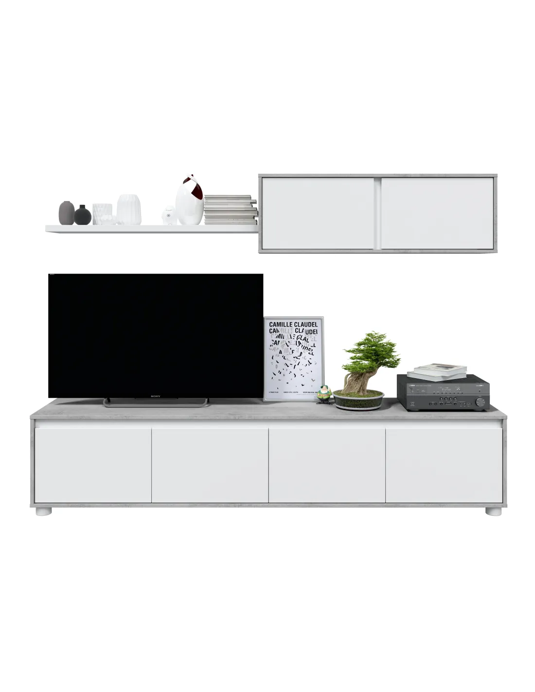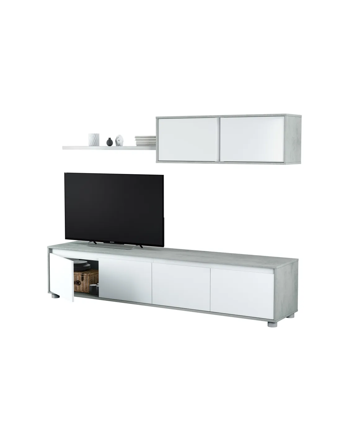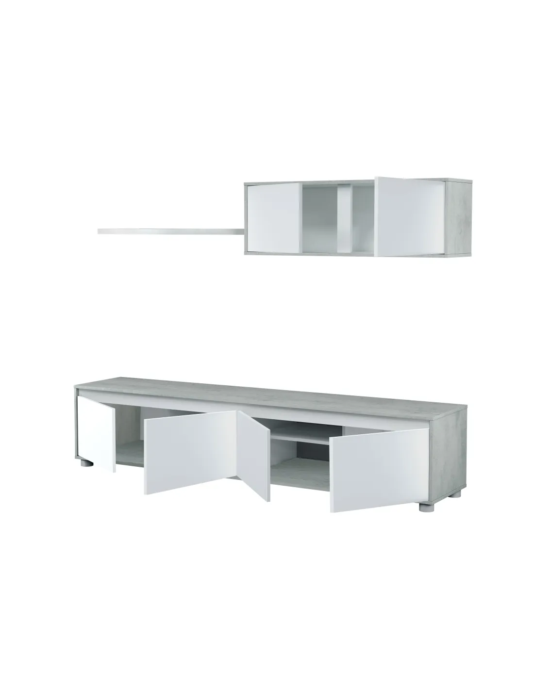 Conjunto para salón compuesto por mueble de televisión con 4 puertas, módulo superior de 2 puertas y estante de colgar. Diseño moderno y funcional con acabados combinables.