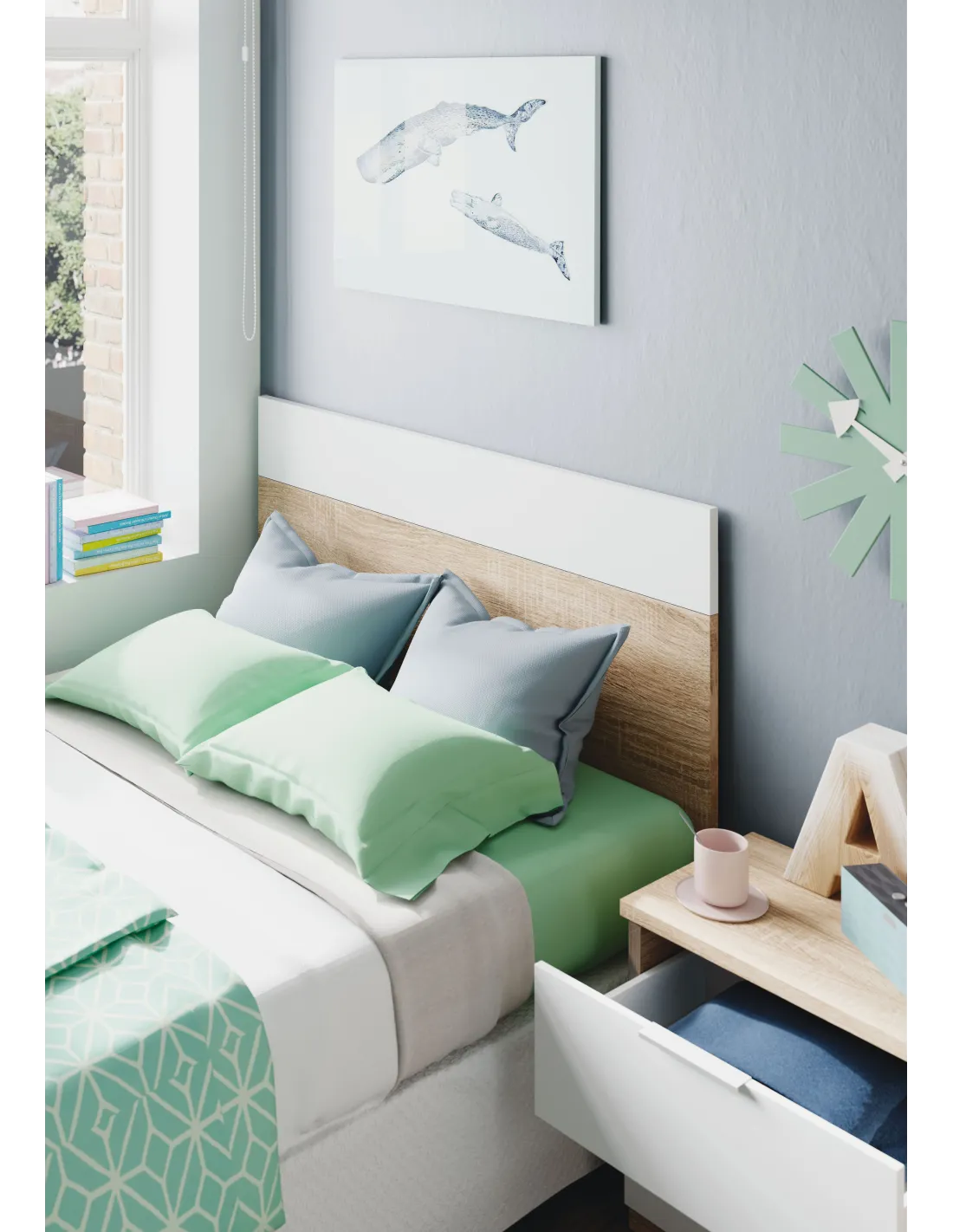 Conjunto compuesto por mesita de dos cajones y cabezal para cama de 90cm. Diseño funcional con fijación a pared y acabados combinables.