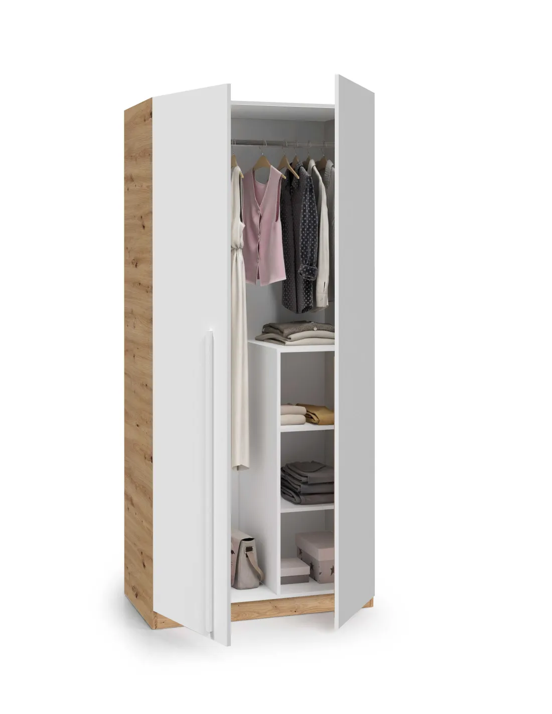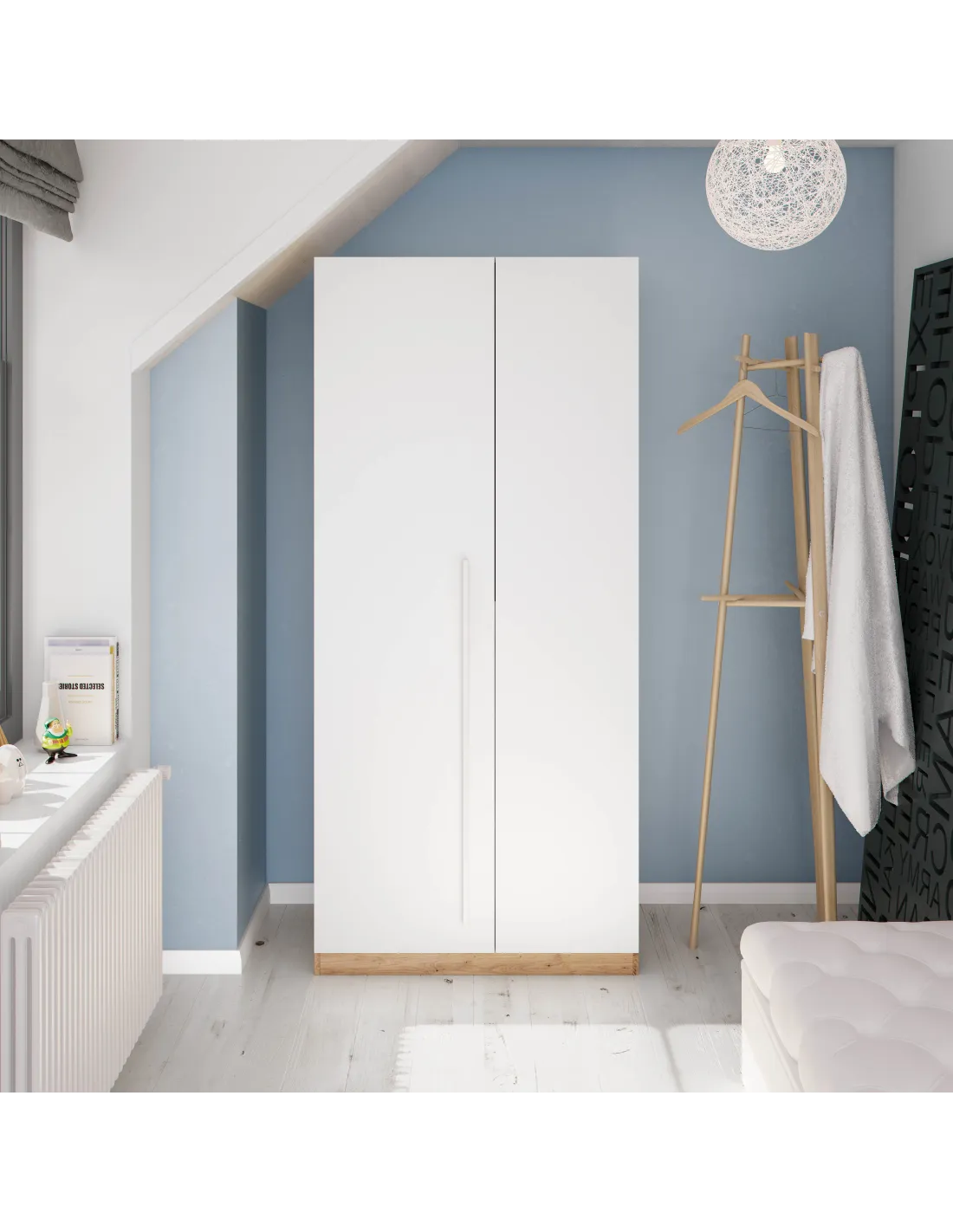 Armario juvenil de 2 puertas con barra de colgar y tres estantes interiores. Diseño funcional con interior en blanco y acabado combinado.