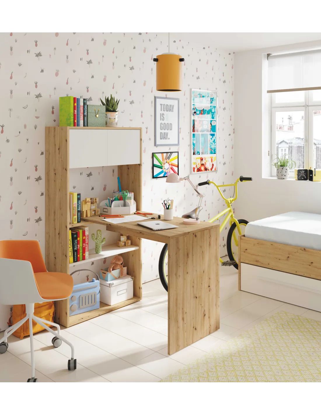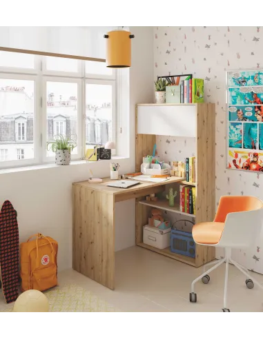 Mesa escritorio con estantes y dos puertas, reversible y con múltiples posiciones de montaje. Ideal para espacios de estudio modernos y funcionales.