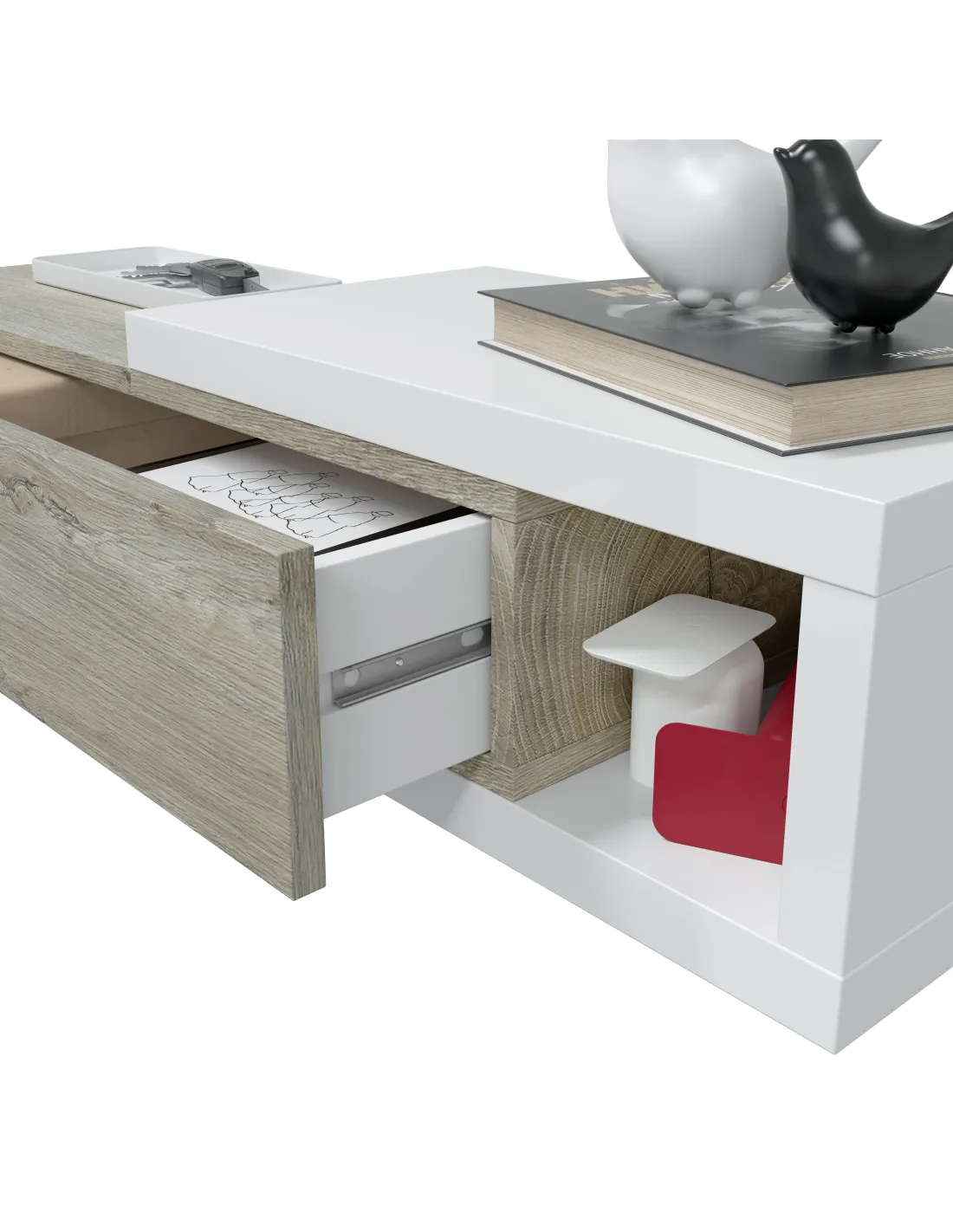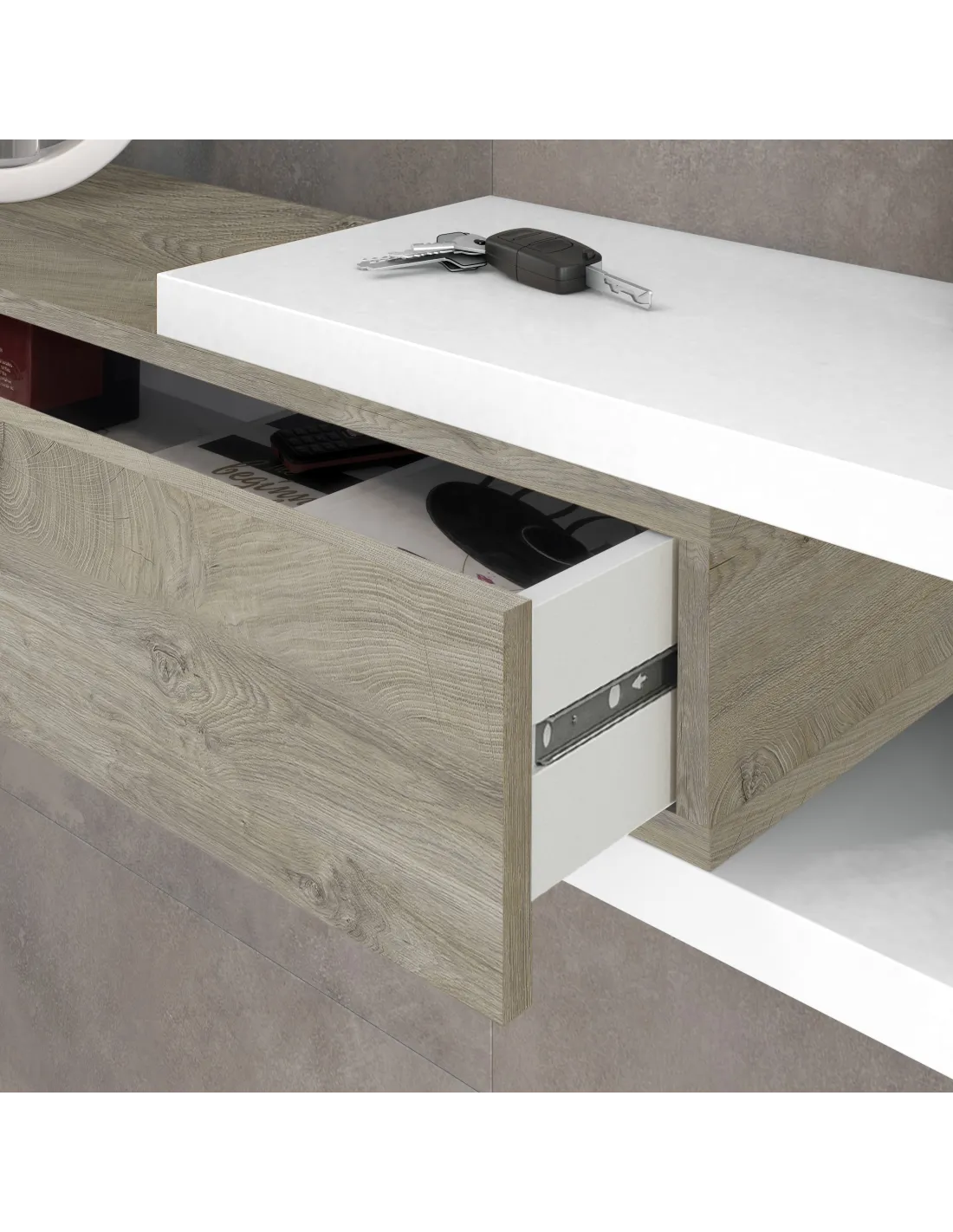Incluye guías correderas metálicas para el cajón (no extraíble) y escuadras metálicas para la fijación del mueble a la pared.