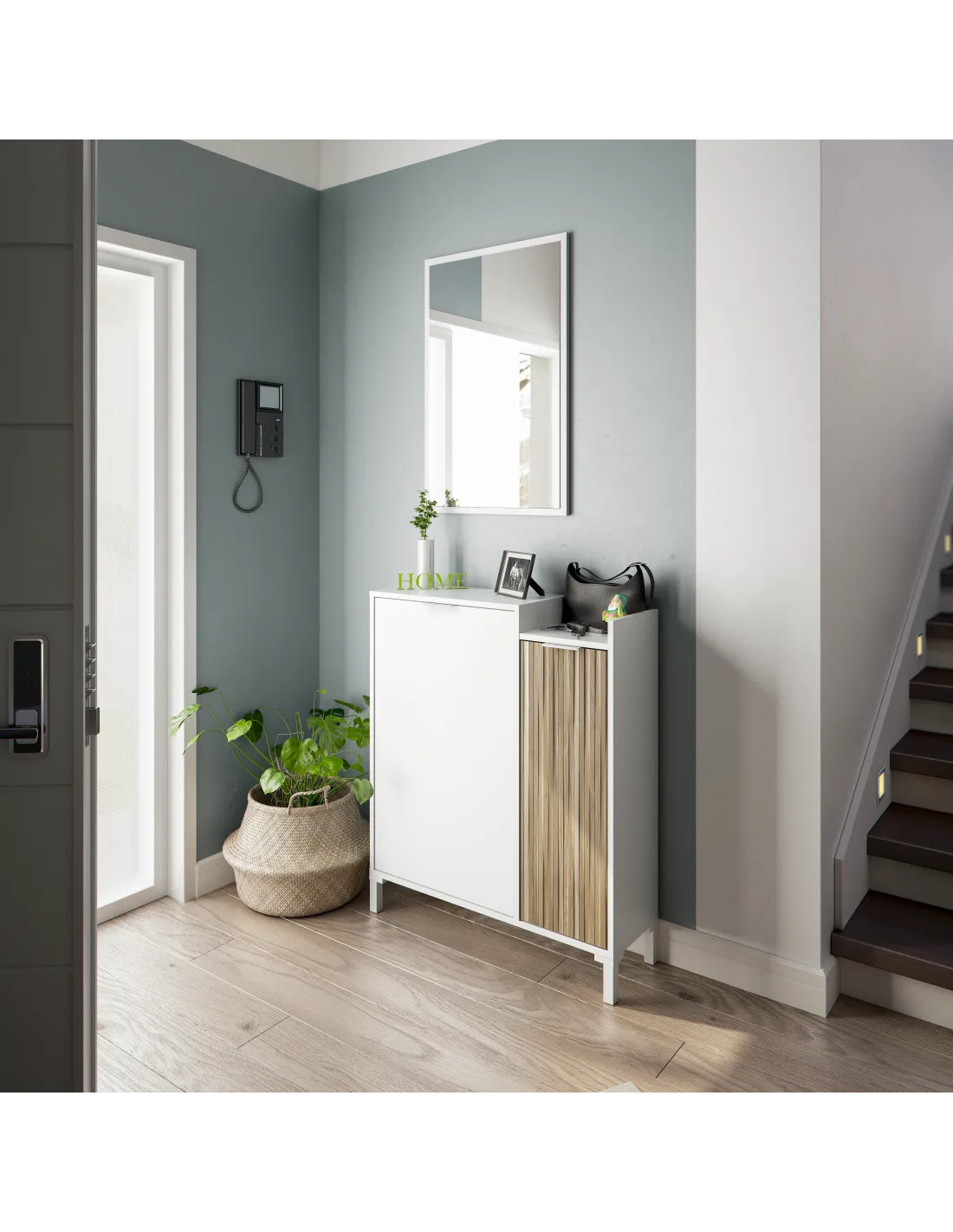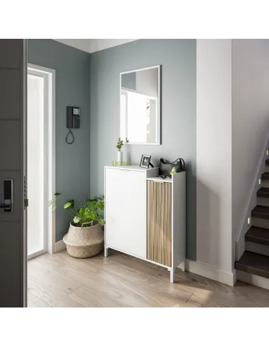 Recibidor de 2 puertas con espejo y patas, con huecos de almacenaje fijos y diseño moderno para entradas funcionales.