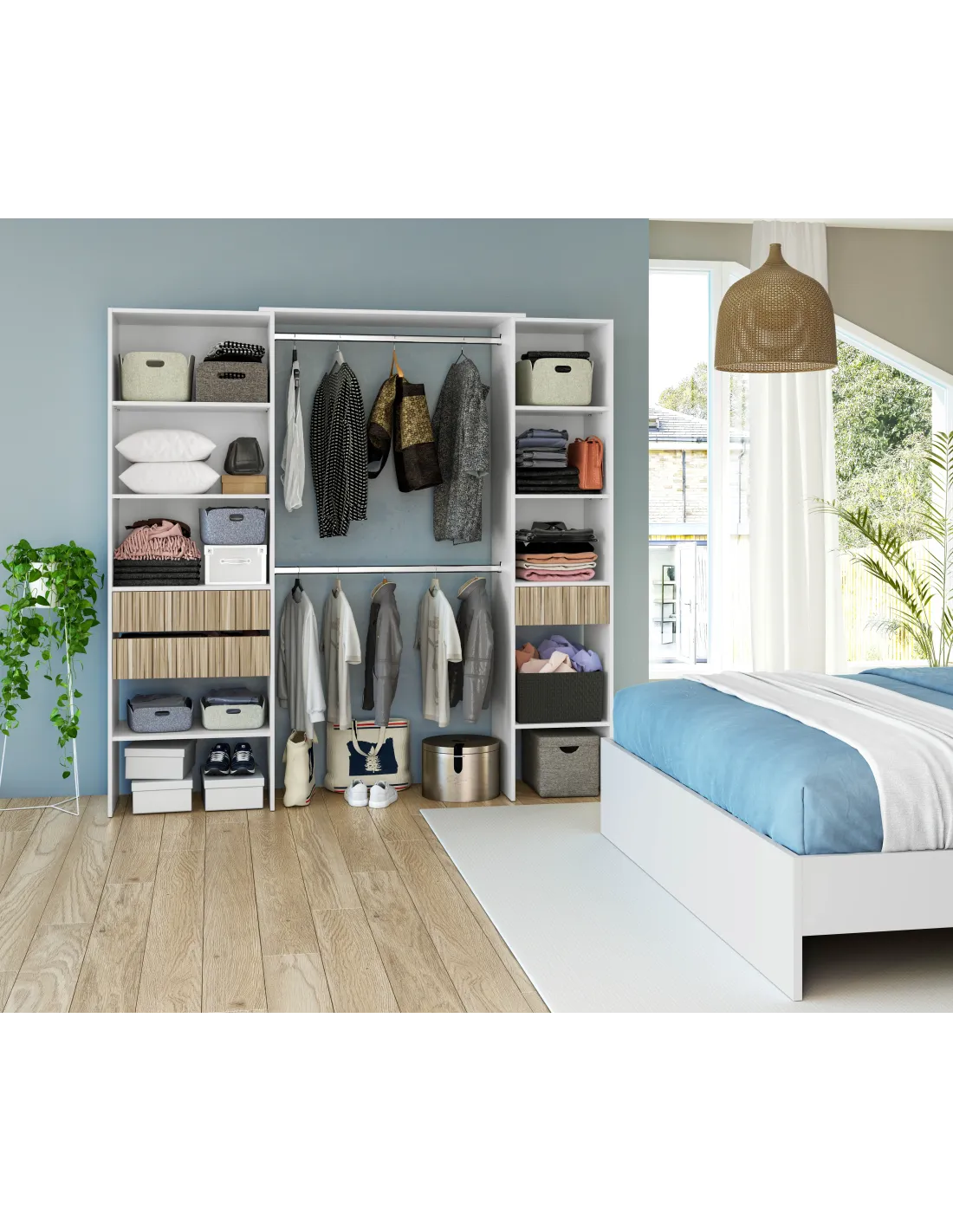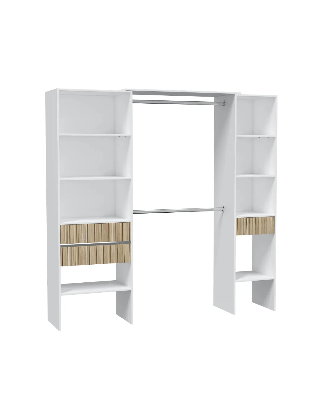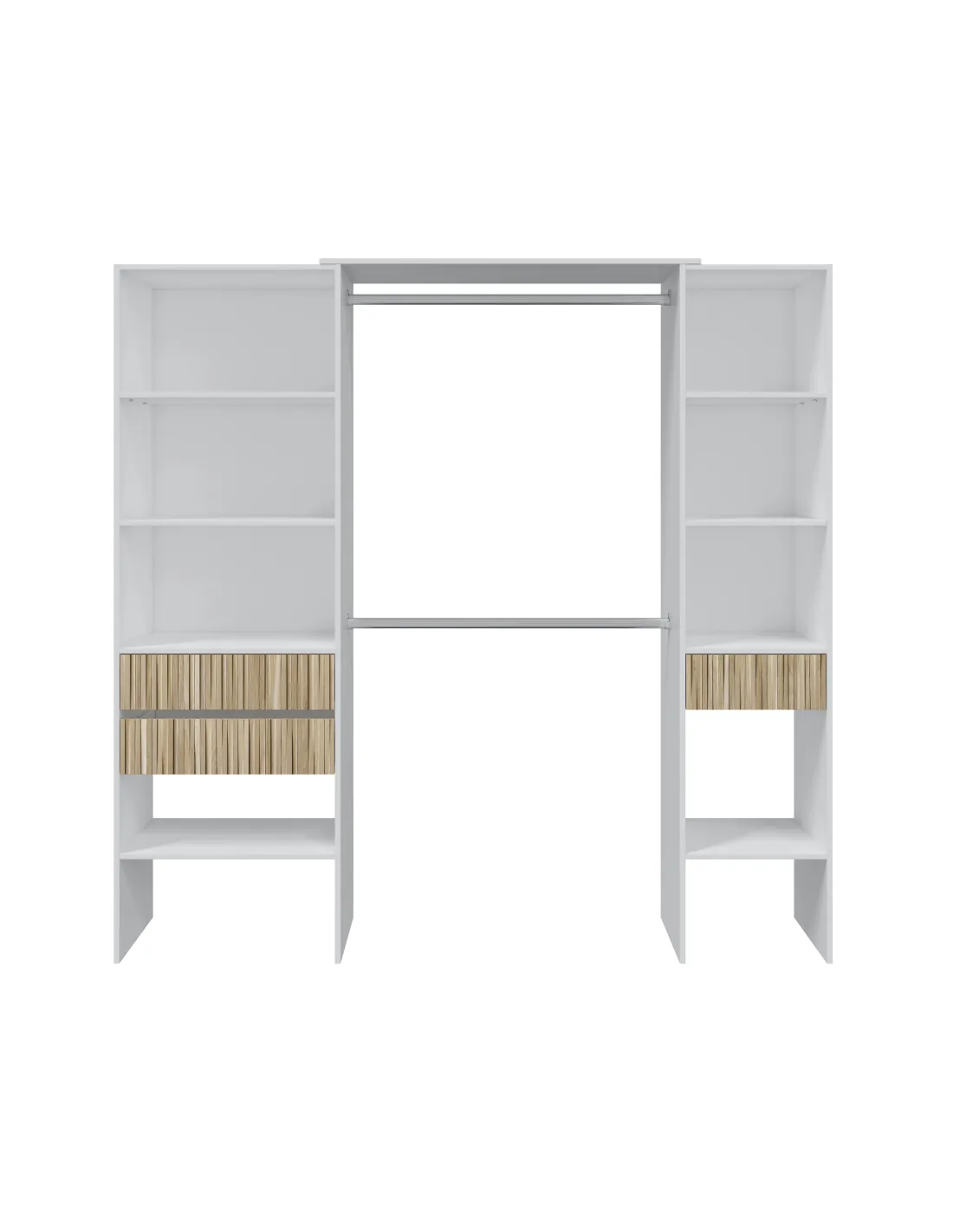 Armario-Vestidor TEMPUS con estantes, tres cajones y 2 barras de colgar, ideal para organizar ropa y complementos de forma práctica.