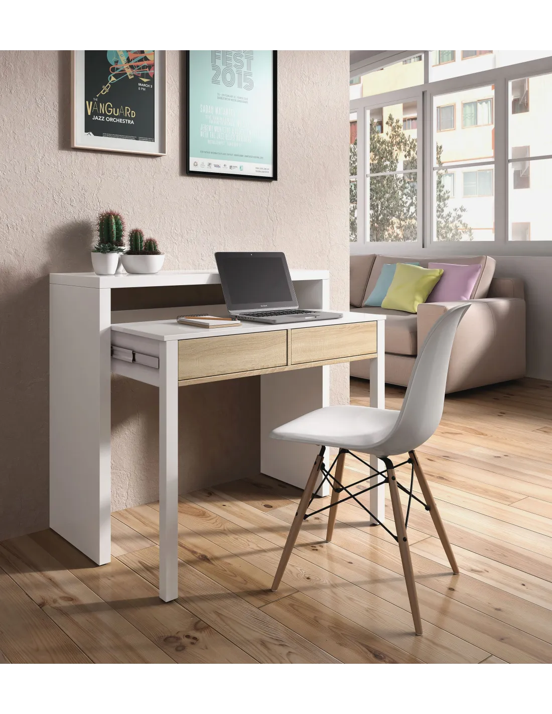Consola escritorio TYRION auxiliar extensible con 2 cajones, ideal para optimizar el espacio en salones, dormitorios o zonas de estudio.