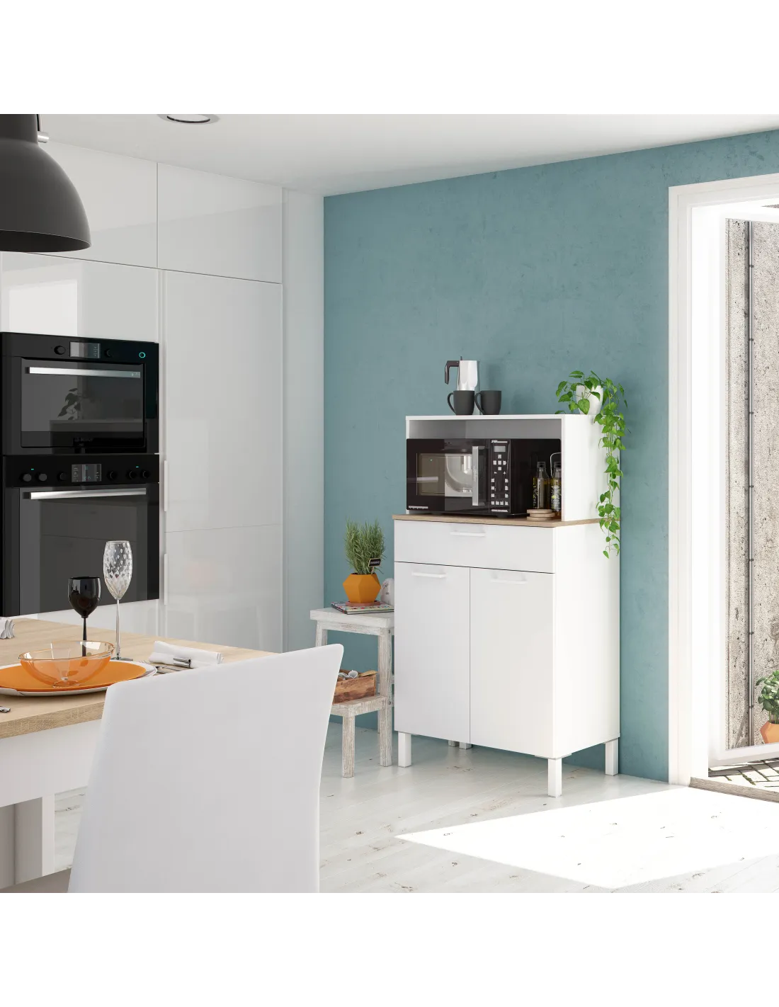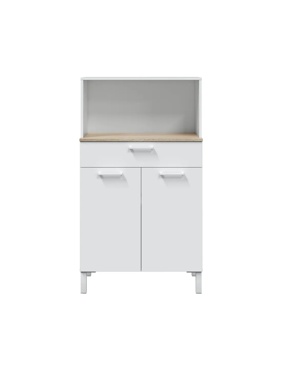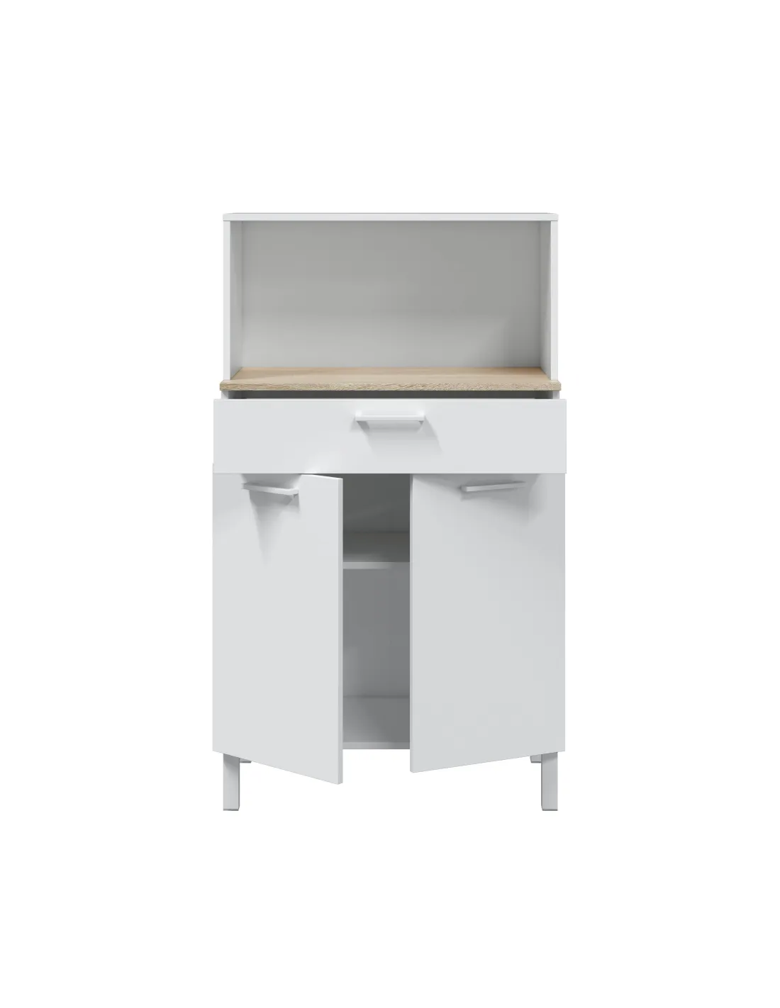 Incorpora patas de aluminio pintadas en blanco, tiradores ABS blancos y bisagras metálicas para las puertas.