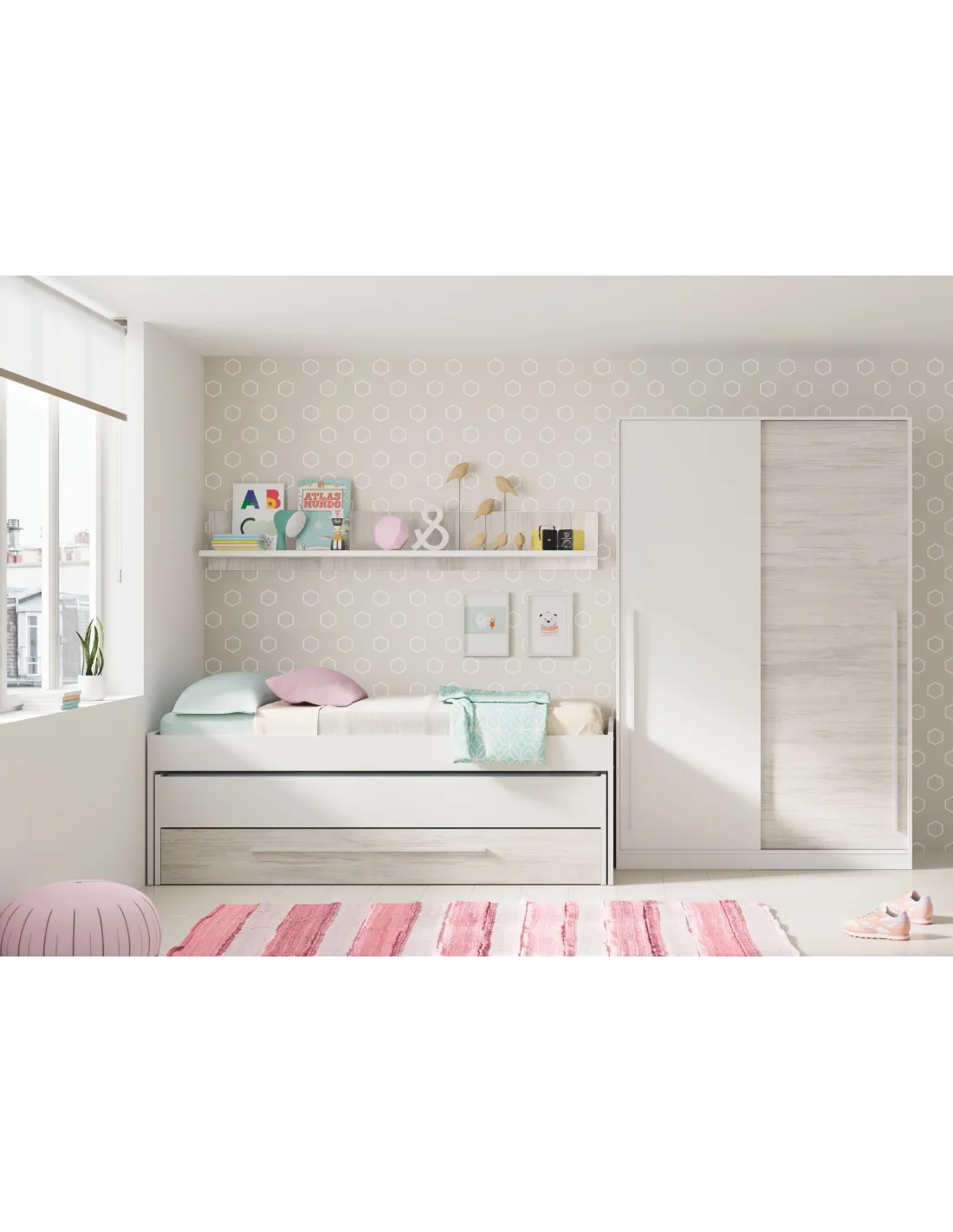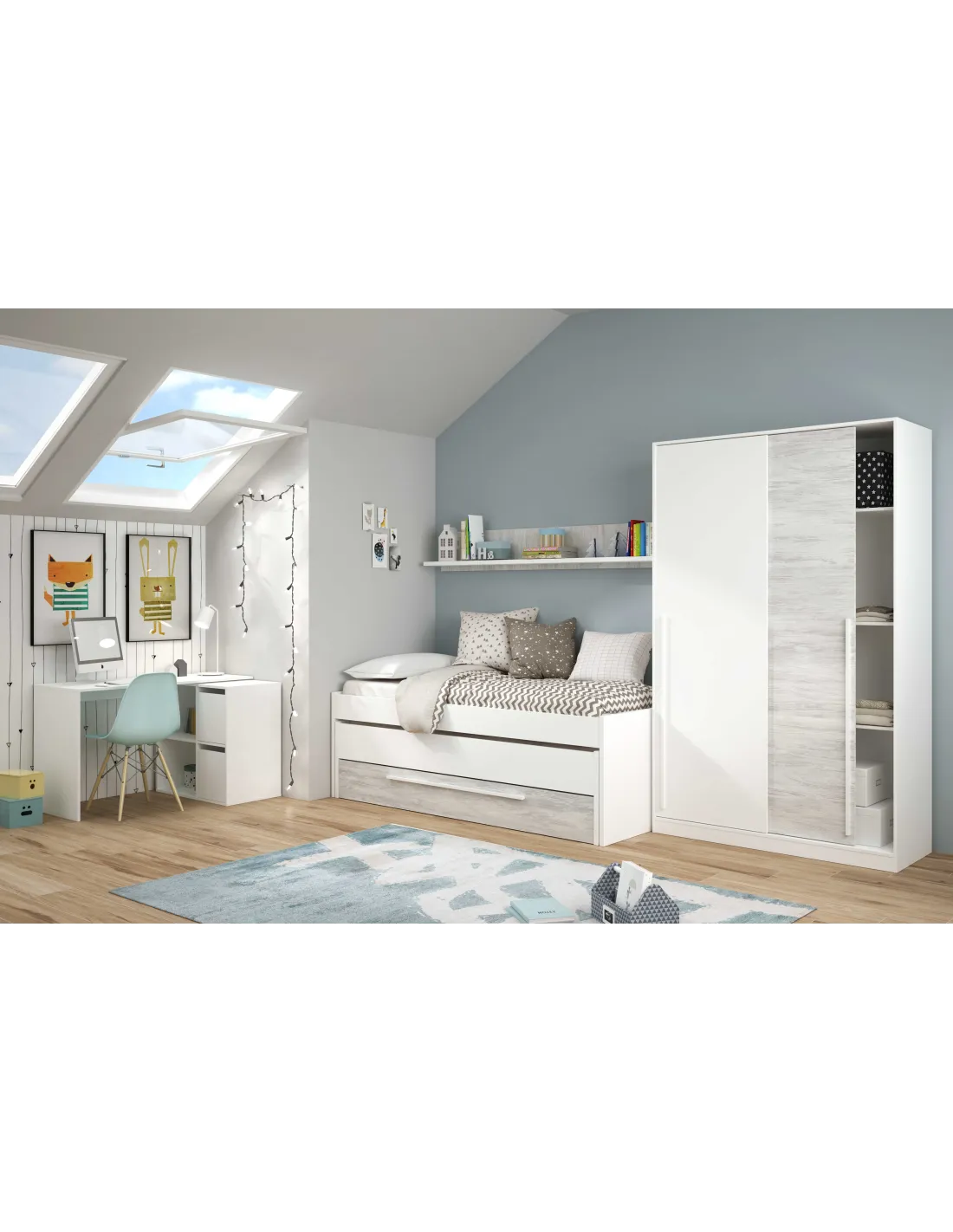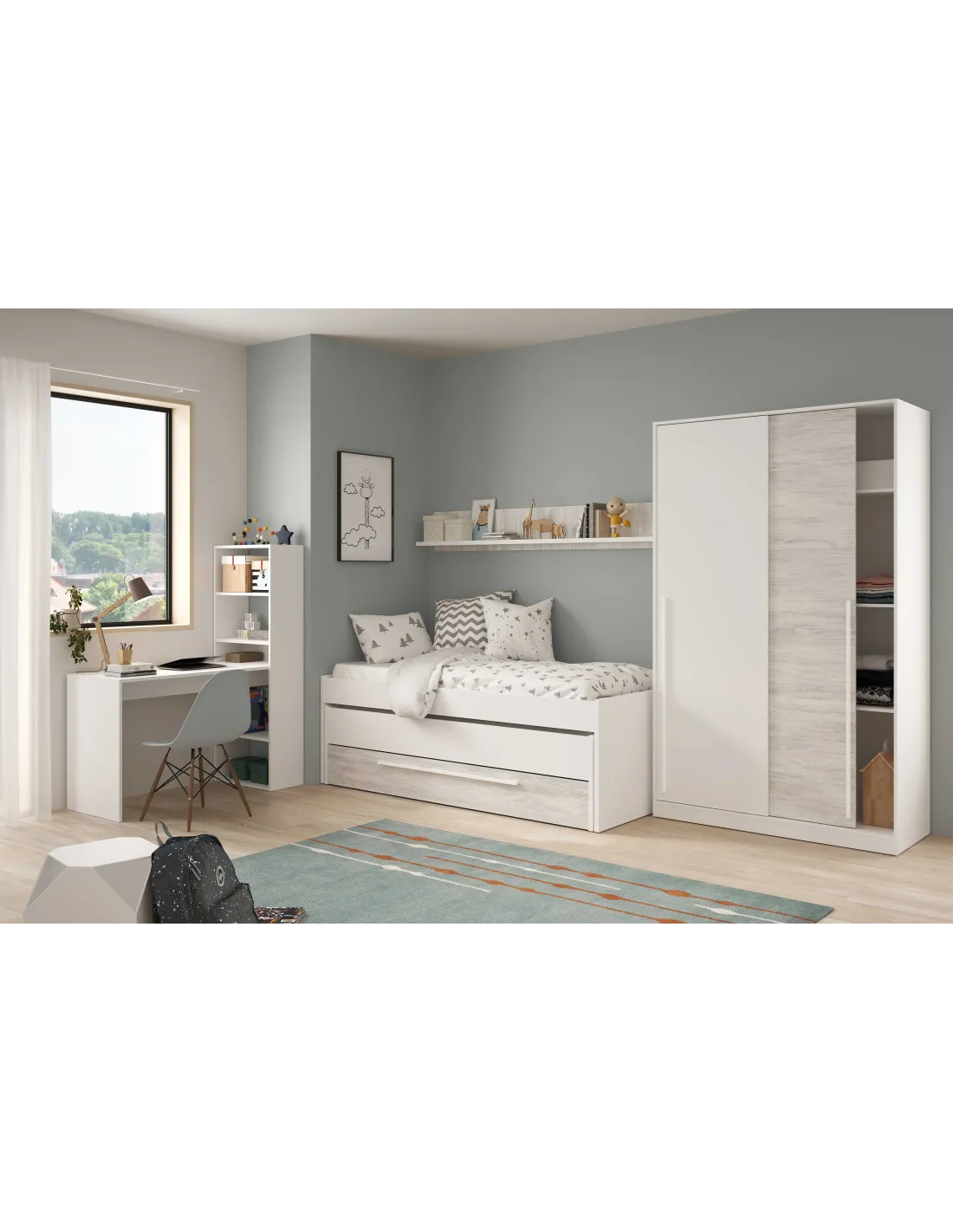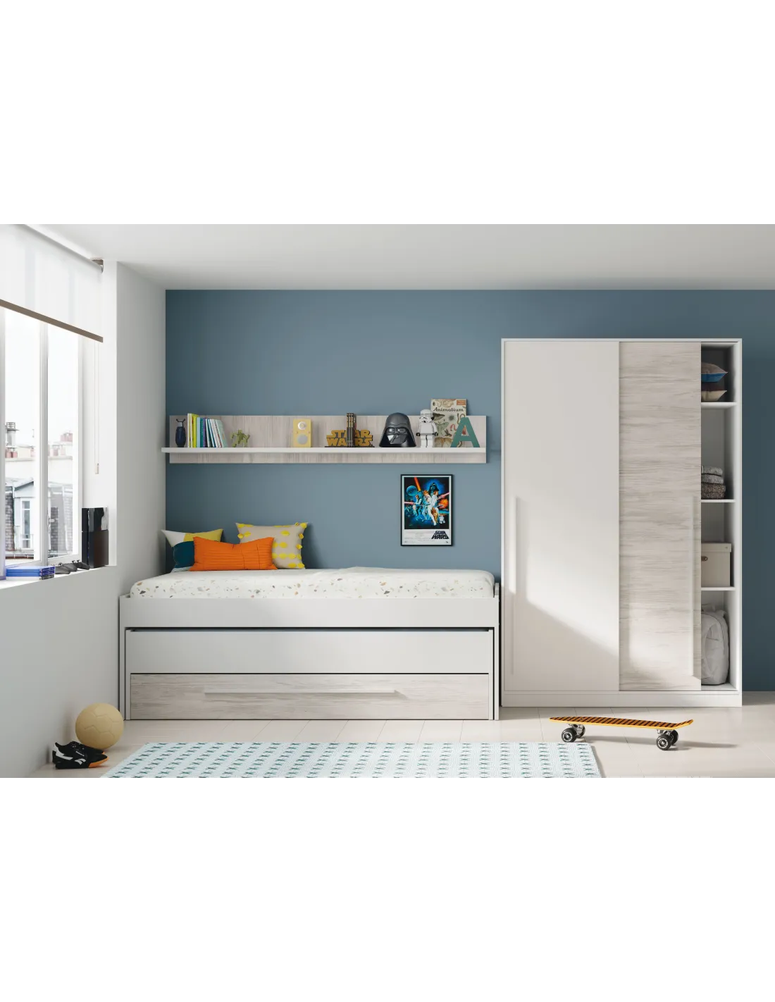 Cama doble diseñada para colchones de 190x90 (cama superior) y 180x90 (cama inferior). Incorpora un práctico cajón en la parte inferior del mueble y un estante de colgar para ampliar las opciones de almacenamiento.
