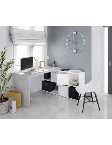 Escritorio con buc de 2 puertas y 4 huecos, diseñado para ofrecer una solución práctica y funcional en espacios de trabajo o estudio. Permite configurarse como mesa rinconera, adaptándose a diferentes distribuciones.