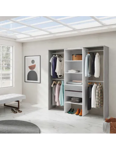Armario-vestidor con estantes, dos cajones y 4 barras de colgar.