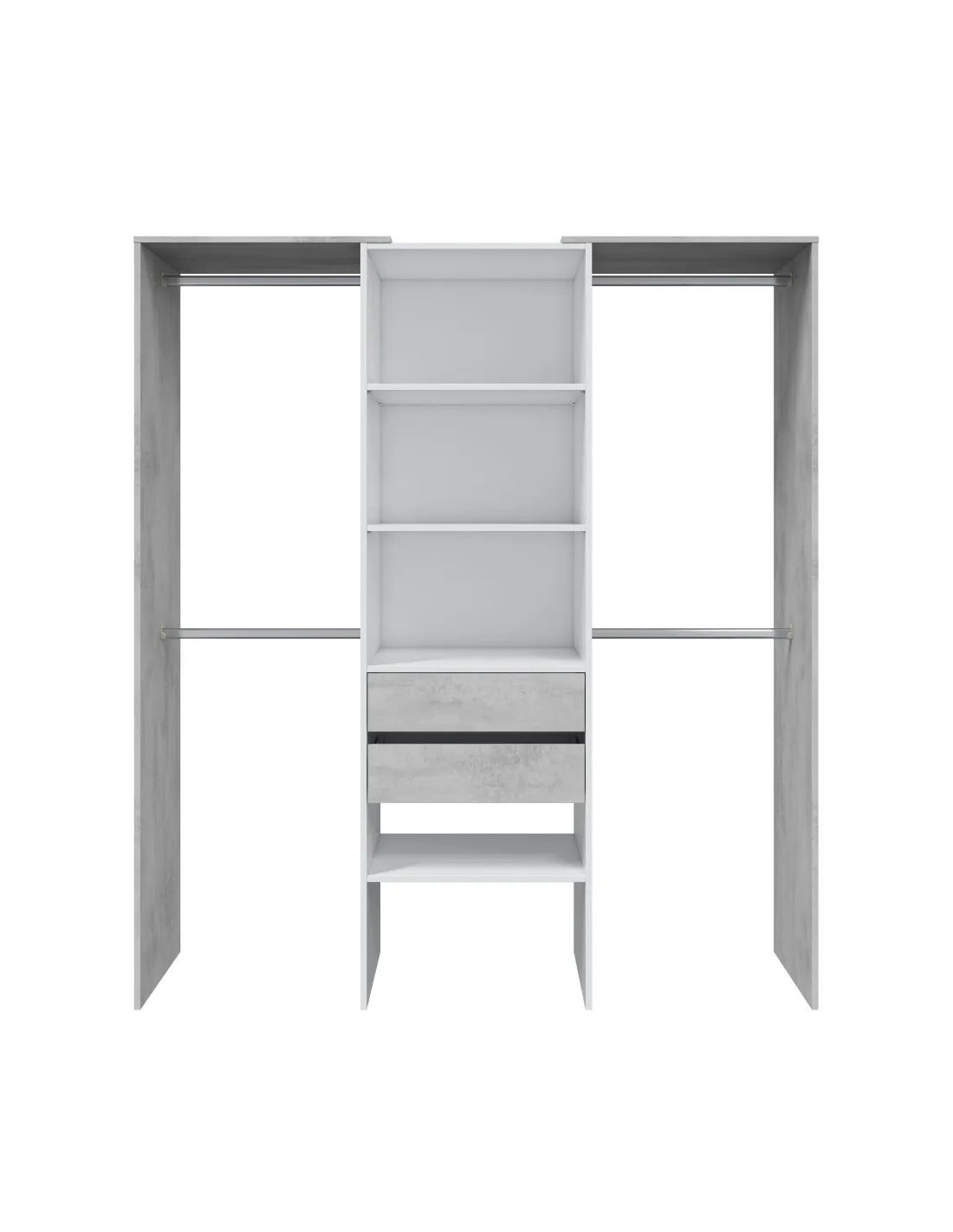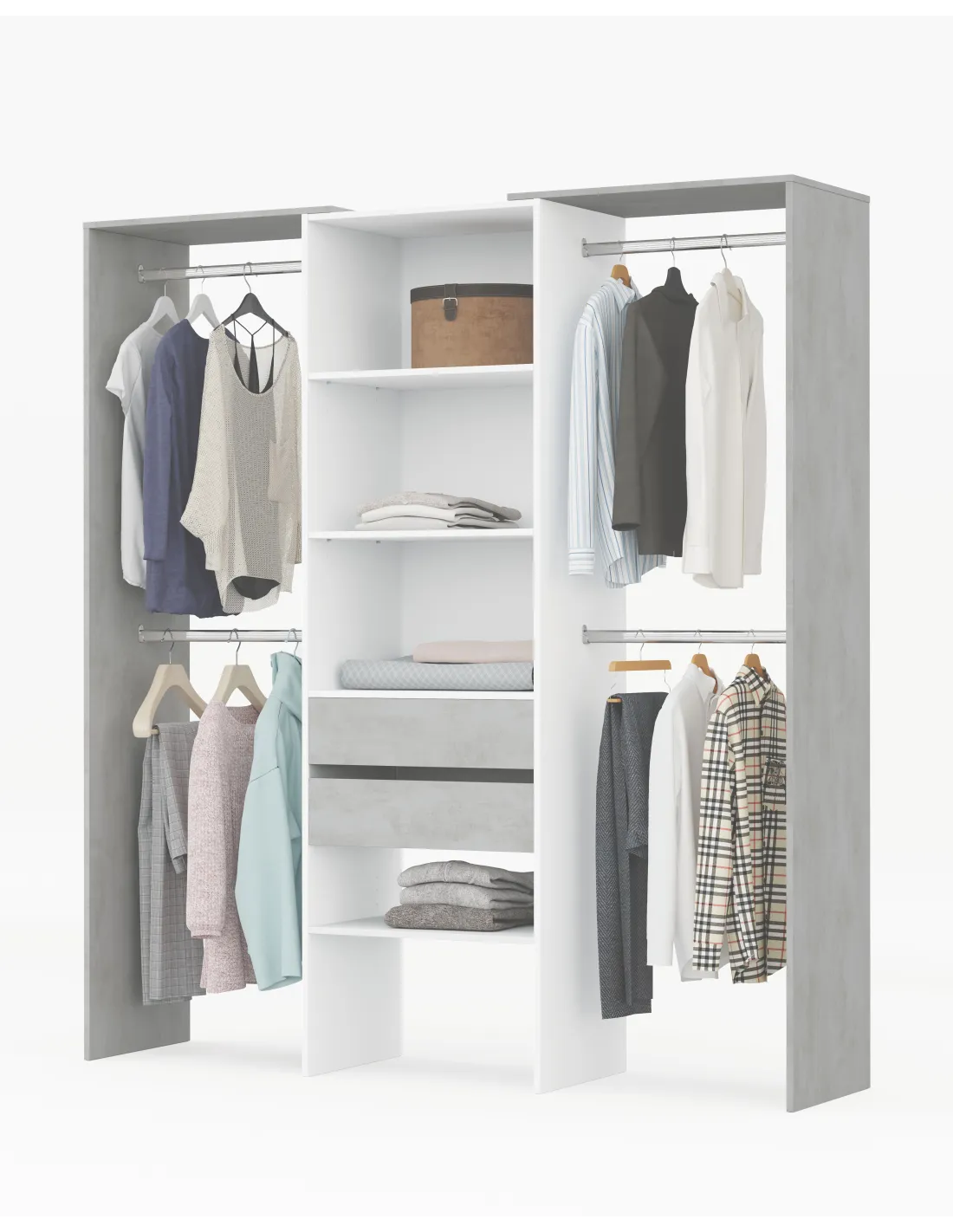 Armario-vestidor equipado con estantes, dos cajones y cuatro barras de colgar, ideal para organizar ropa y accesorios de forma práctica y funcional.