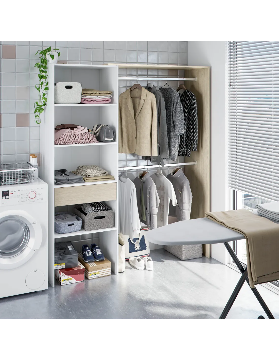 Dispone de guías correderas metálicas para el cajón, tacos ABS quitarruidos y antirayas para la parte inferior del mueble y soporte de estantes metálicos. Incorpora barra de colgar de aluminio extraíble y permite dos posiciones de montaje, pudiendo instalar la estantería a la derecha o a la izquierda. De los cuatro estantes, dos son regulables en altura.
