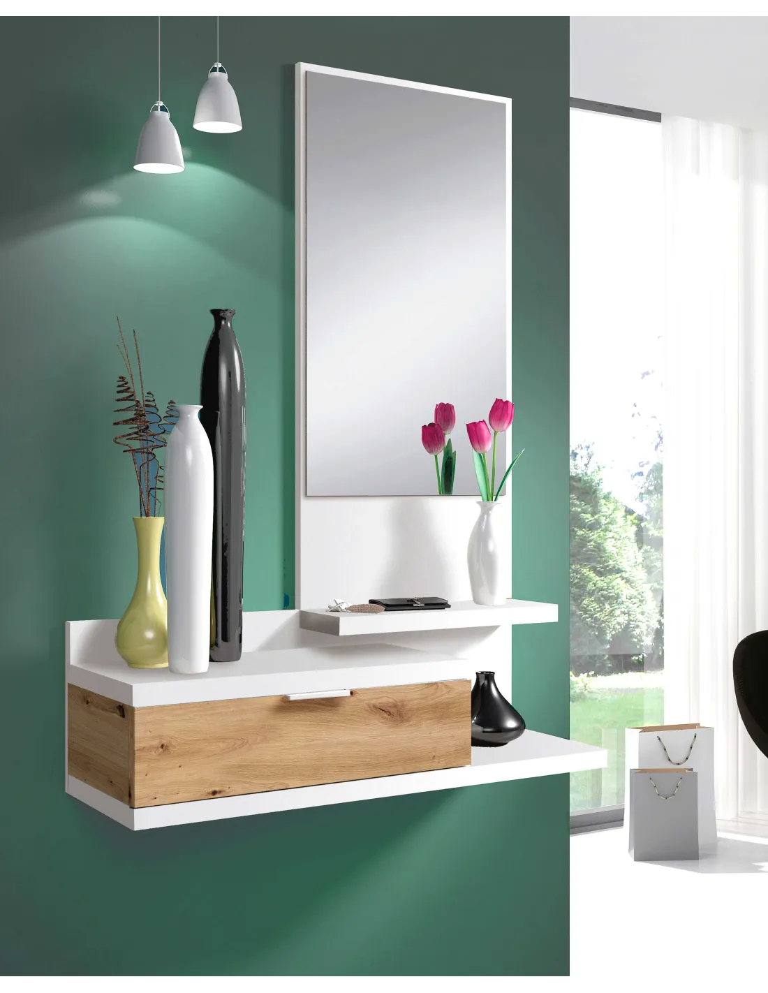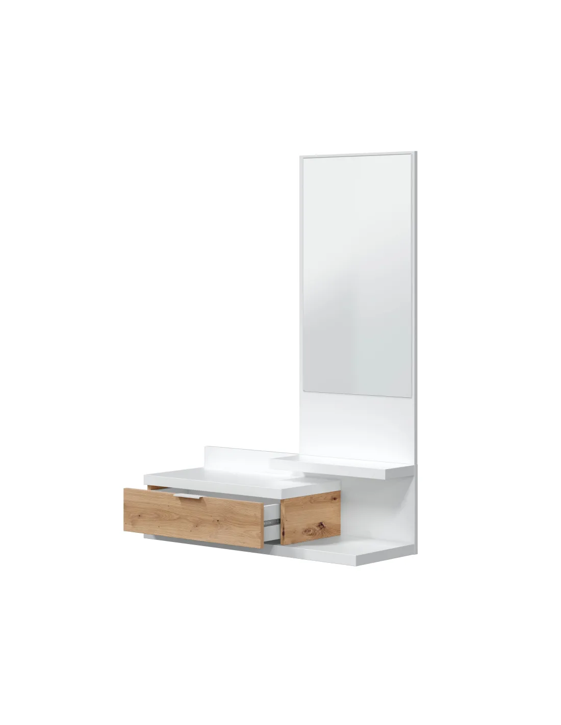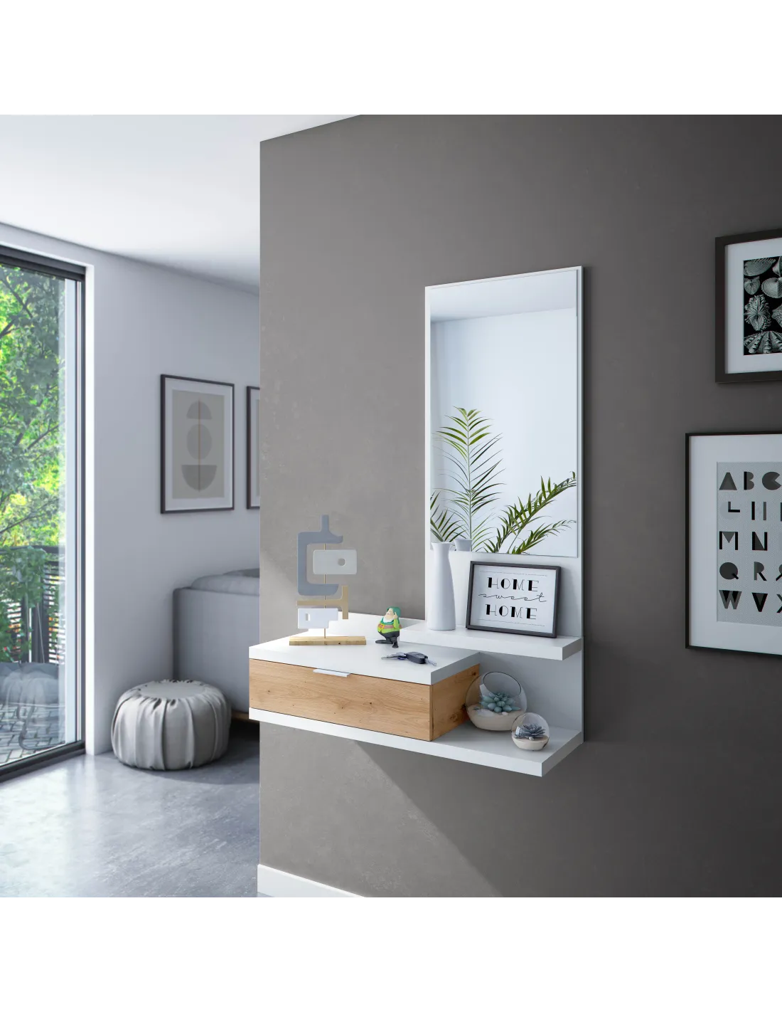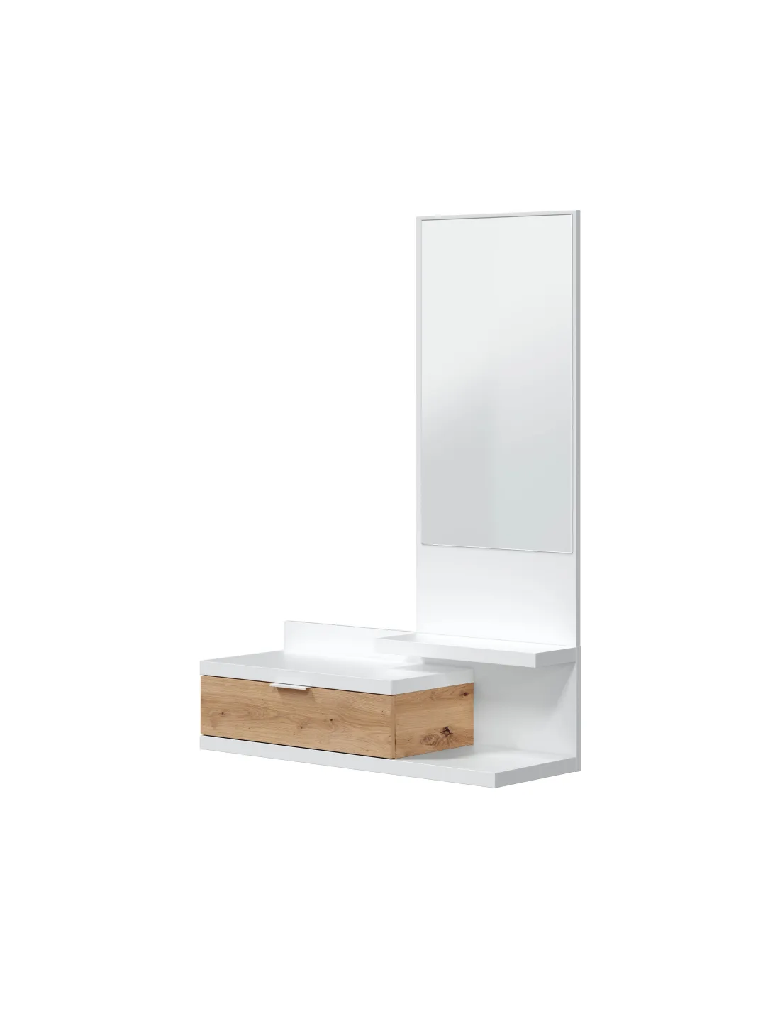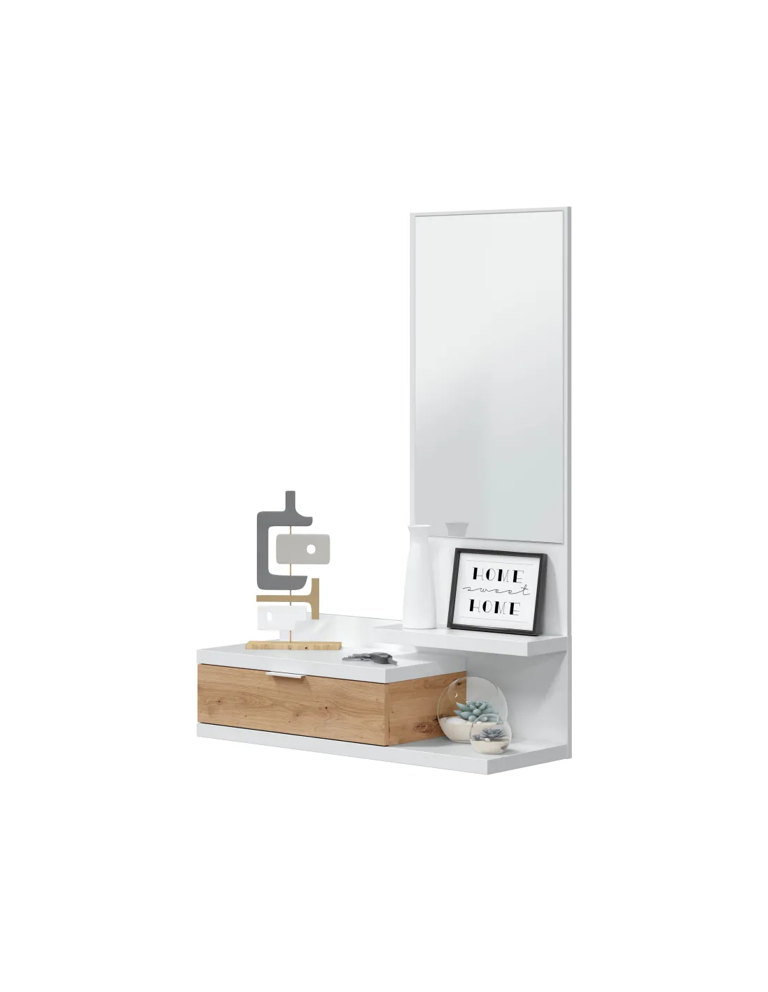 Recibidor funcional con cajón y espejo, ideal para completar la entrada del hogar con un diseño práctico y actual.