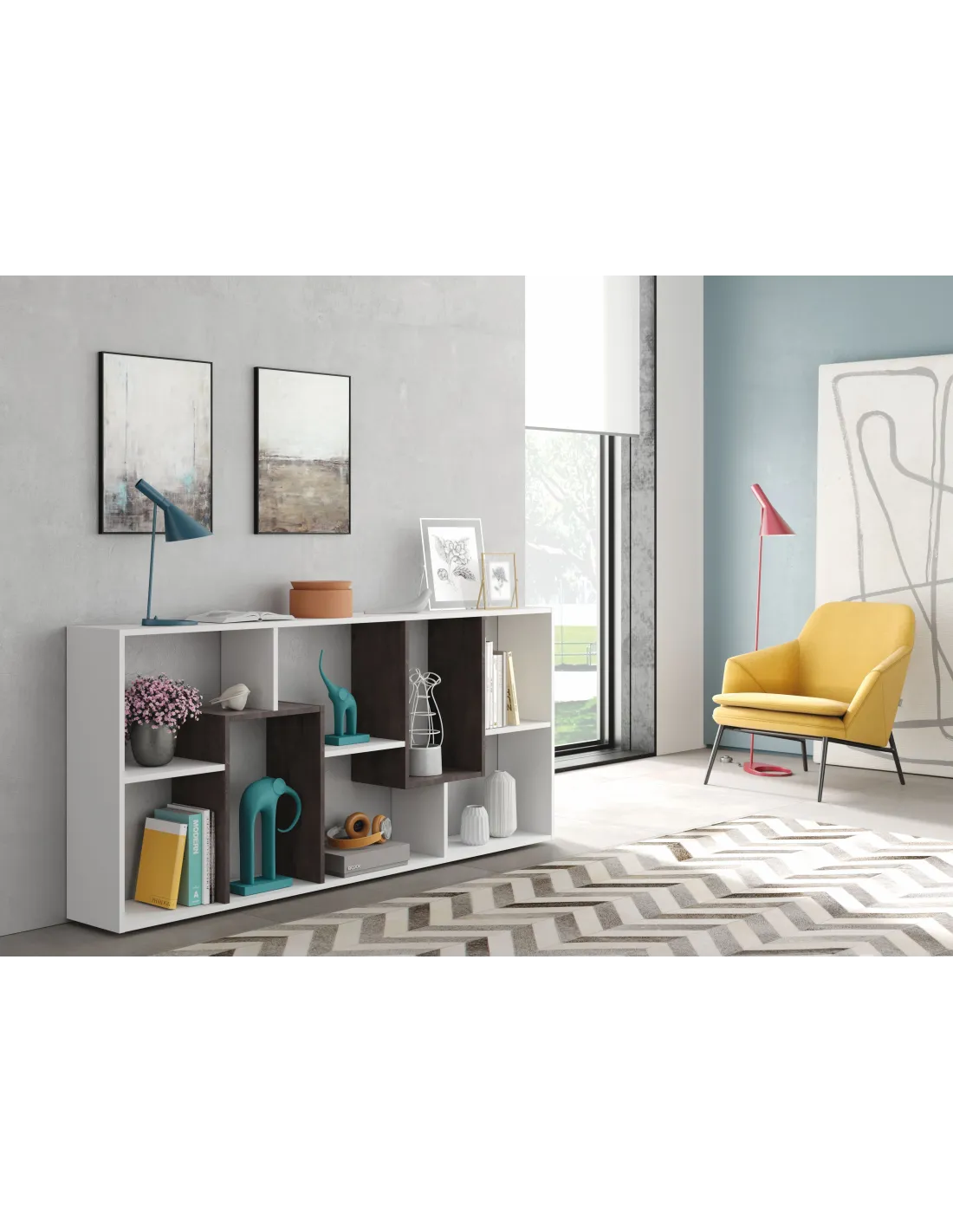 Los estantes no son regulables en altura. Puede utilizarse como separador de ambientes tomando las medidas oportunas, ya que existe posibilidad de volcado. Puede ir montada en vertical y/o horizontal, adaptándose a diferentes necesidades de espacio.