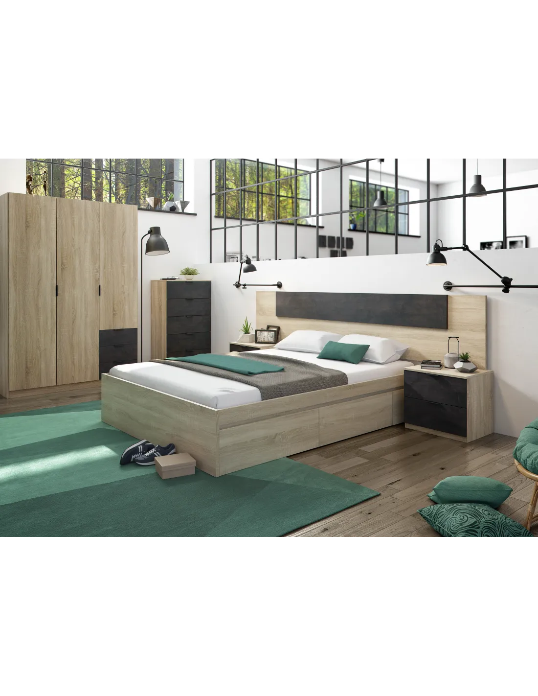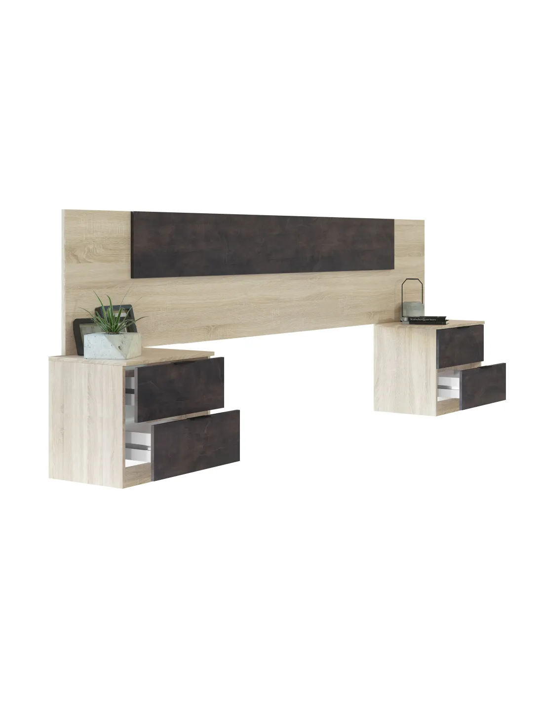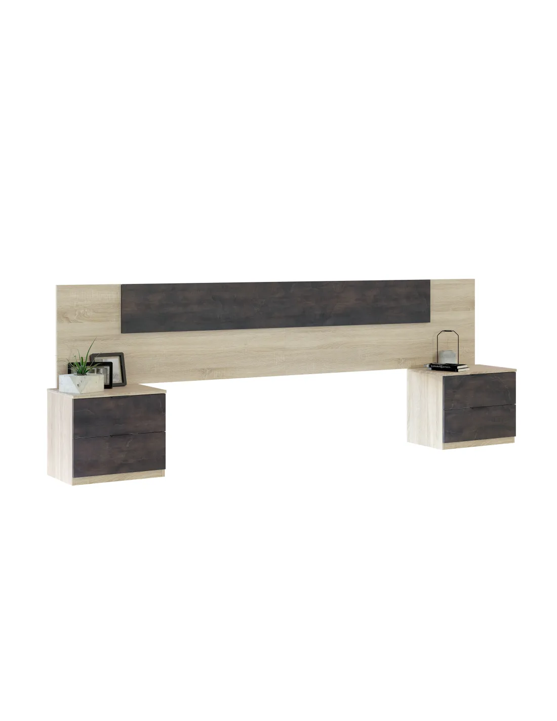 Conjunto compuesto por cabezal para cama de 150cm y dos mesitas, cada una con dos cajones, ideal para completar el dormitorio con un estilo moderno y funcional.