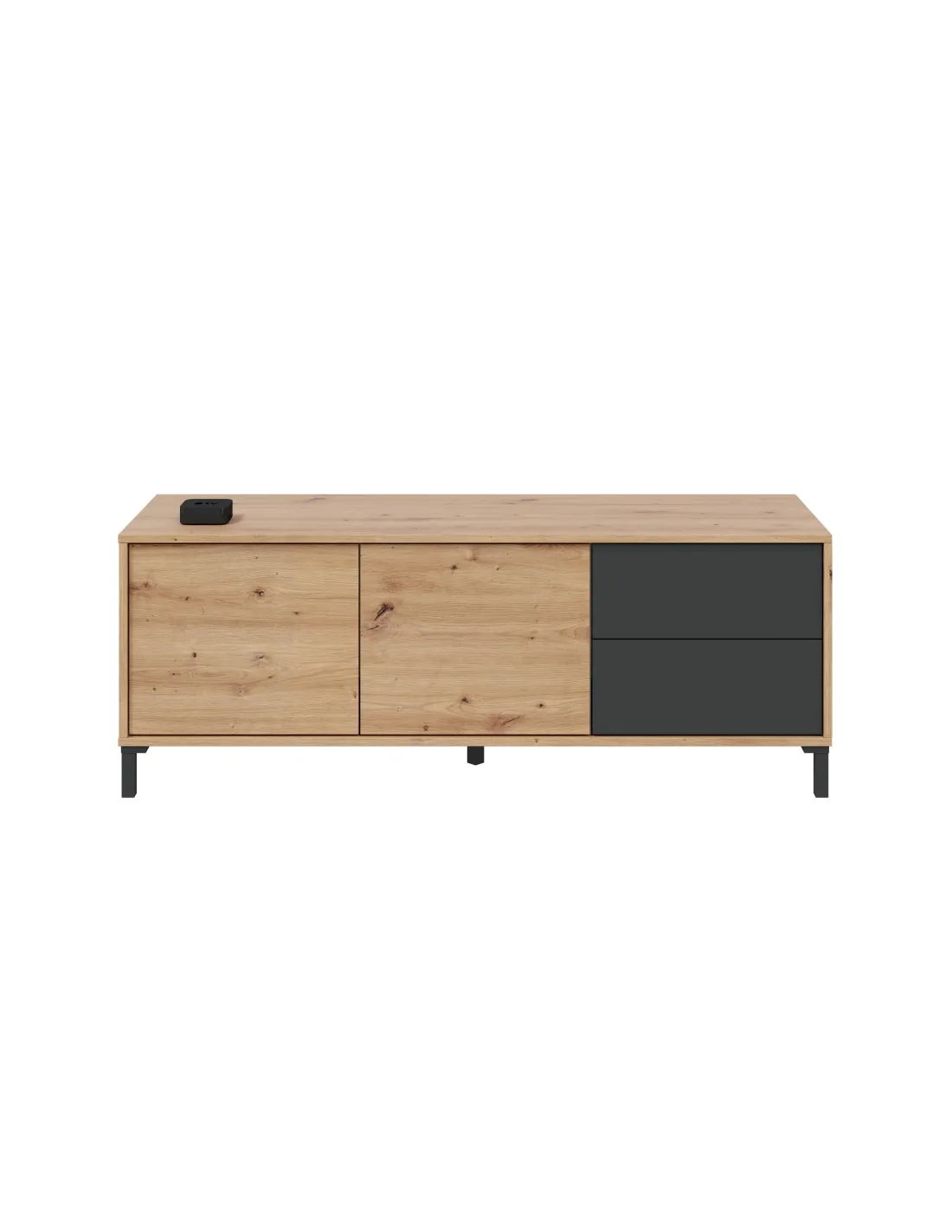 Mueble de televisión con 2 puertas y 2 cajones en la parte derecha, apoyado sobre patas, ideal para organizar dispositivos electrónicos y accesorios en el salón.