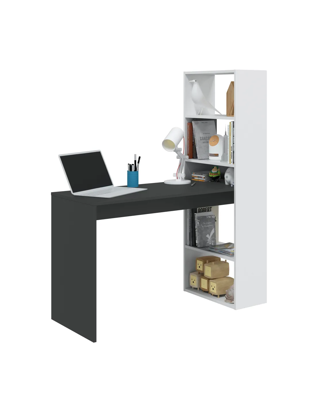 Mesa escritorio reversible con estantería de 5 huecos, ideal para zonas de estudio o trabajo, combinando superficie de apoyo y almacenamiento en un solo mueble.