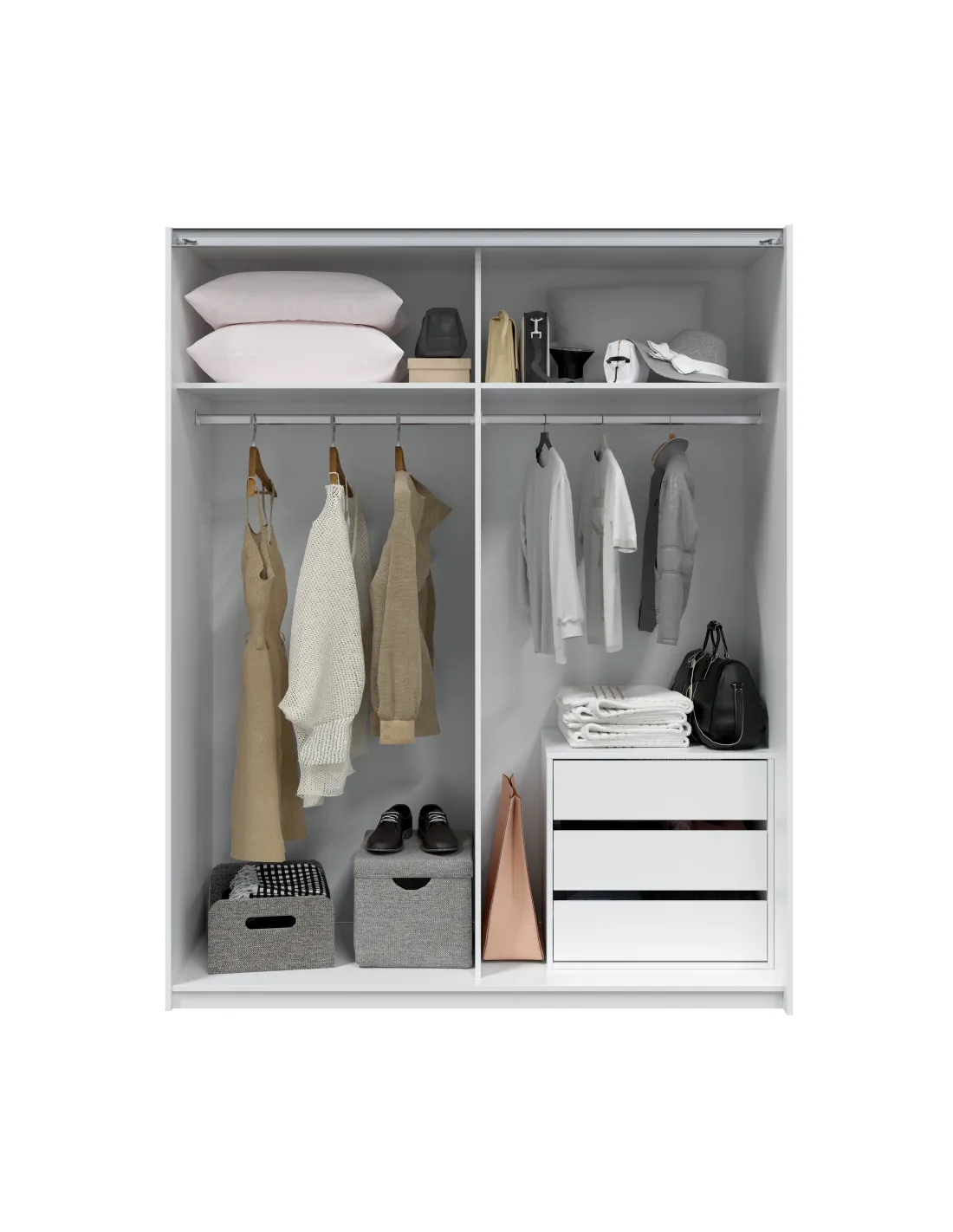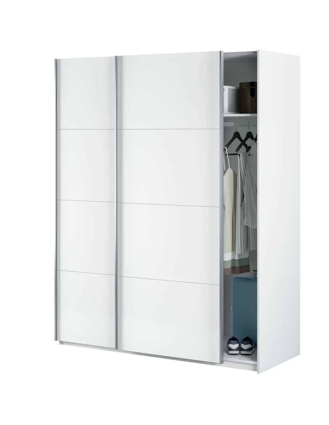 Incorpora barra de colgar de aluminio extraíble (2 unidades), guías correderas metálicas para las puertas con freno y tiradores de aluminio tipo perfil. Dispone de tacos ABS quitarruidos y antirayas para la parte inferior del mueble. El interior está acabado en blanco y los estantes son fijos en altura.