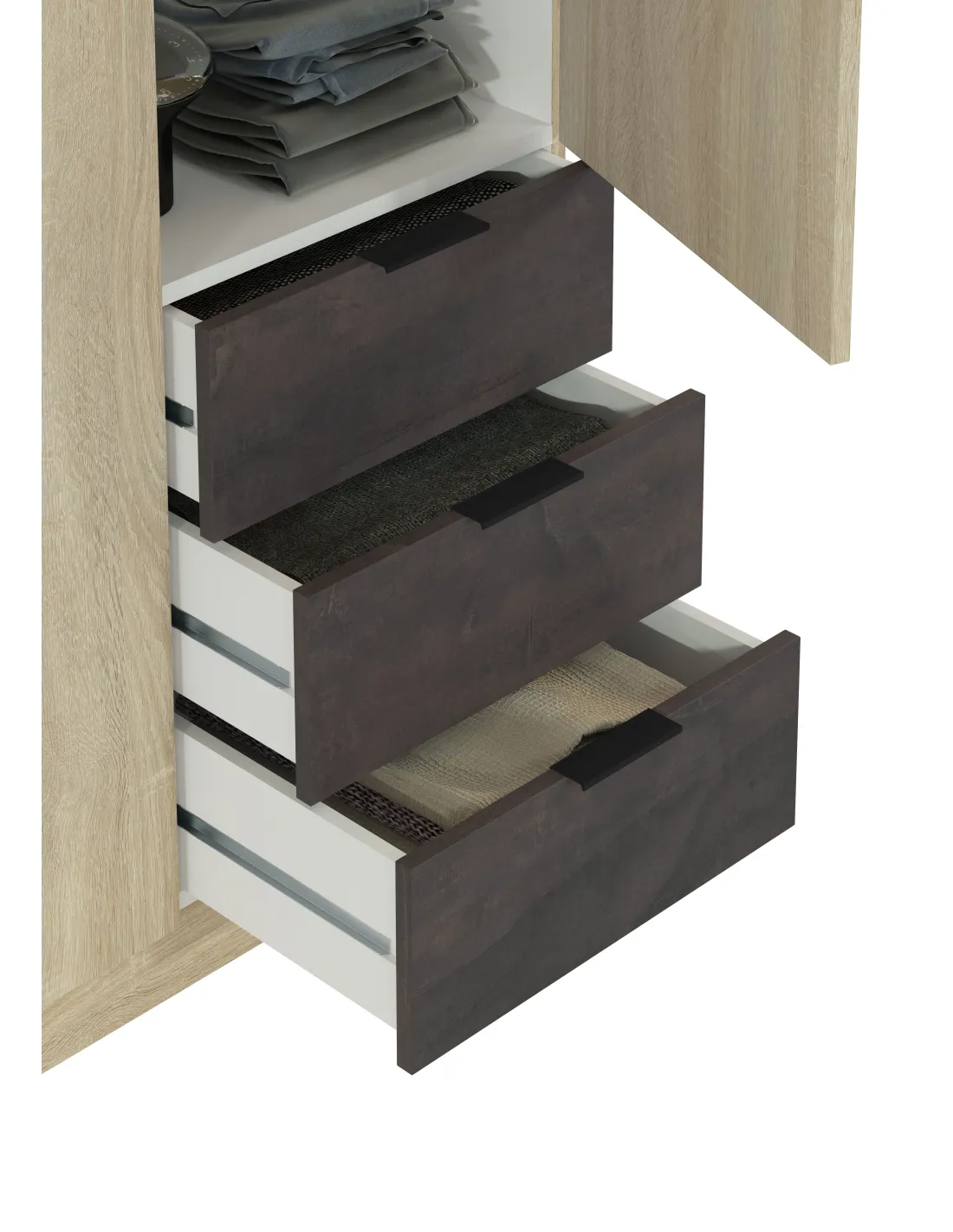 Armario de 3 puertas con barra de colgar de aluminio extraíble y estantes en su interior, acompañado de 3 cajones inferiores situados en la parte derecha, ideal para una organización completa del dormitorio.