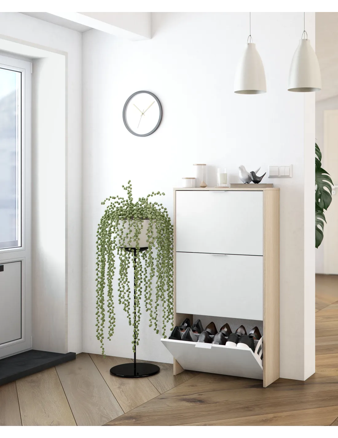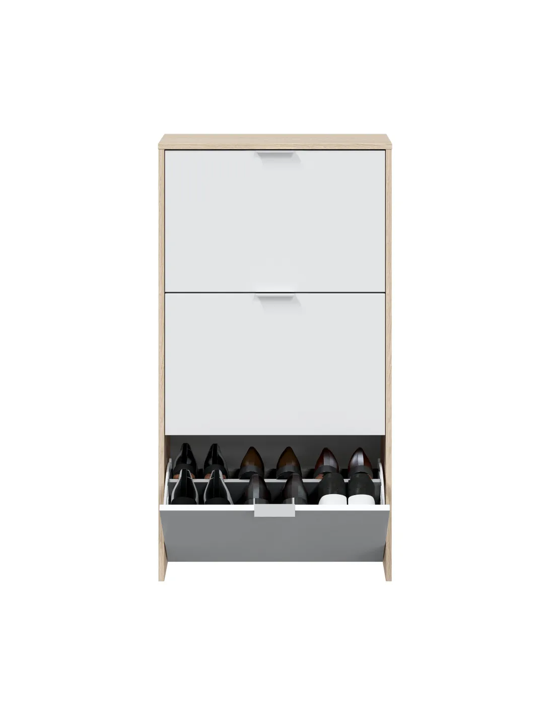 Zapatero de 3 puertas abatibles con capacidad de 18 pares de zapatos aproximadamente.